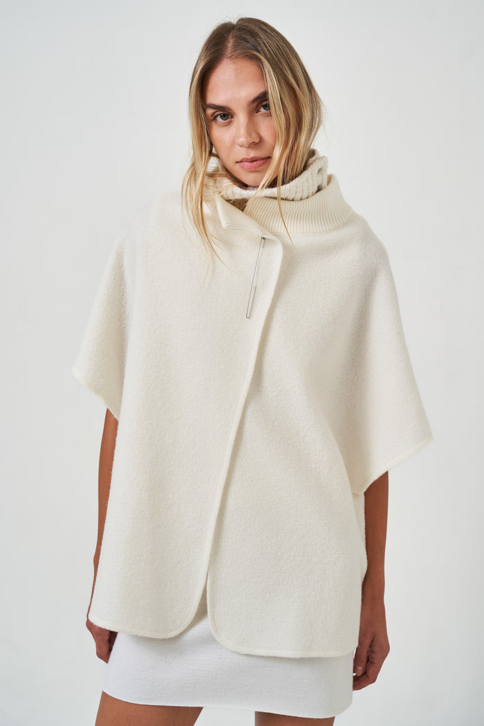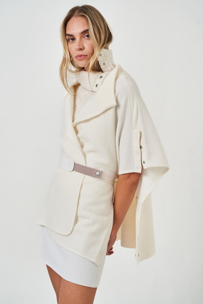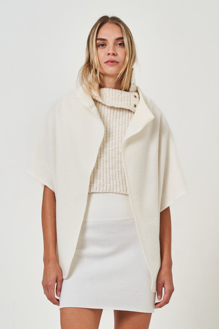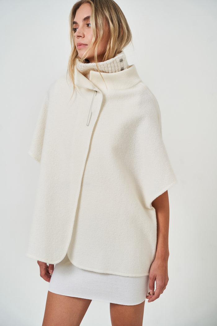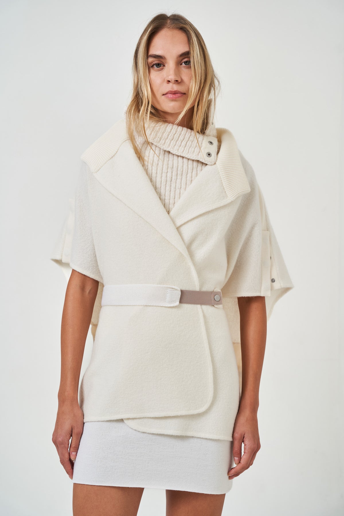 This Winter White Boiled Wool Convertible Cardigan offers versatile styling with its lightweight, warm fabric. Designed to be worn open or secured in front using the included signature safety pin, it adapts effortlessly to your look. Flip it upside down to reveal a unique cropped, cross-over silhouette, making it a sophisticated layering piece for cooler days.