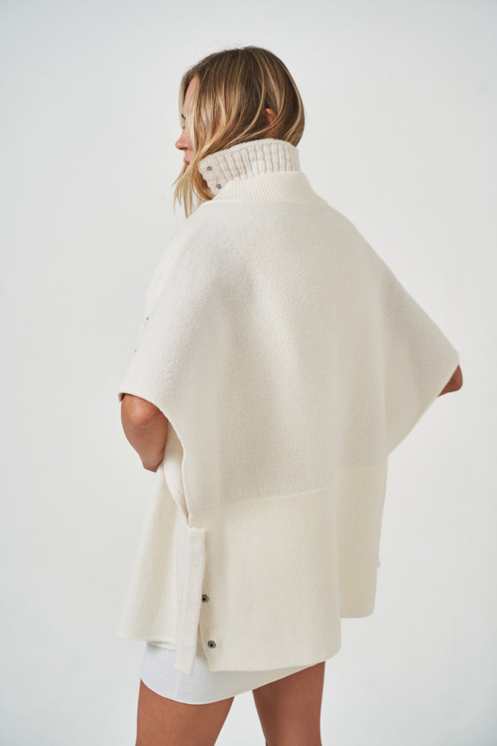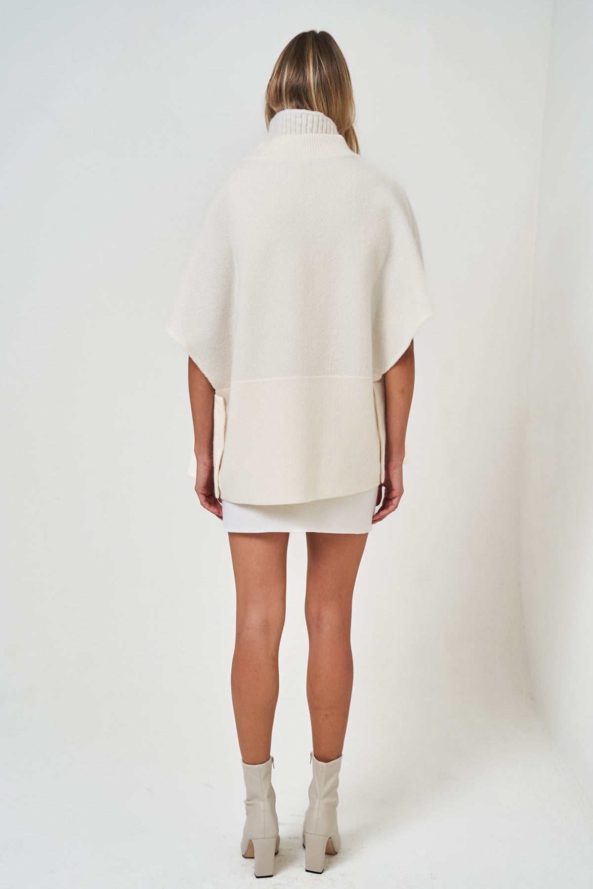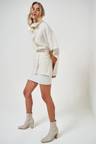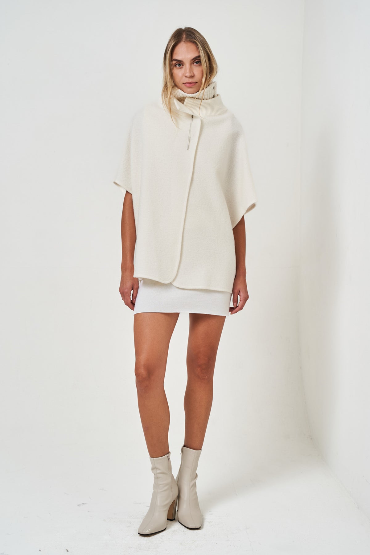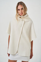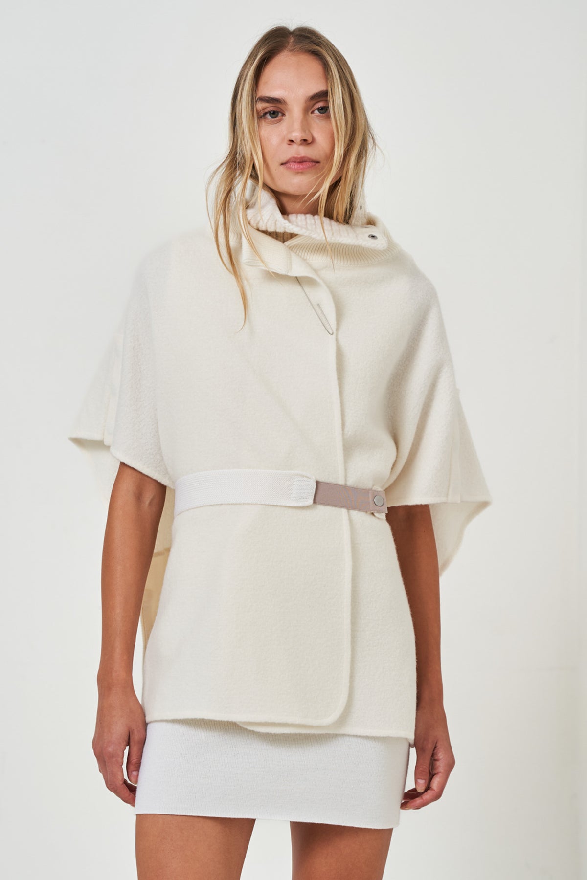This Winter White Boiled Wool Convertible Cardigan offers versatile styling with its lightweight, warm fabric. Designed to be worn open or secured in front using the included signature safety pin, it adapts effortlessly to your look. Flip it upside down to reveal a unique cropped, cross-over silhouette, making it a sophisticated layering piece for cooler days.