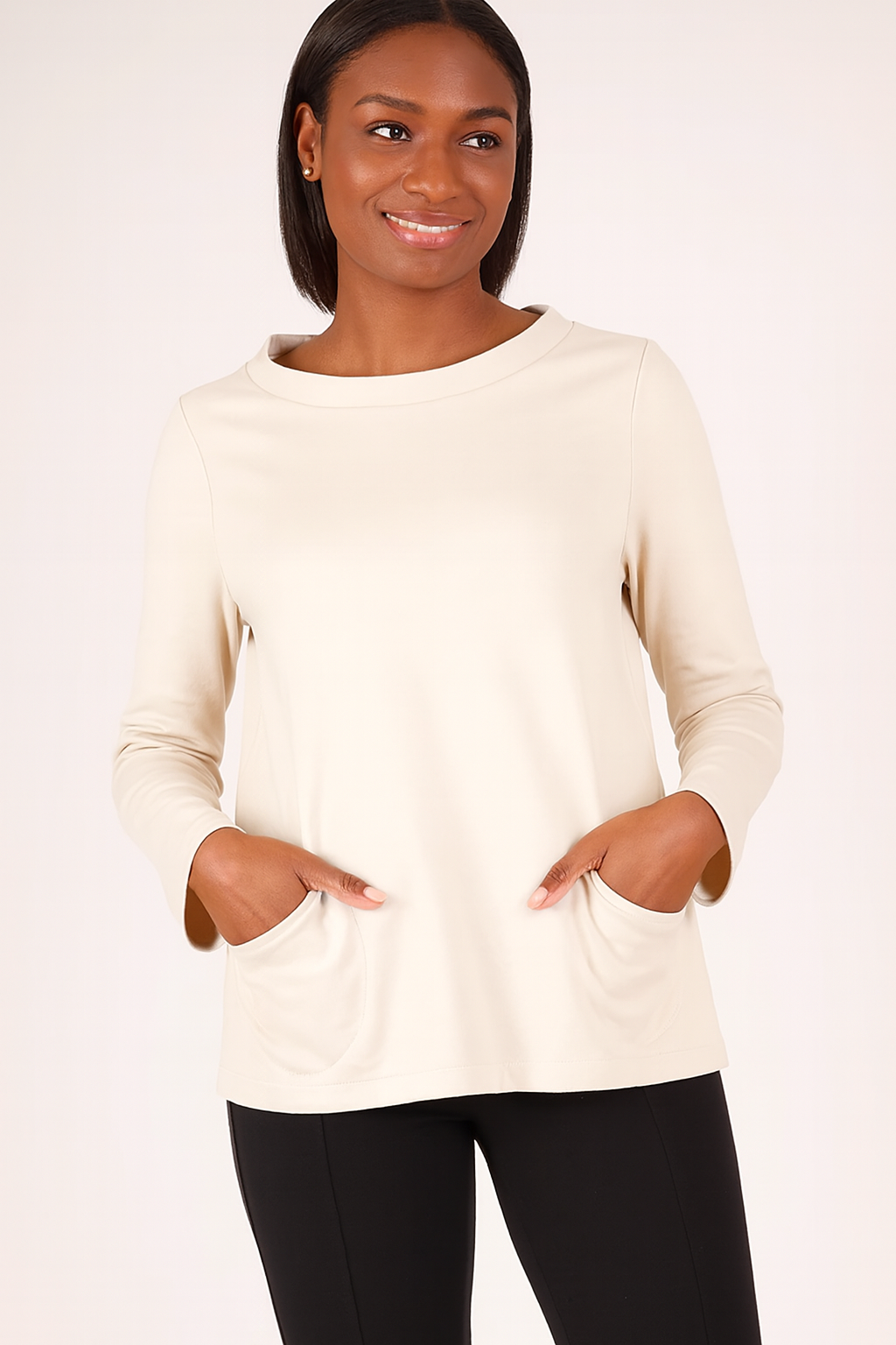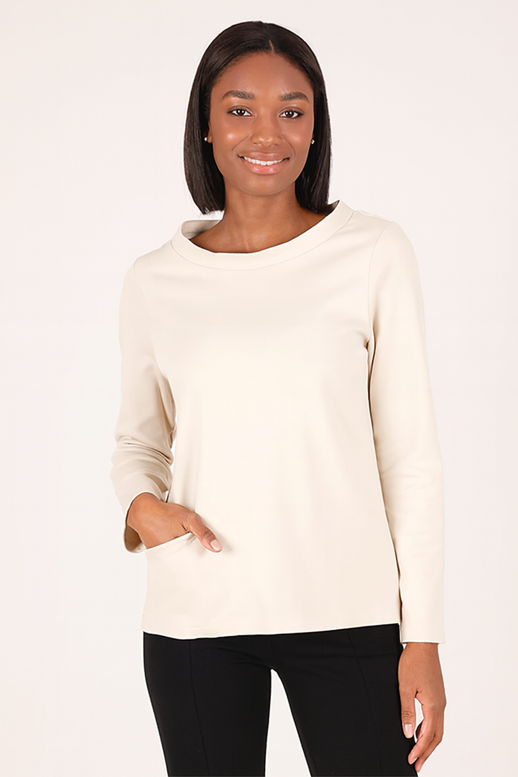 The Brogue Top combines structure and ease in a substantial ponte knit, delivering a tailored yet relaxed silhouette. Featuring a wide funnel neckline, set-in shoulders, and extra-long sleeves, it ensures both comfort and style. The full A-line shape is complemented by functional front patch pockets, enhancing practicality without compromising design. True to Porto sizing, this top is a refined choice for a sophisticated, contemporary wardrobe.