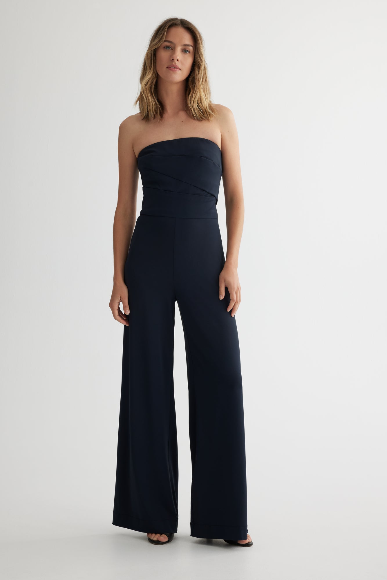 This bustier jumpsuit, crafted from classic matte jersey fabric, combines sophistication with comfort. Its elegantly draped bustier enhances the silhouette, while wide legs offer a flattering, modern fit. Pair it with a tailored jacket to create a polished look suitable for professional settings. Ideal for transitioning seamlessly from day to evening wear.