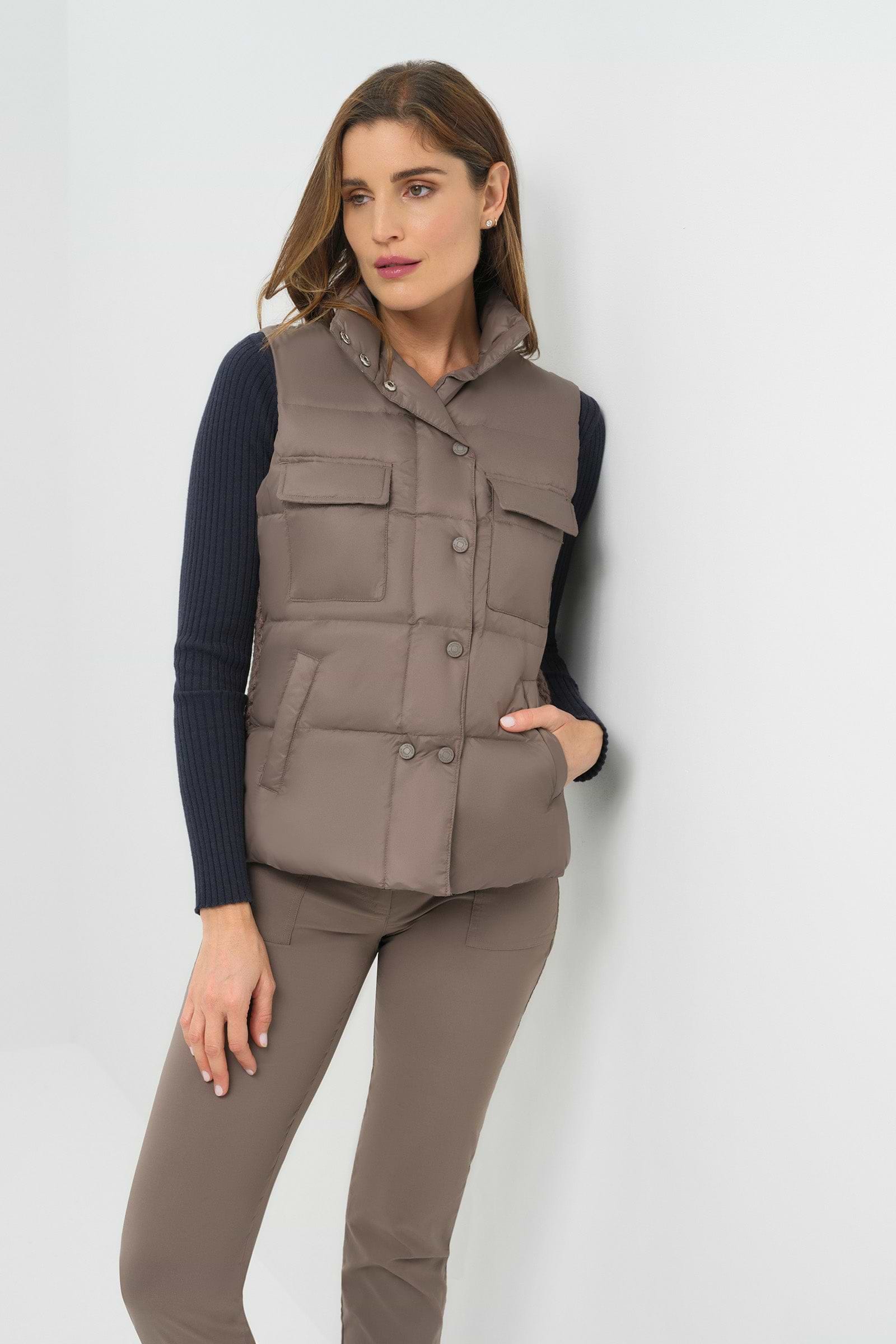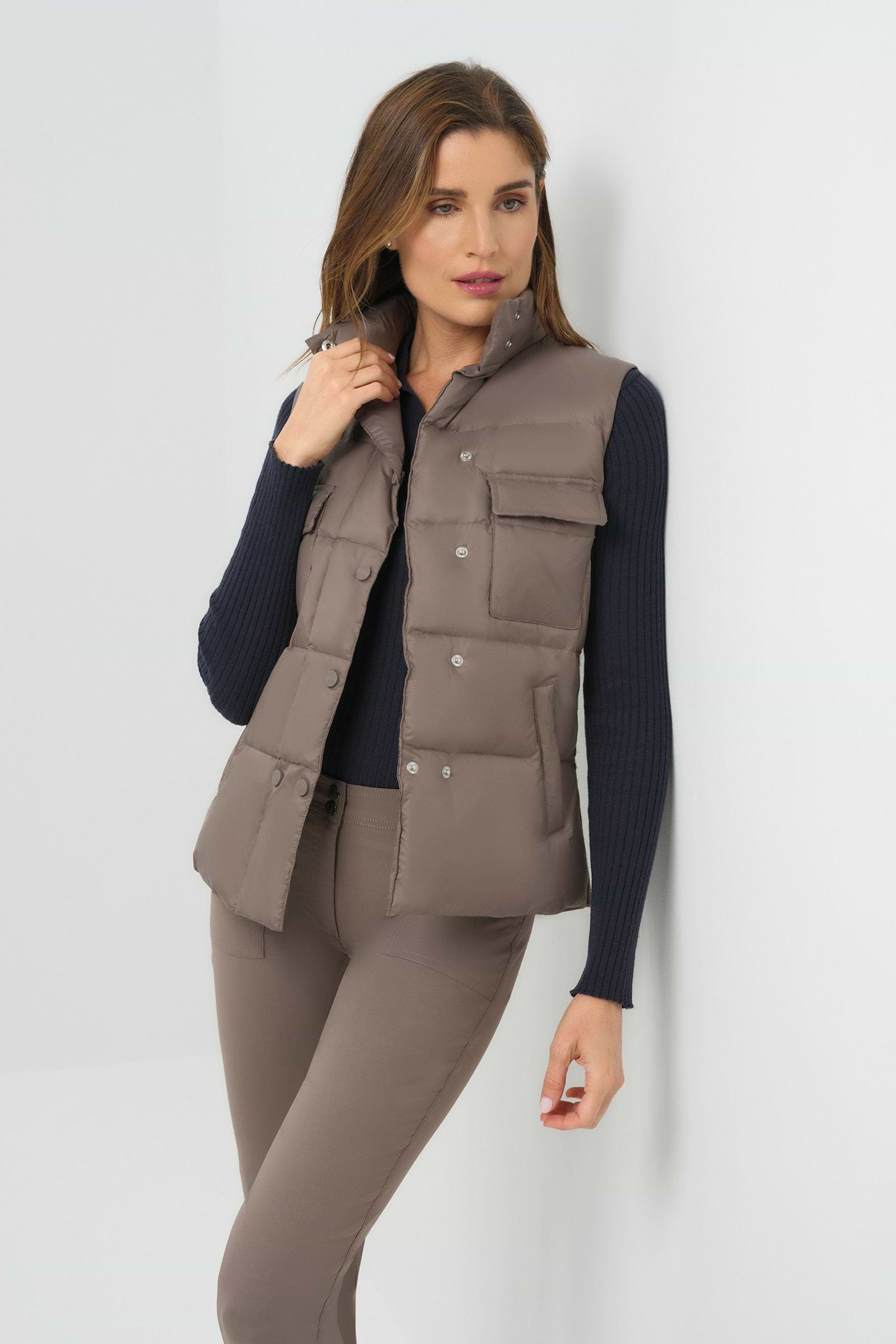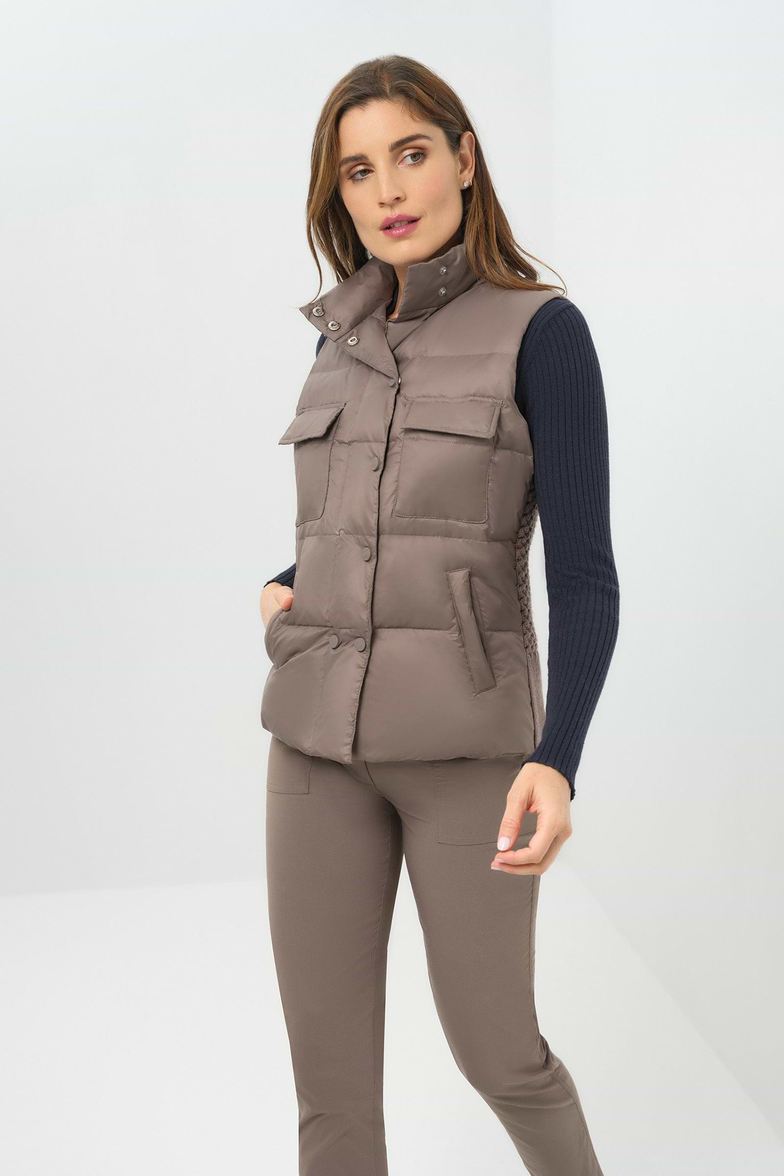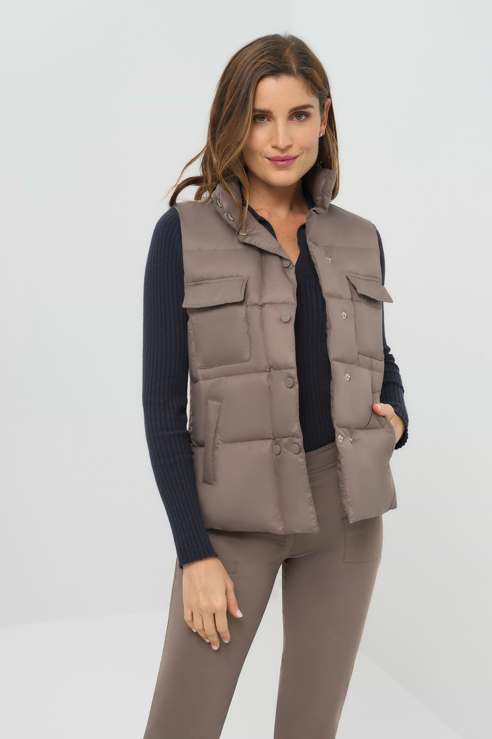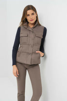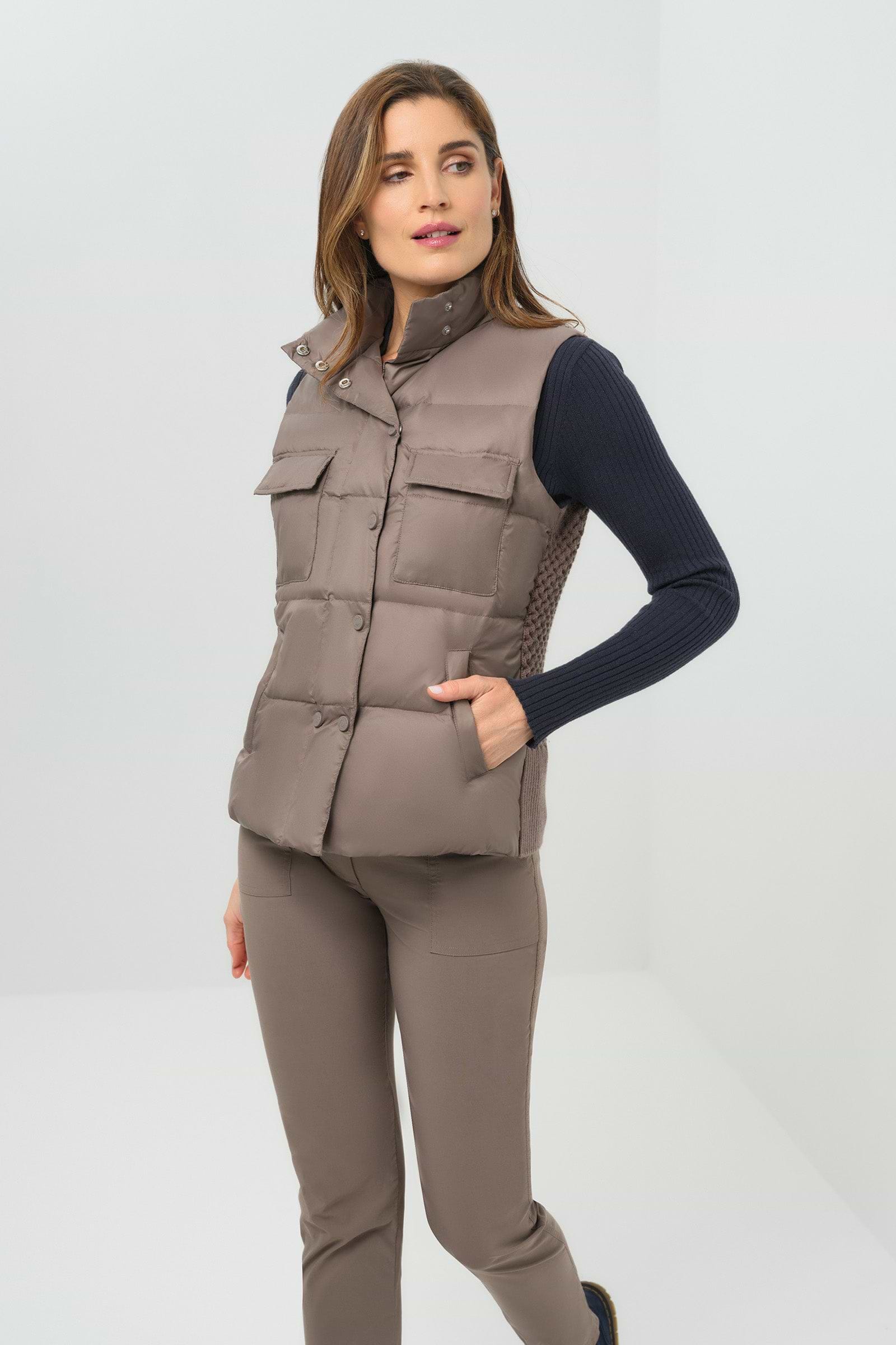 The Fallon Vest offers a sophisticated blend of modern and classic styles with its quilted puffer front and cable-knit sweater back. Designed for transitional weather, this versatile piece features a high collar, snap-front closure, and multiple pockets for practical storage. Ideal for layering over any top or sweater, it provides both warmth and a polished look, making it a reliable staple for your wardrobe through changing seasons and outdoor activities.