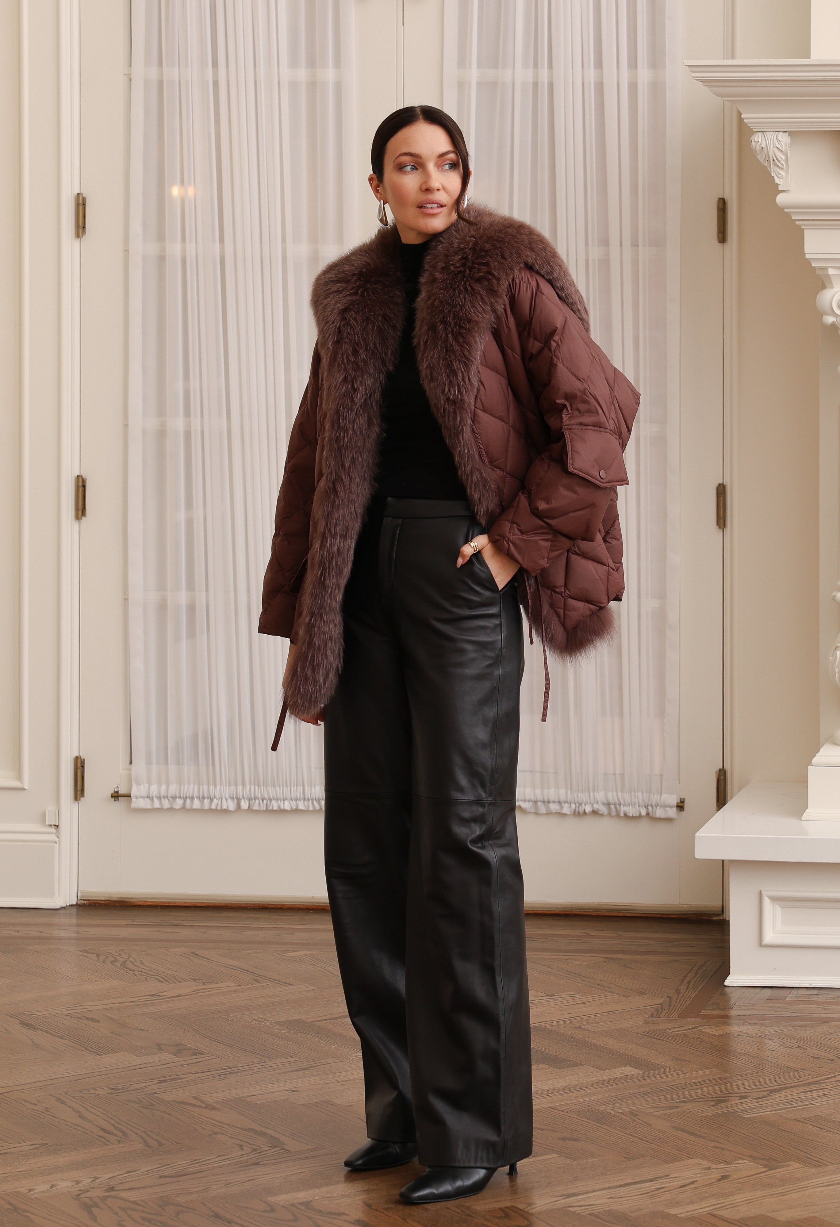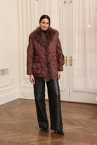 Nylon Sailor Coat with Fox Fur in Chocolate