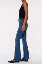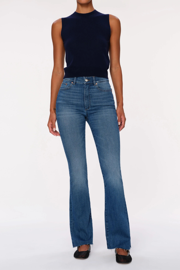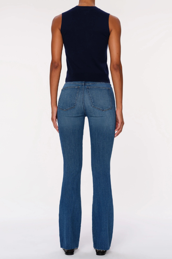 The Bridget boot cut delivers a high-rise silhouette with a 31.5" inseam tailored for extended proportions. Instasculpt™ technology works to smooth and sculpt while conforming precisely to your frame. Palm Springs presents a luminous mid-indigo base with subtle worn-in fading for understated character. Finished with a silver shank, copper rivets, multi-colored stitching, raw hem, and ecru back patch, this style merges functional innovation with refined denim detailing.