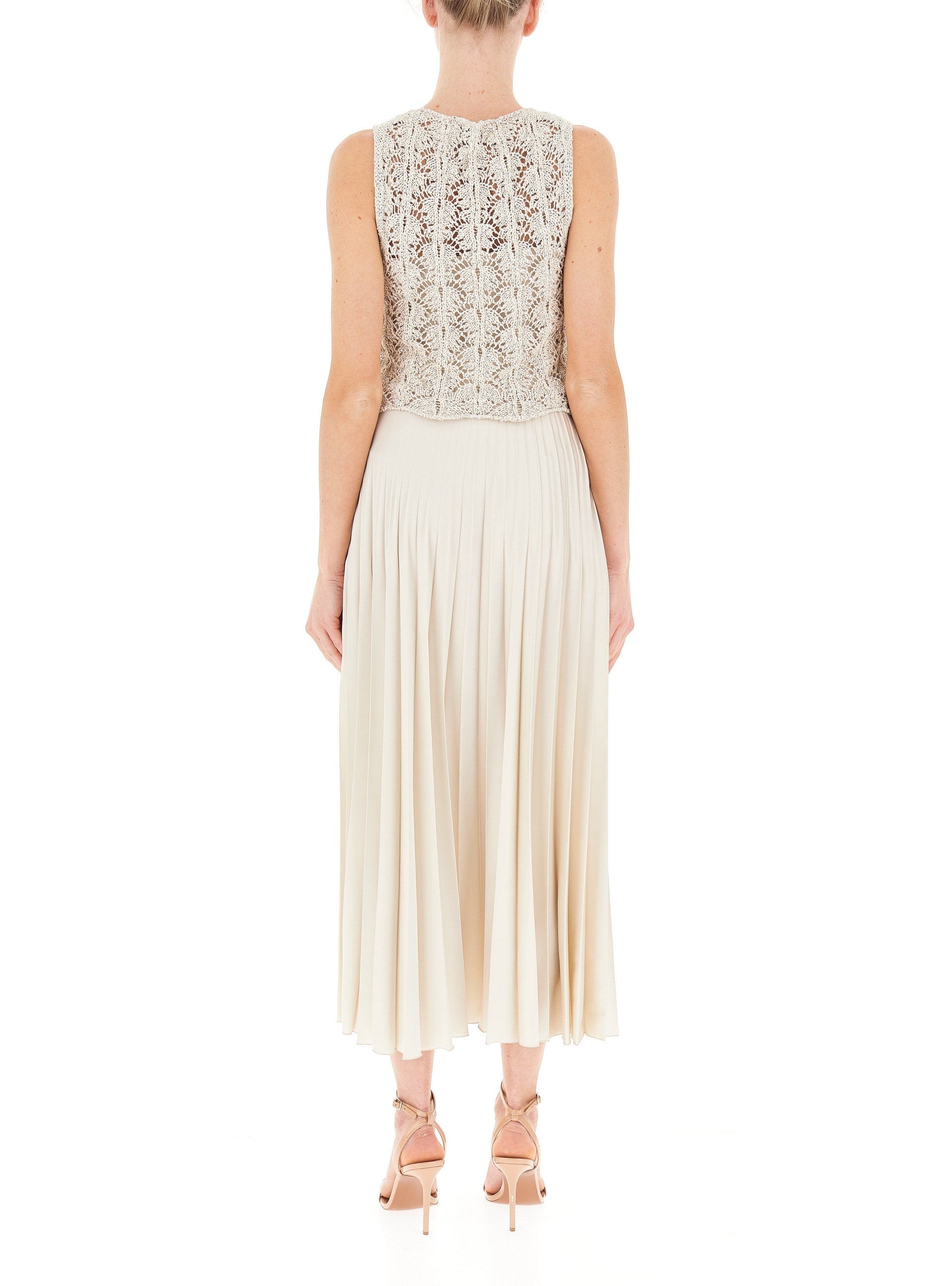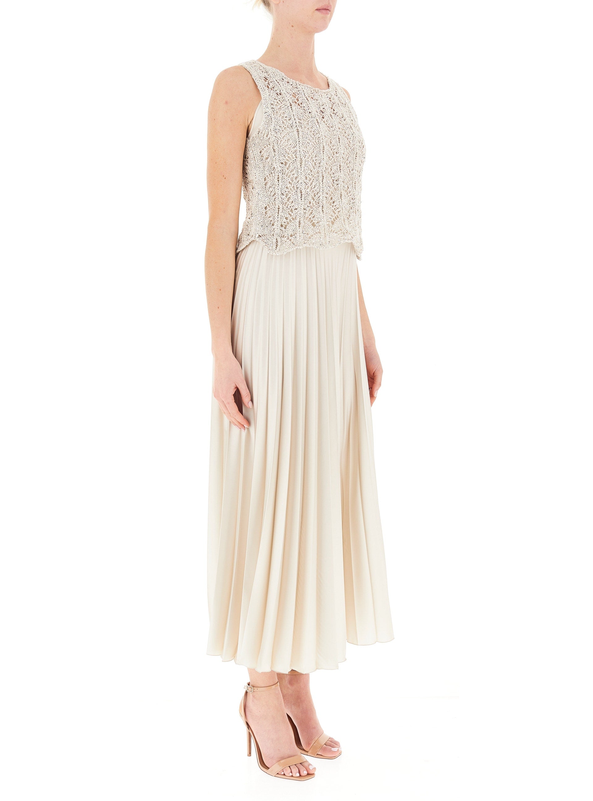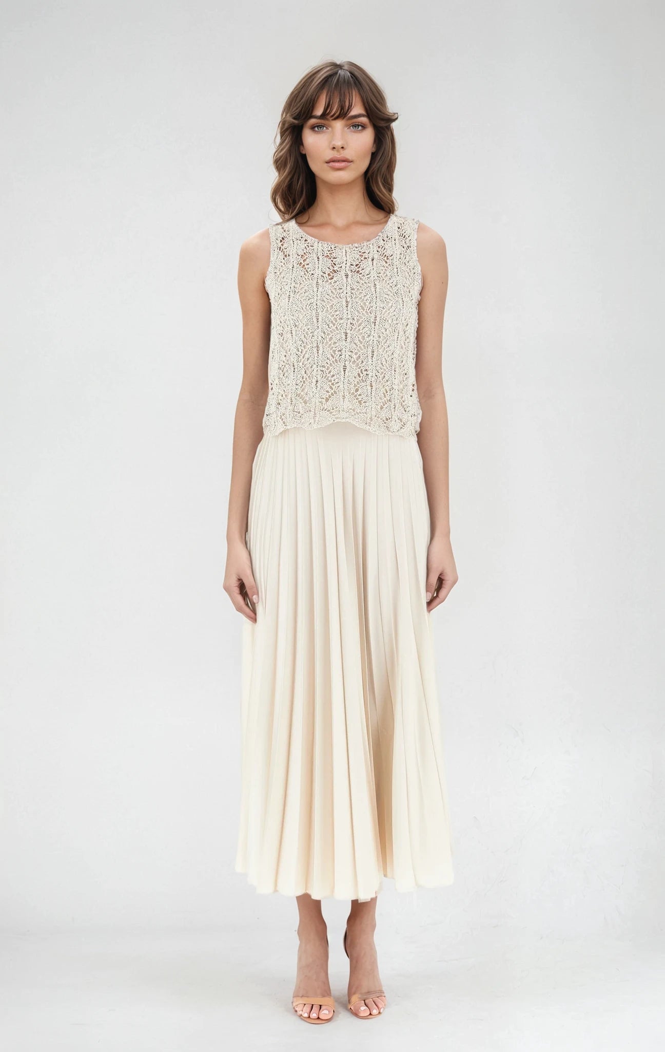 This stunning long satin dress in champagne exudes elegance and playfulness. The slip dress neckline and thin straps accentuate your figure, while the pleated flared skirt adds a whimsical touch.