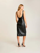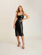 The Faux Leather Midi Tank Dress is crafted from our best-selling faux leather, offering four-way stretch and the supple look and feel of real leather. Designed to fall below the knee, it features a daring front slit and an open low back for a sleek, sultry silhouette. Machine washable for ease, it’s the statement dress you’ll never want to take off.