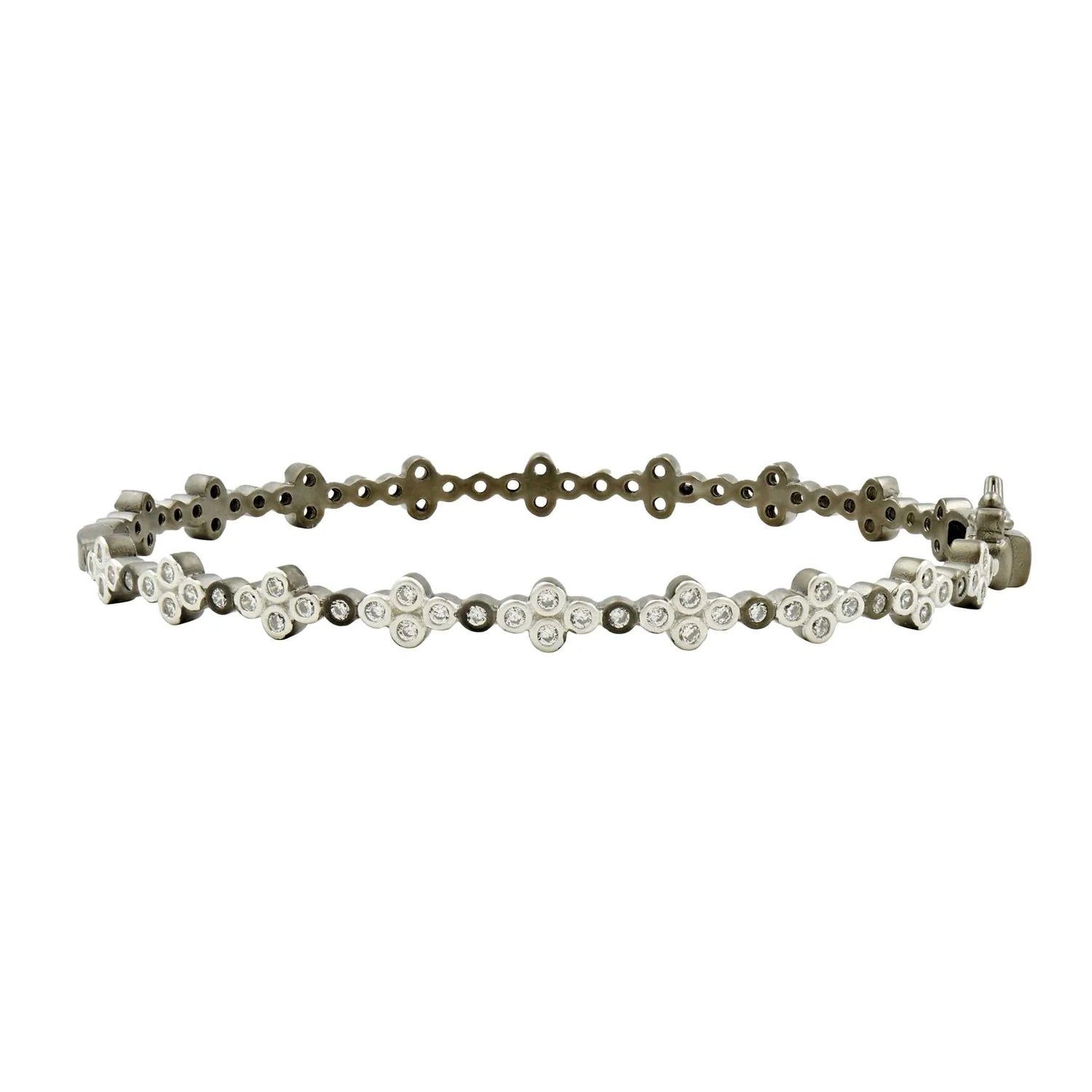 Start your stack with this delicate shimmering hinge bangle, designed to sparkle. Signature matte gold and handset pavé stones pop with iconic clovers. Dress yourself in love and let the light in.
