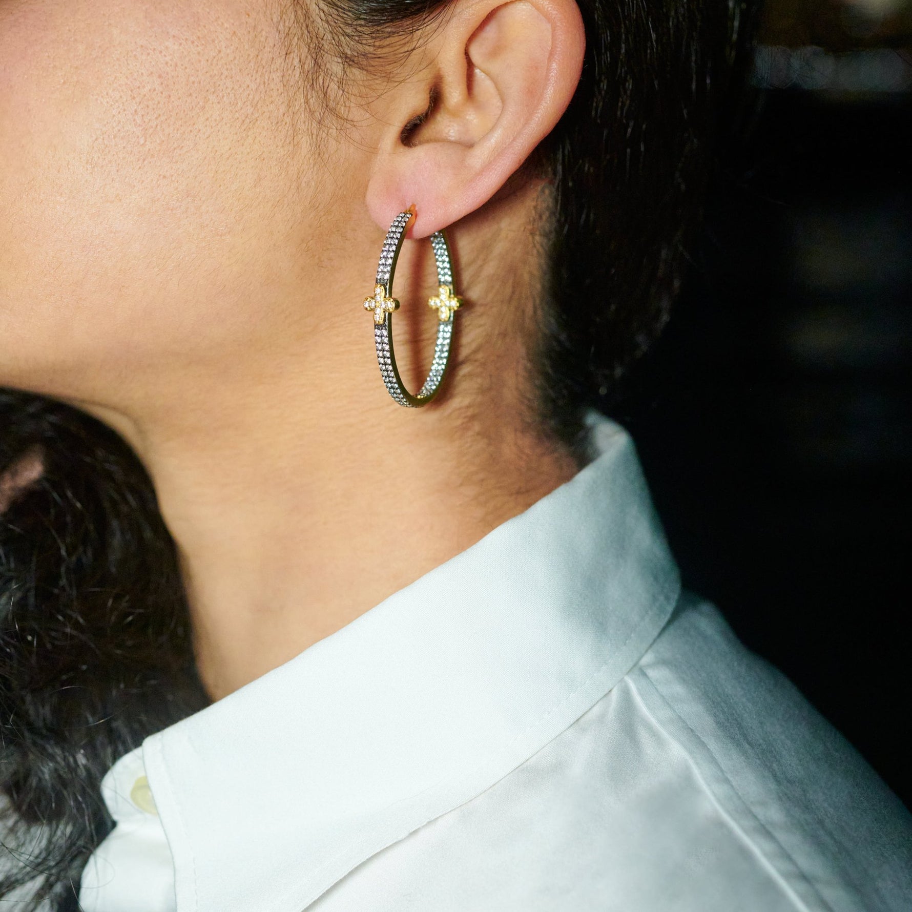 Pavé Double Row Clover Hoop Earrings - Gold and Silver
