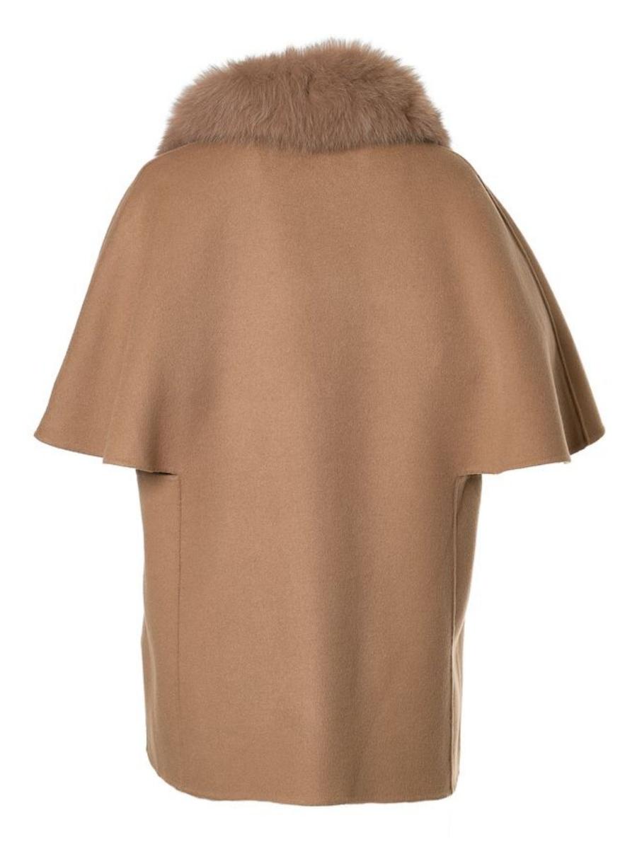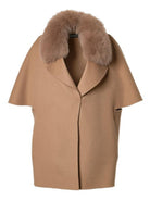 This short coat is crafted from luxurious unlined double-sided cashmere wool. It features a cape-inspired design, characterized by a wide and enveloping silhouette, elbow-length roll-back kimono sleeves, a lapel collar, and side inset pockets. Additionally, it includes a detachable fox collar for added versatility.