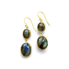 These two-drop earrings showcase natural labradorite stones, each uniquely patterned to ensure a one-of-a-kind accessory. The handmade bezel setting highlights the stones’ subtle blue and green flashes, enhancing their natural allure. Their neutral tones make them versatile for any wardrobe, while the French hook design offers comfortable wear.