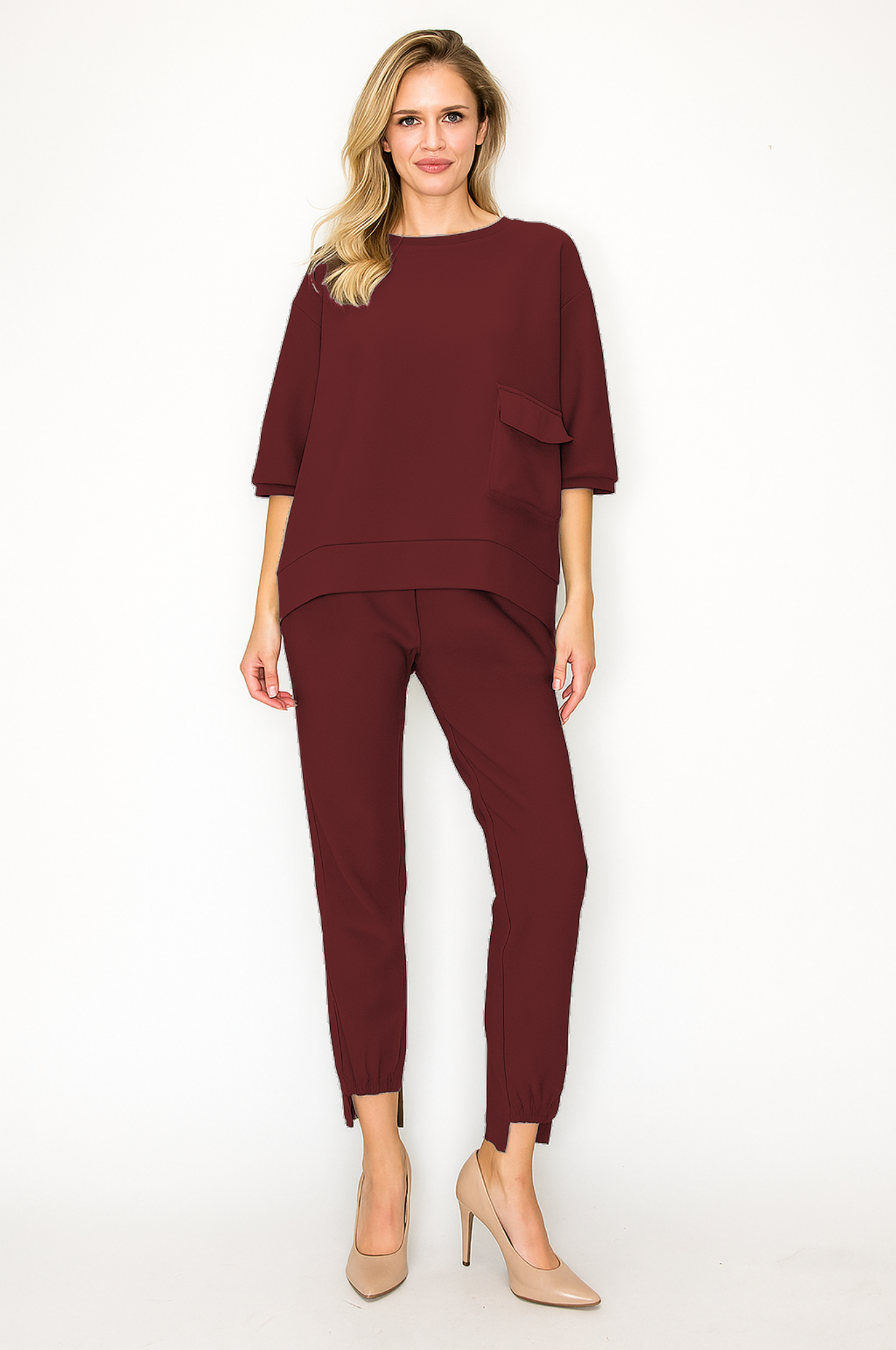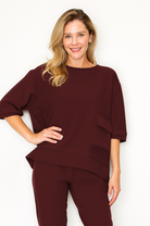 Crafted from premium knit crepe, the Karen Top offers an oversized, relaxed fit that ensures comfort and ease throughout the day. Its round neckline and elbow-length sleeves provide a balanced silhouette, while the front pocket adds a practical touch. This versatile top is ideal for everyday wear, combining quality materials with thoughtful design for effortless style.