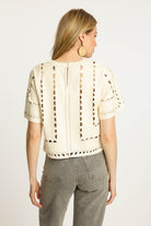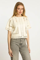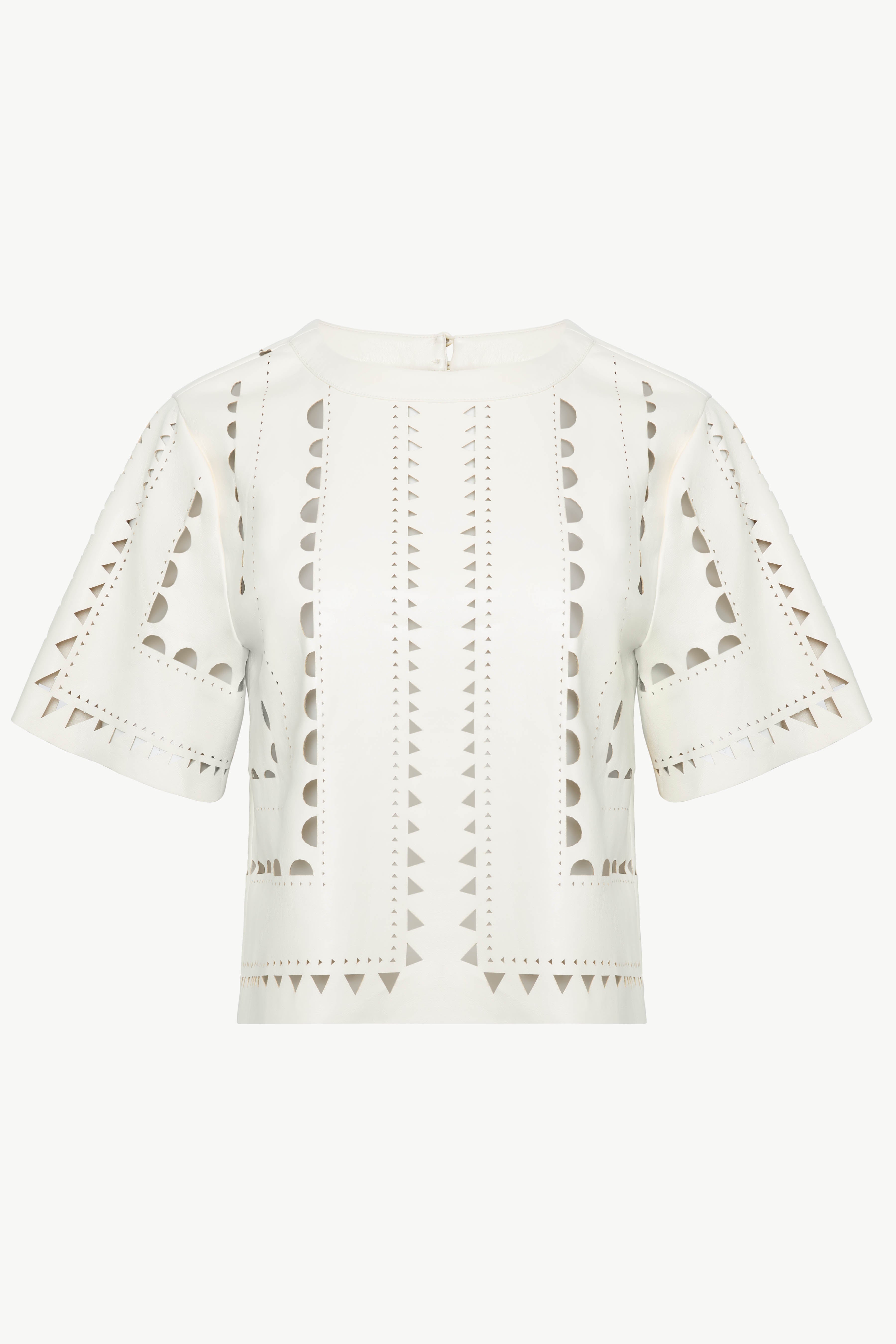 The Anisa Top in Antique White combines perforated vegan leather with intricate cut-out detailing for a modern, textured aesthetic. Its relaxed fit and short sleeves deliver comfort without compromising style. The neutral hue transitions seamlessly from casual to dressy settings, making it a versatile wardrobe essential that feels both elevated and effortless.