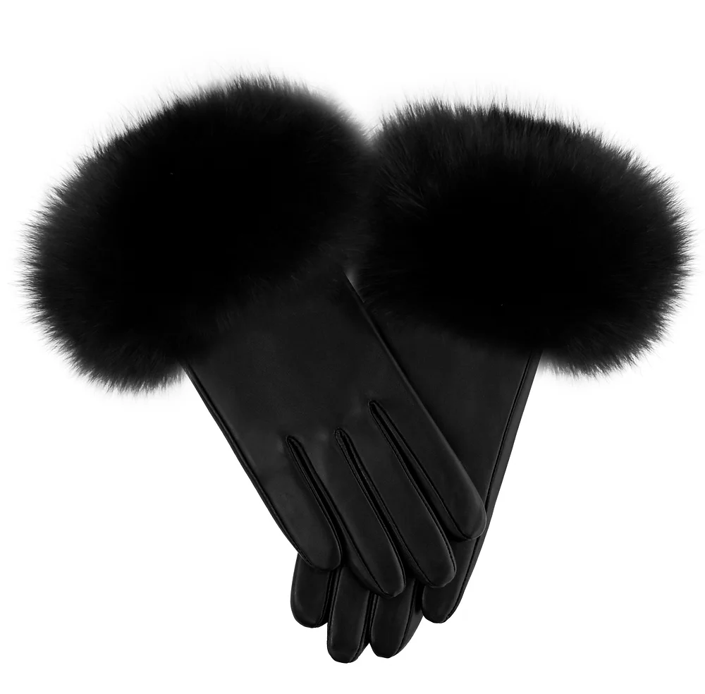 These black leather gloves showcase premium craftsmanship with striking black fox fur trim along the cuffs. The supple leather construction ensures a comfortable fit and natural flexibility, while the luxurious fur accent adds warmth and visual sophistication. Ideal for cold-weather styling, they pair effortlessly with coats and jackets for a polished, refined look. A statement accessory that balances practicality with upscale elegance.