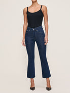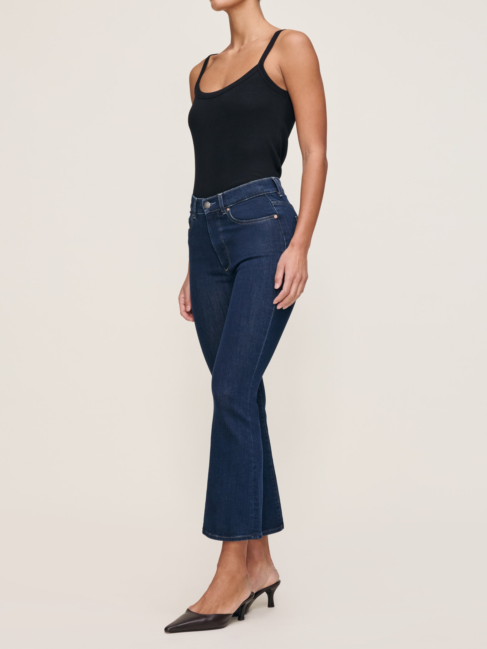Bridget is a high-rise, cropped boot cut jean engineered with Instasculpt™ technology that smooths and sculpts while conforming to your body for a custom fit. The Lunar Sky wash features a rich dark indigo tone with silver shank, copper rivets, and khaki stitching details. Clean hem and black back patch complete the look.
