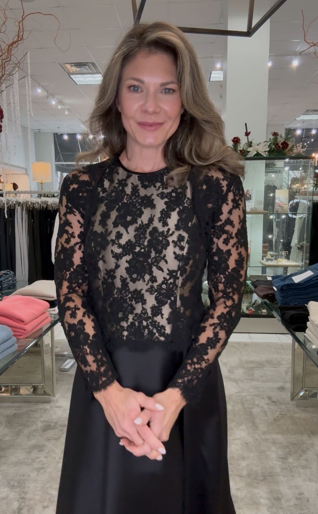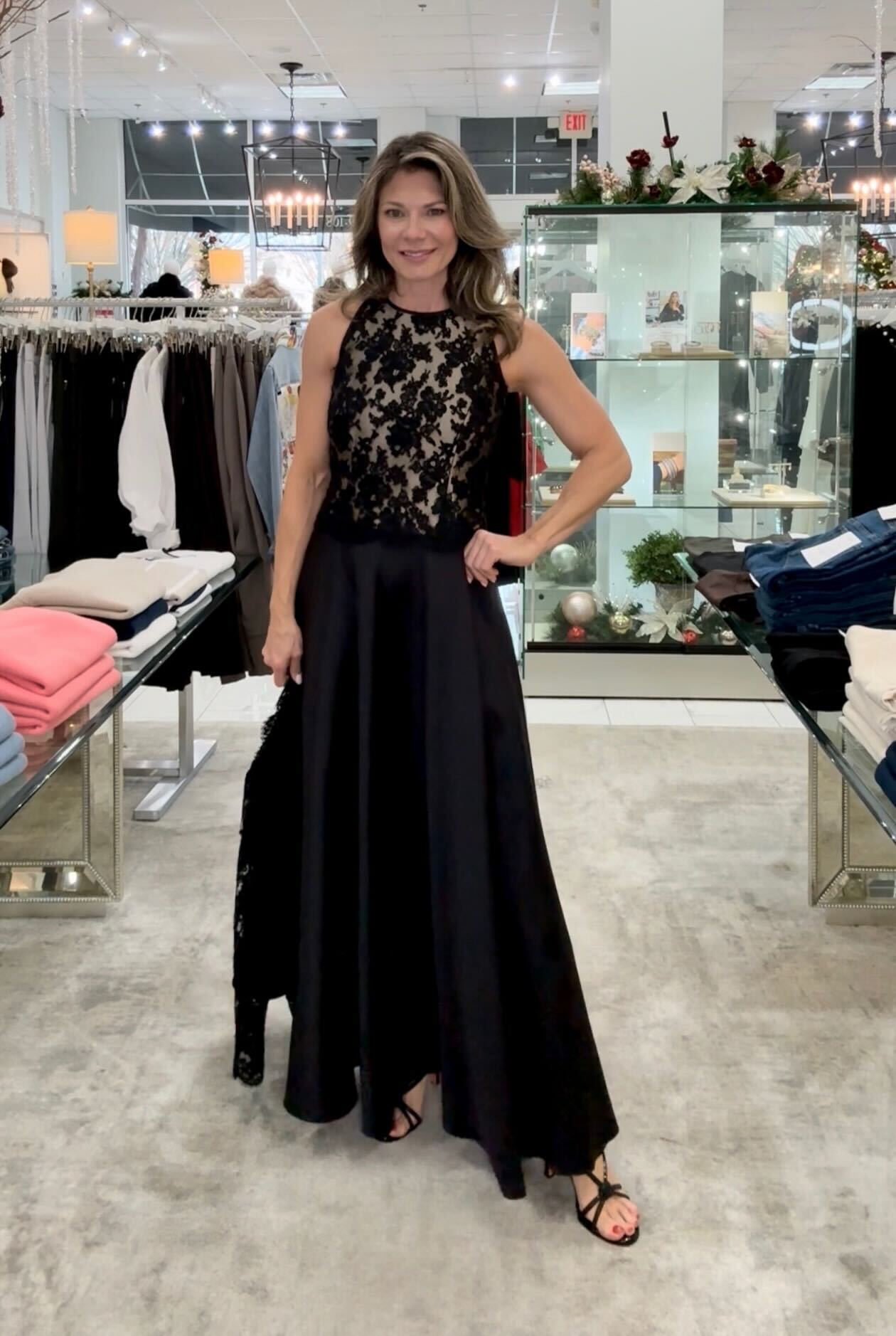 This sophisticated halter gown combines corded lace with a sumptuous silk and wool blend, delivering both visual impact and wearable comfort. The halter neckline frames the shoulders beautifully while the structured bodice provides elegant support. Rich lace detailing cascades into a flowing skirt designed for graceful movement. The included matching jacket adds versatility—layer it for a polished look or wear the gown solo for understated glamour. An investment piece for weddings, galas, and milestone celebrations.