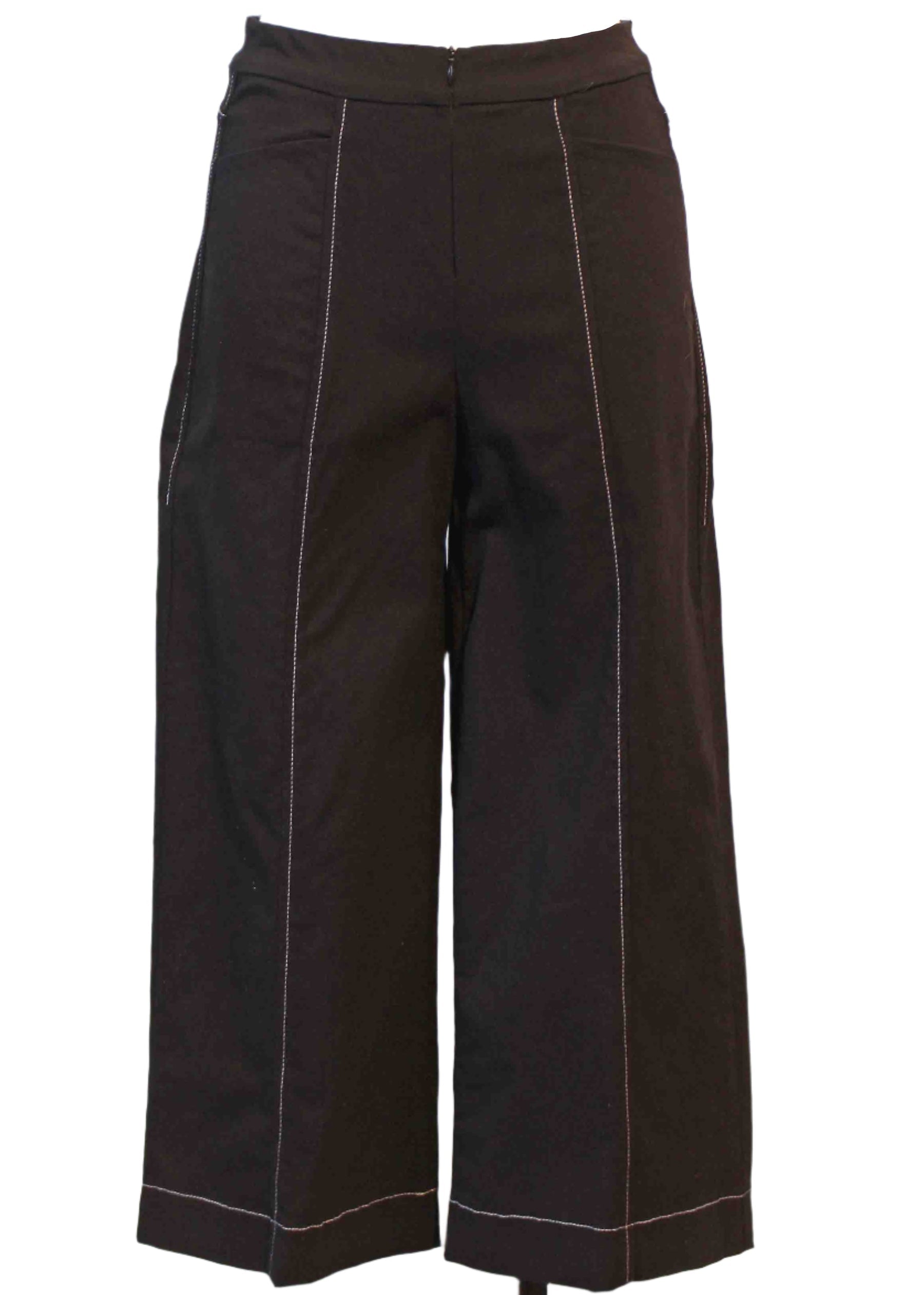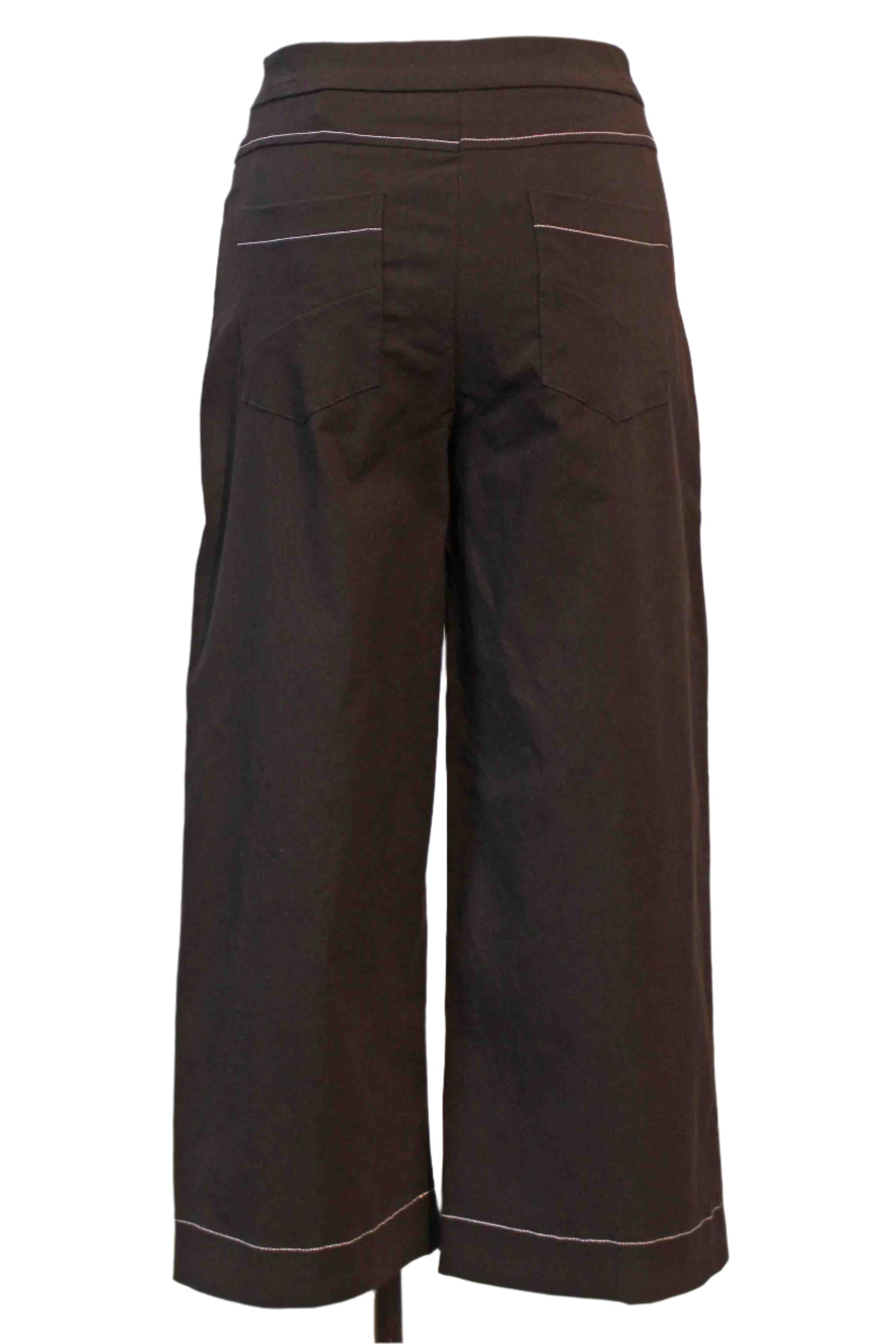 The Davis Cropped Wide Pant by Porto combines sleek style with everyday versatility. Crafted in signature stretch twill, this black pant features crisp white contrast stitching, a flat waistband, and a slim-fitting silhouette through the hips that tapers to a cropped, wide leg. Functional details include a small zipper front closure, slit hip pockets, and rear patch pockets.