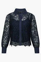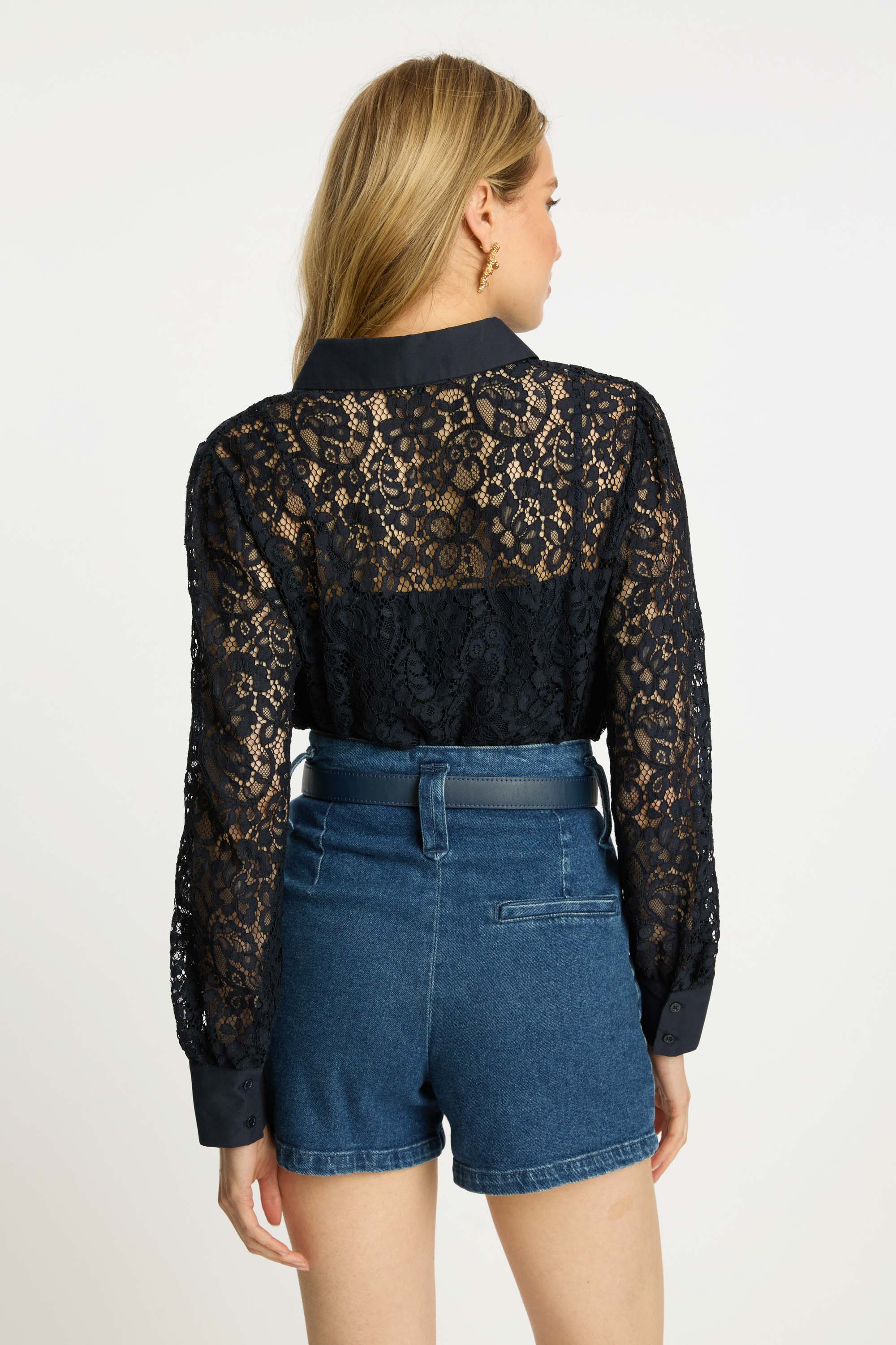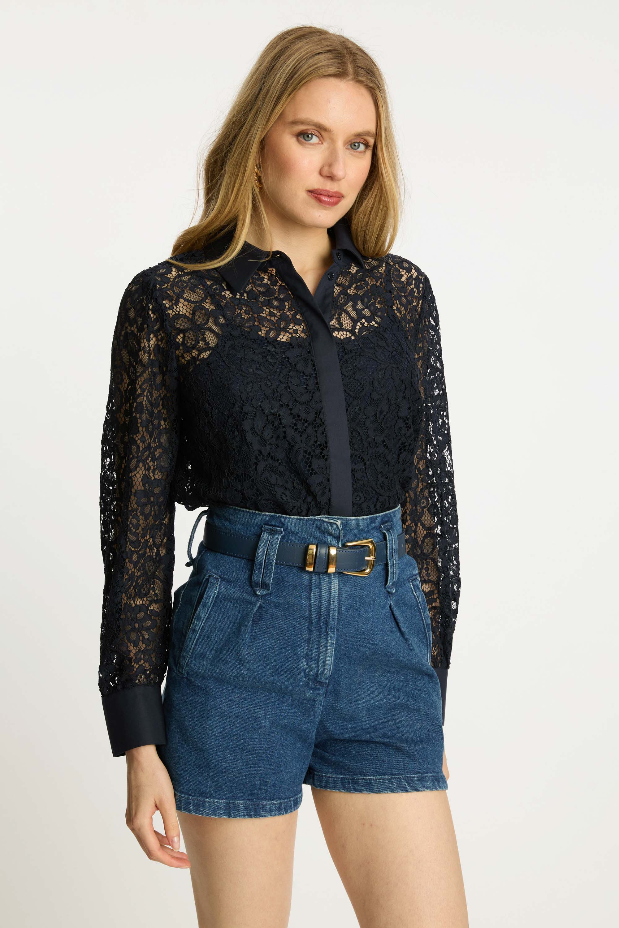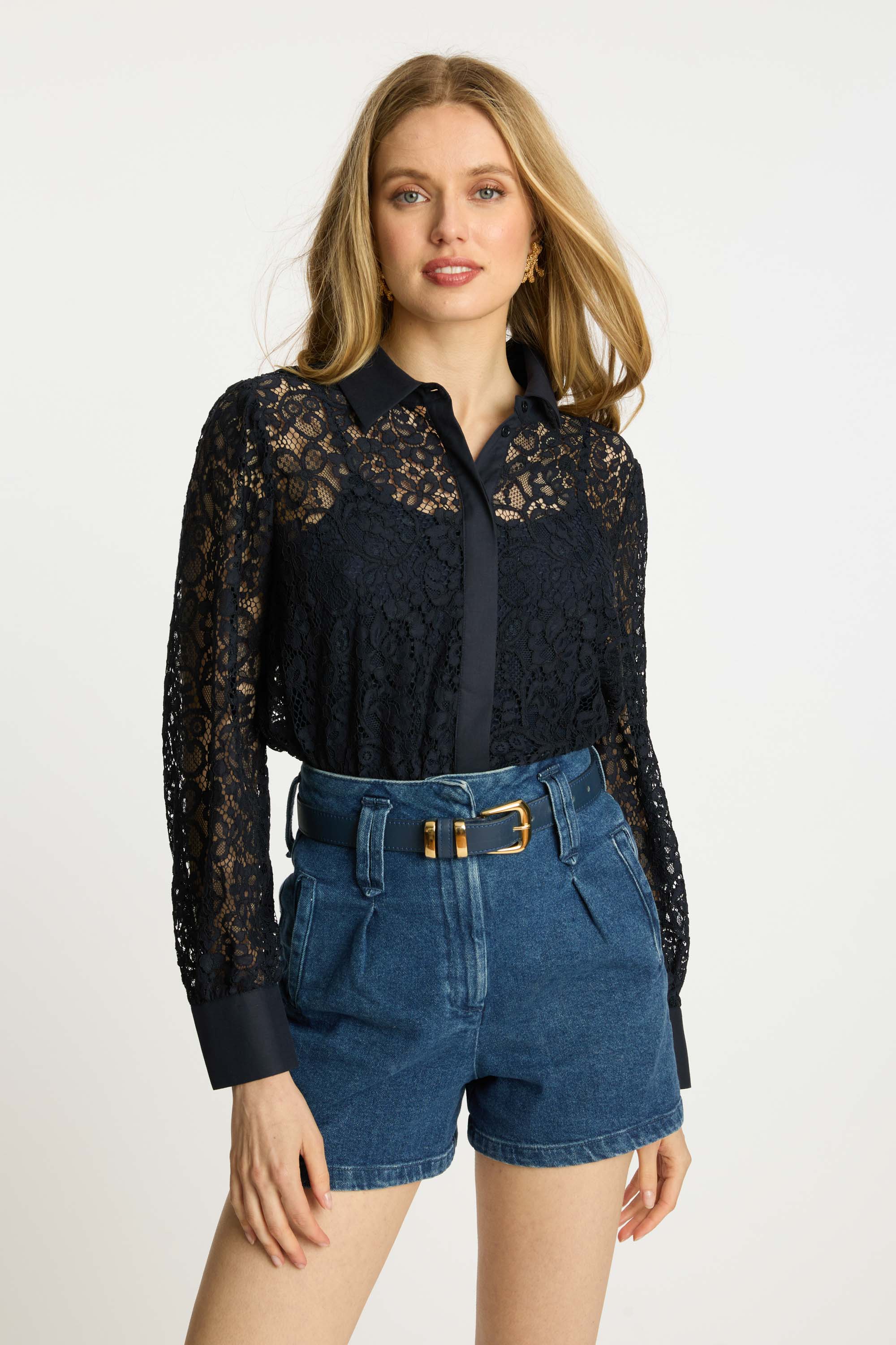 The Emmie Top in Dark Navy Lace combines romantic sophistication with everyday versatility. This button-down features intricate lace throughout, a classic shirt collar, and sheer lace sleeves finished with a delicate scalloped hem. The relaxed fit and contrasting cuffs create effortless elegance, while the rich navy shade transitions seamlessly from tailored trousers to denim. A refined piece that works for any occasion.