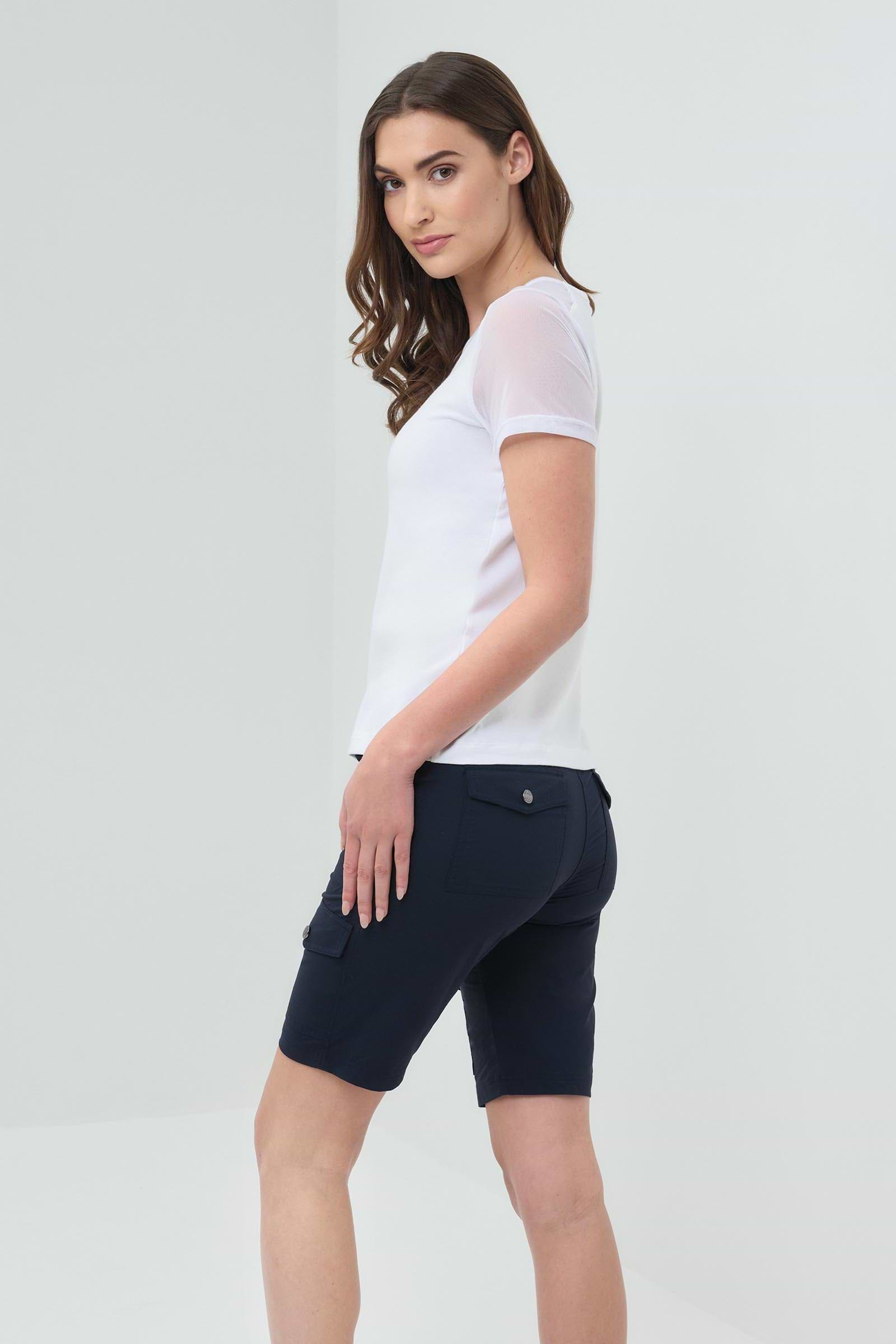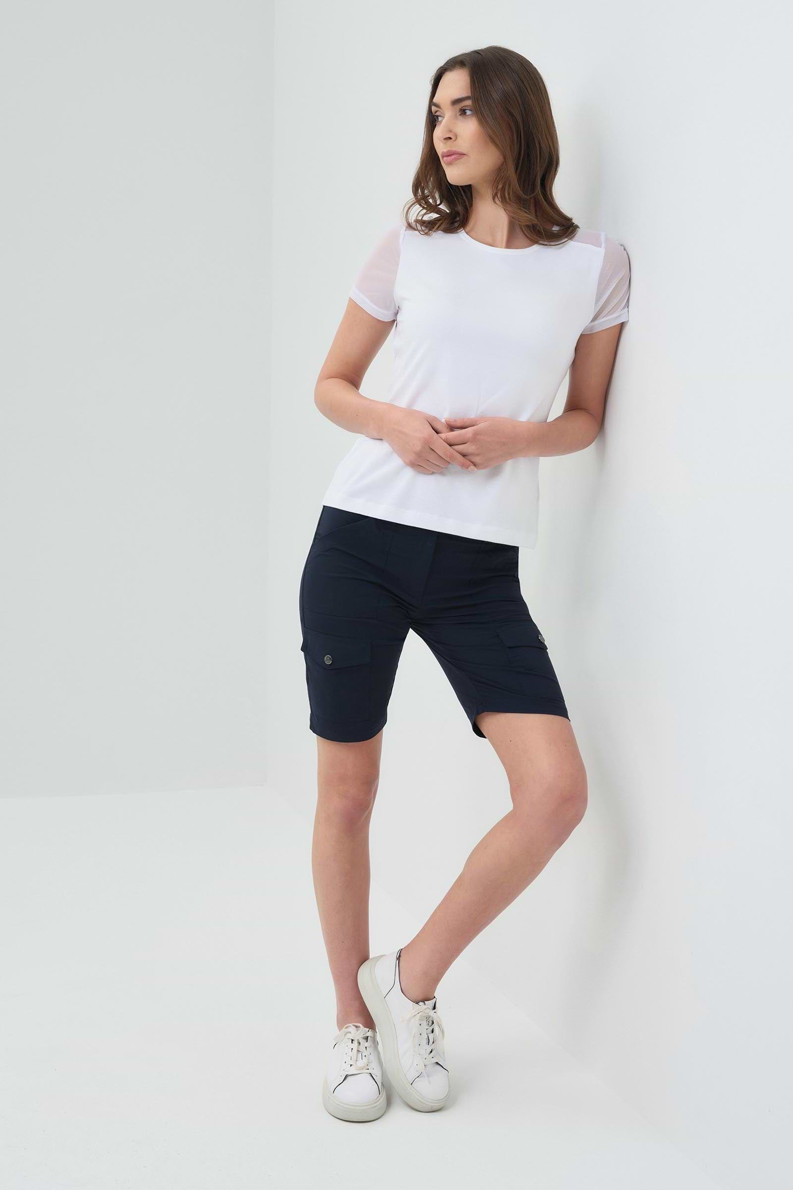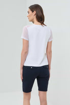 The Melissa Mesh-Sleeve T-Shirt combines comfort with contemporary style. Crafted from premium Pima Modal, this white tee features breathable mesh sleeves that keep you cool while maintaining a polished look. The wrinkle-resistant fabric means less time ironing and more time living. With its flattering slim fit, this versatile piece transitions seamlessly from casual weekends to professional settings. A wardrobe essential that works as hard as you do.