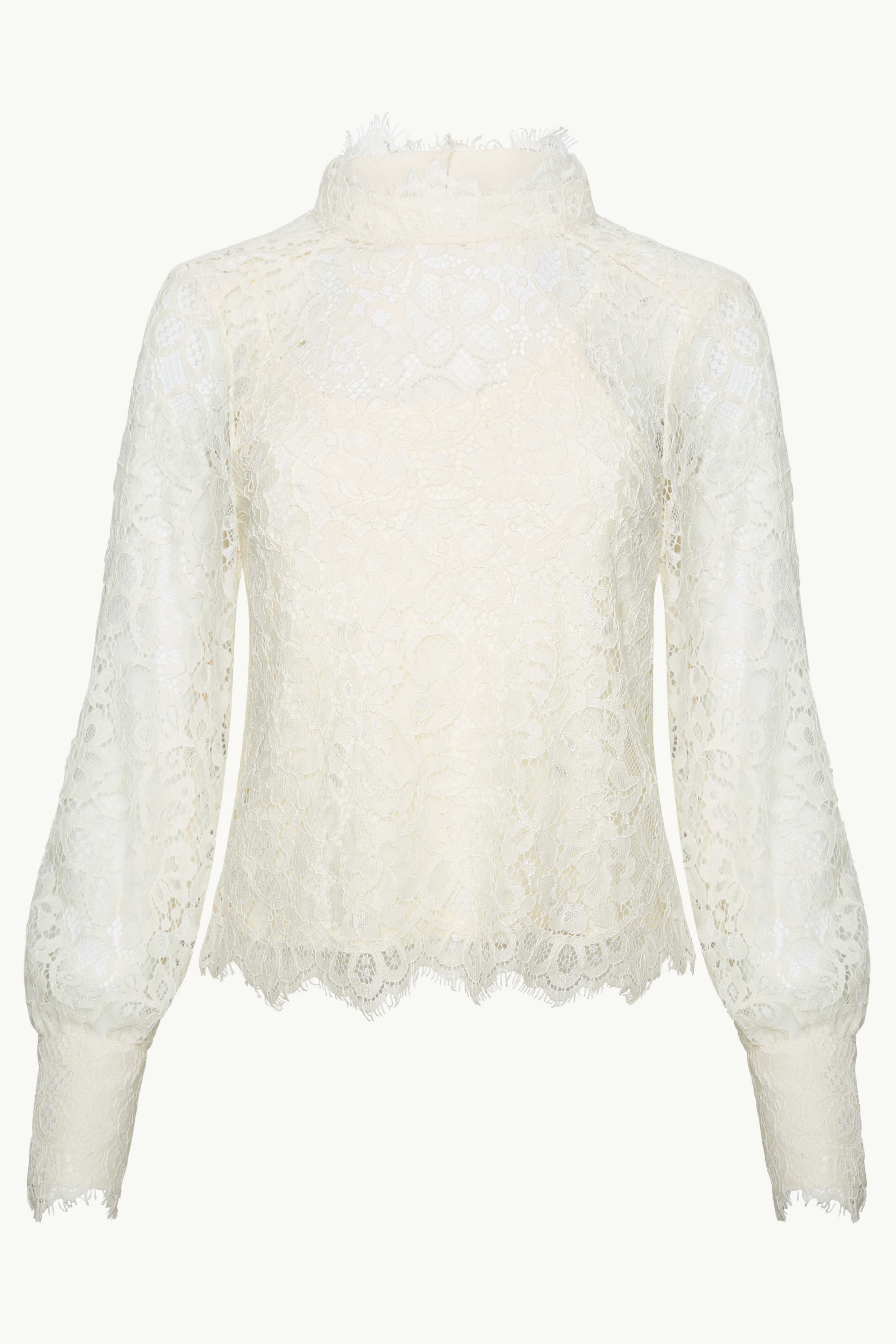 The Serena Top in Antique White features intricate lace with a delicate floral pattern, high neckline, and long sleeves. This romantic piece combines timeless elegance with sophisticated craftsmanship, making it ideal for special occasions or refined everyday wear.