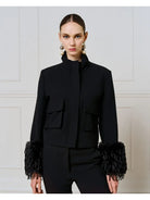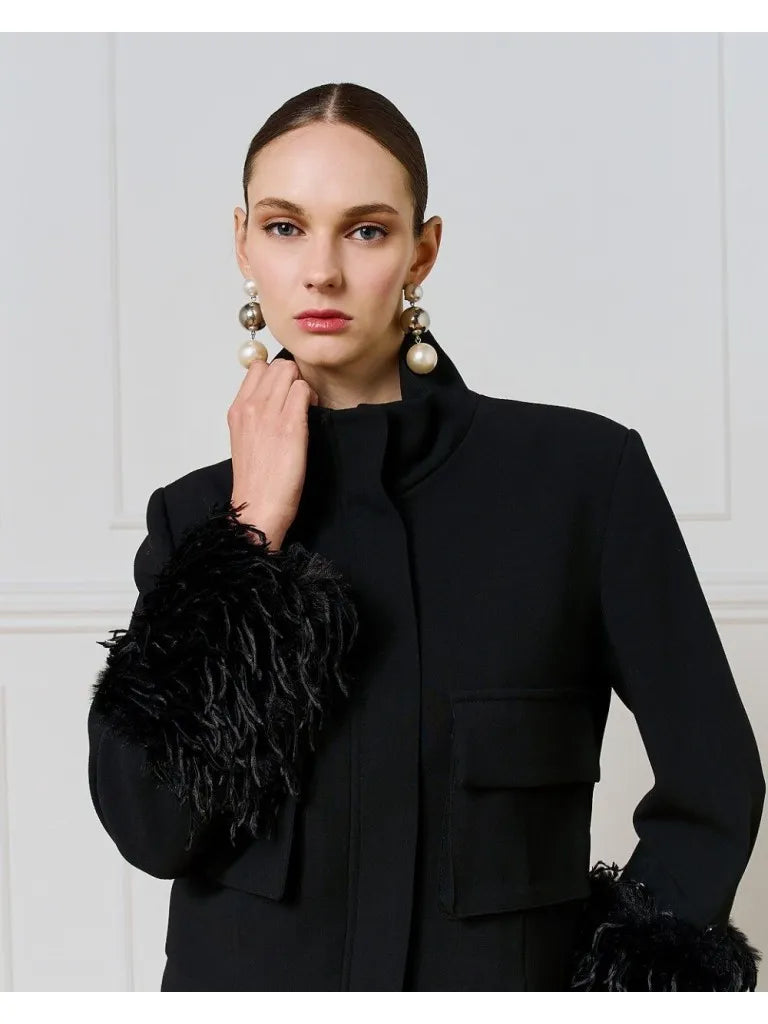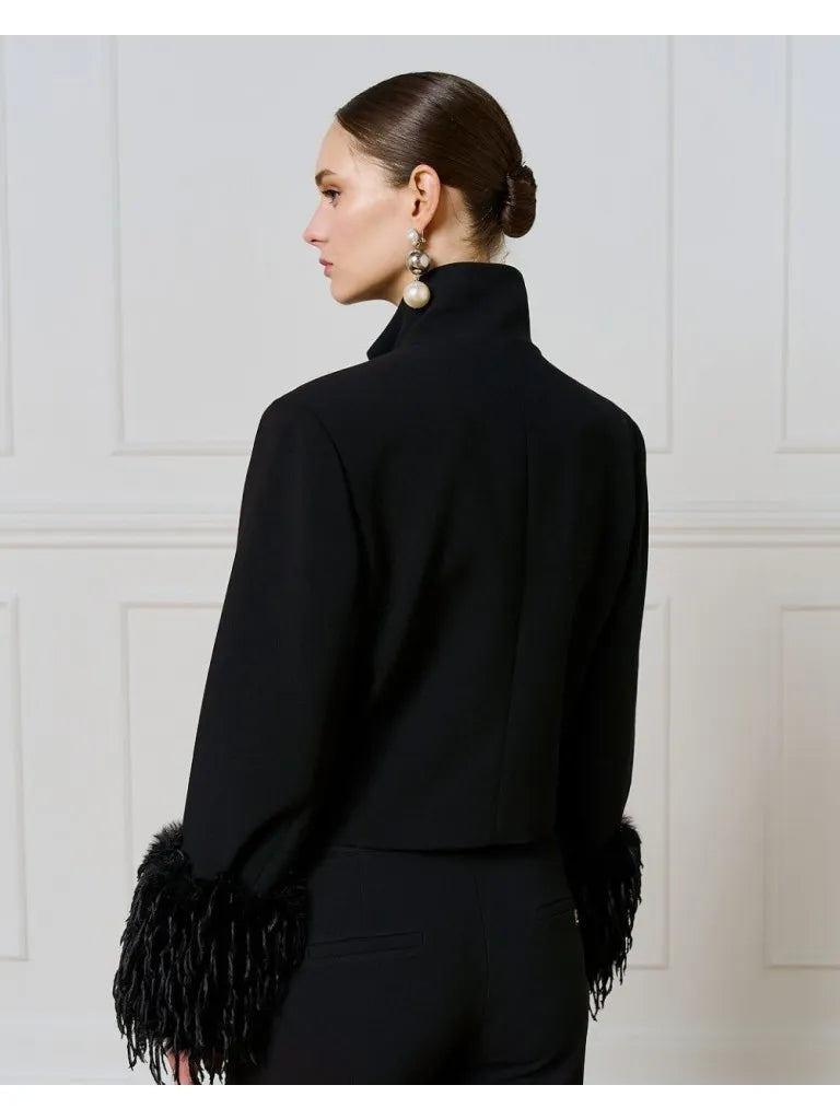 This Jacket with Feather Sleeves combines refined tailoring with luxurious detailing, featuring feather accents that add texture and movement. Designed for those seeking a sophisticated yet bold look, it delivers both elegance and comfort. Ideal for elevating formal wardrobes or making a statement at upscale occasions.