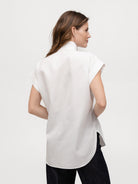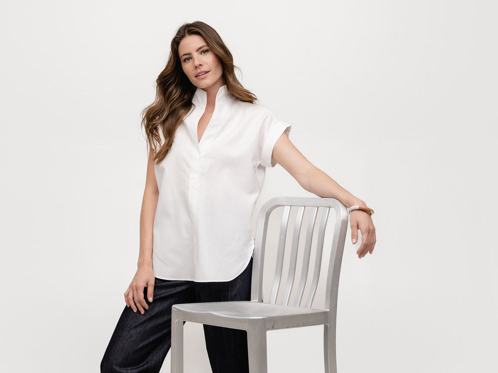 This cap-sleeved tunic combines effortless style with functional design, ideal for warm weather and travel. Its relaxed fit and curved hem offer versatile wear, whether tucked or untucked. The standout feature is the fully shapeable one-piece collar from our Signature Shirt, adding a refined touch. Perfect as a beach cover-up or for an elegant outdoor dinner, this piece balances comfort and sophistication with expert craftsmanship.
