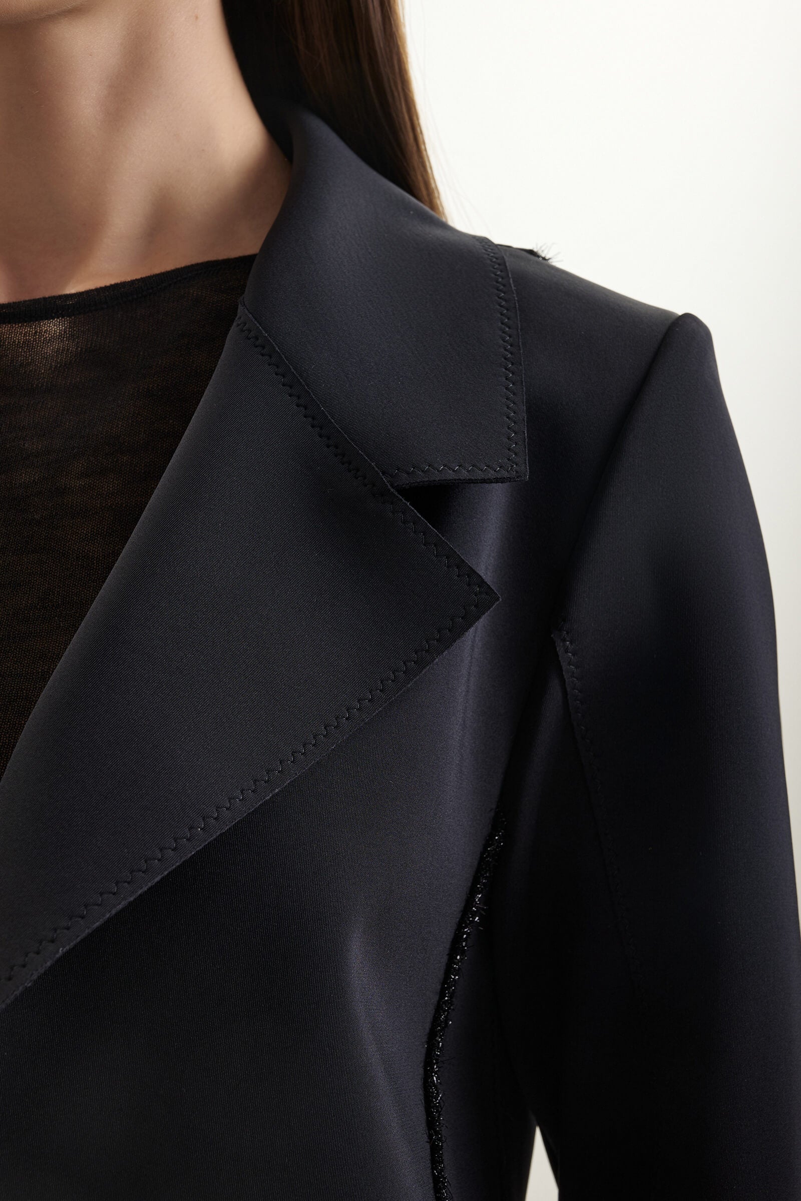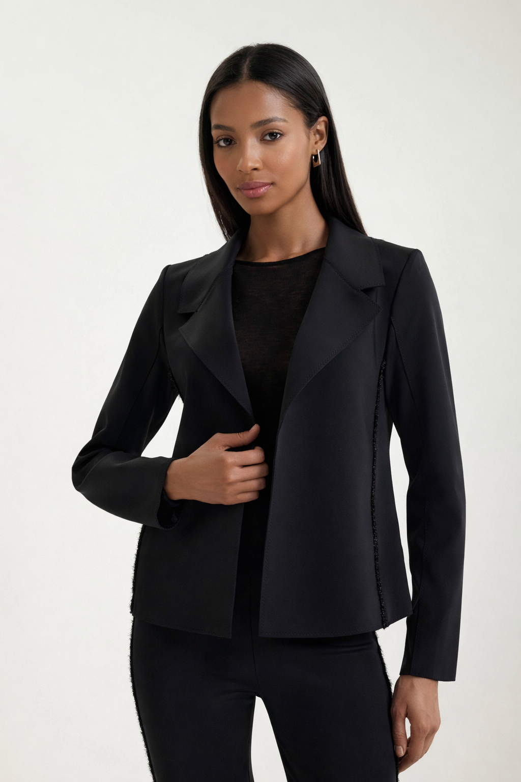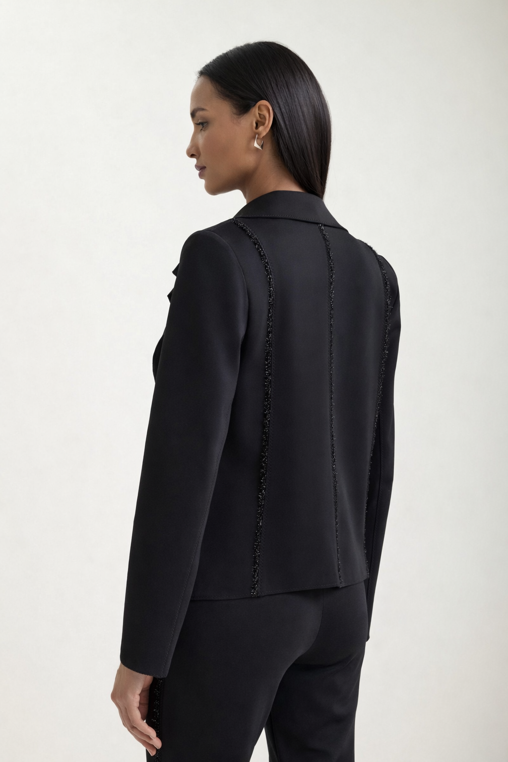 Barbara is an evening collection with a strong architectural character. 3D jersey combined with lurex, sequins, and shiny braid creates a multi-layered play of textures and light. The bi-elastic materials, stretching in two directions, provide comfort and freedom of movement while maintaining a well-defined silhouette. The striking surfaces give the looks a festive tone, yet the shapes remain restrained and refined. Barbara is the perfect choice for those seeking a modern, intellectual interpretation of glamour.