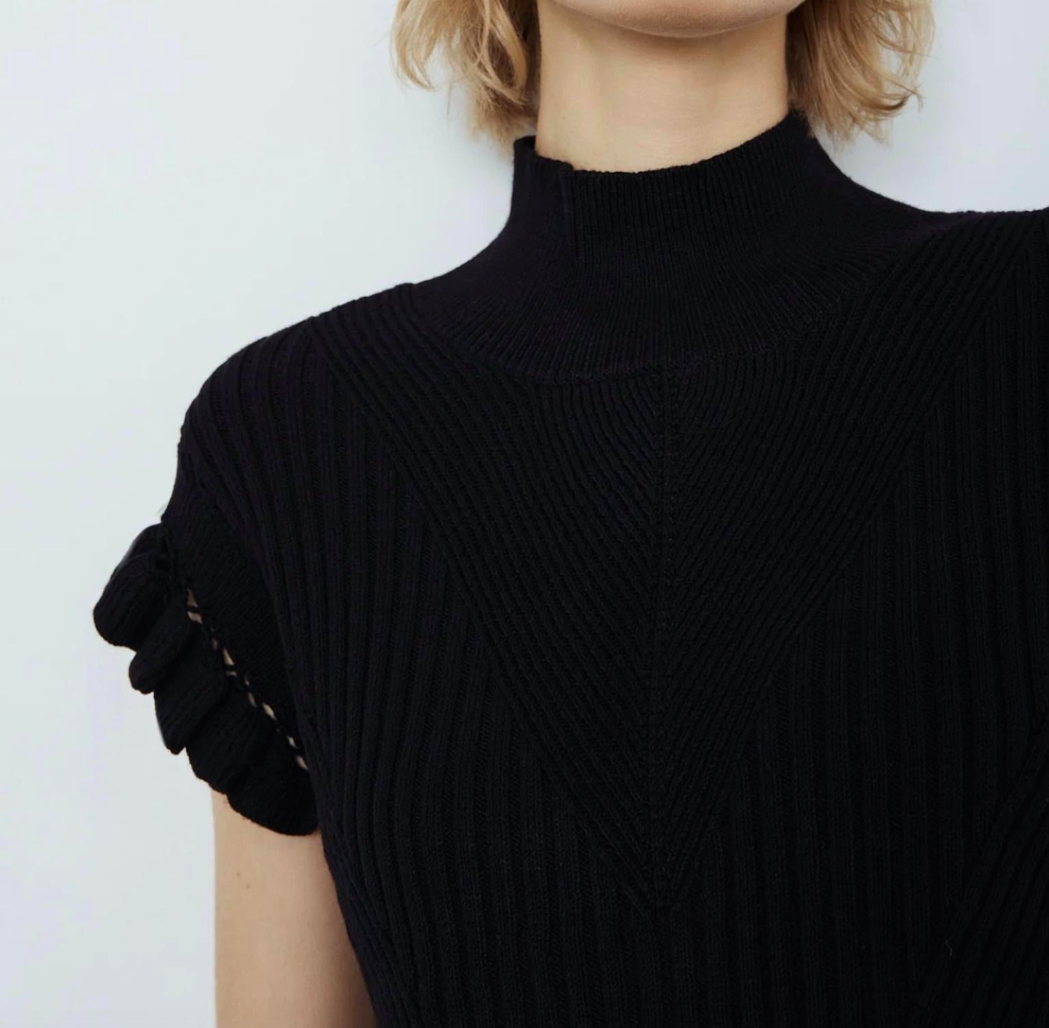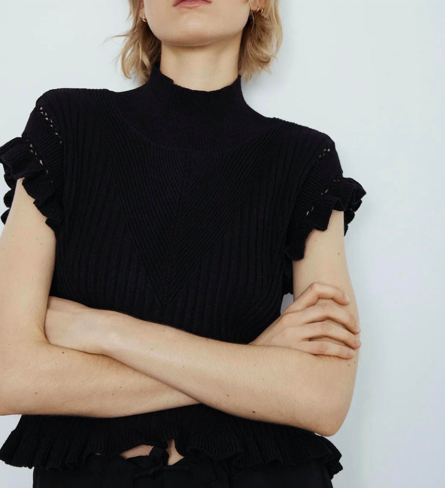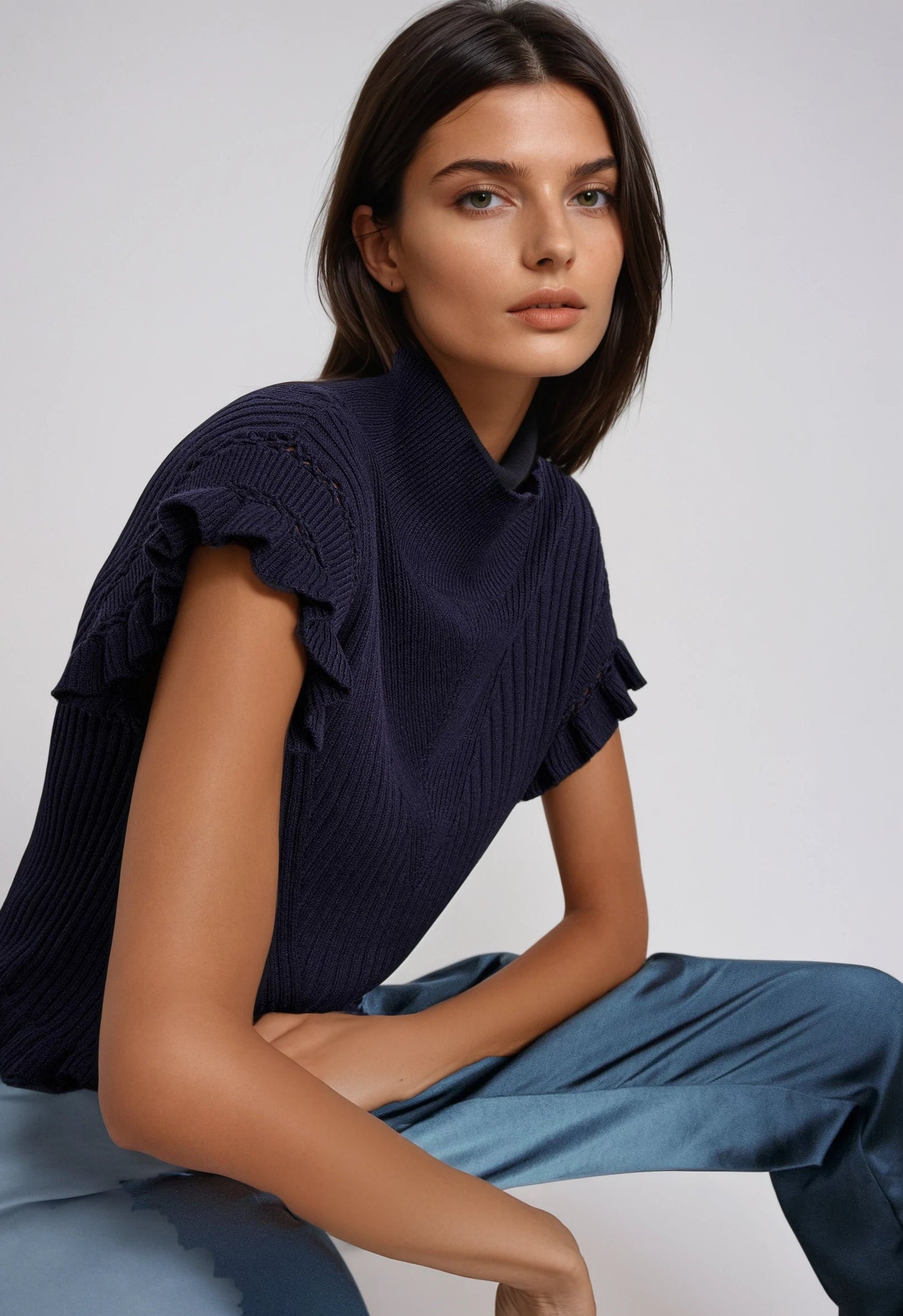 The Dani Sweater combines refined design with everyday comfort. Its mock neck offers a sophisticated silhouette, while delicate frill accents on the sleeves and hem elevate the overall look. This top is an excellent choice for those seeking a versatile piece that seamlessly transitions from casual to polished settings.