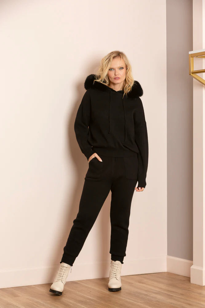 Cozy wool-blend hooded sweater with detachable genuine fur trim in black and ivory.