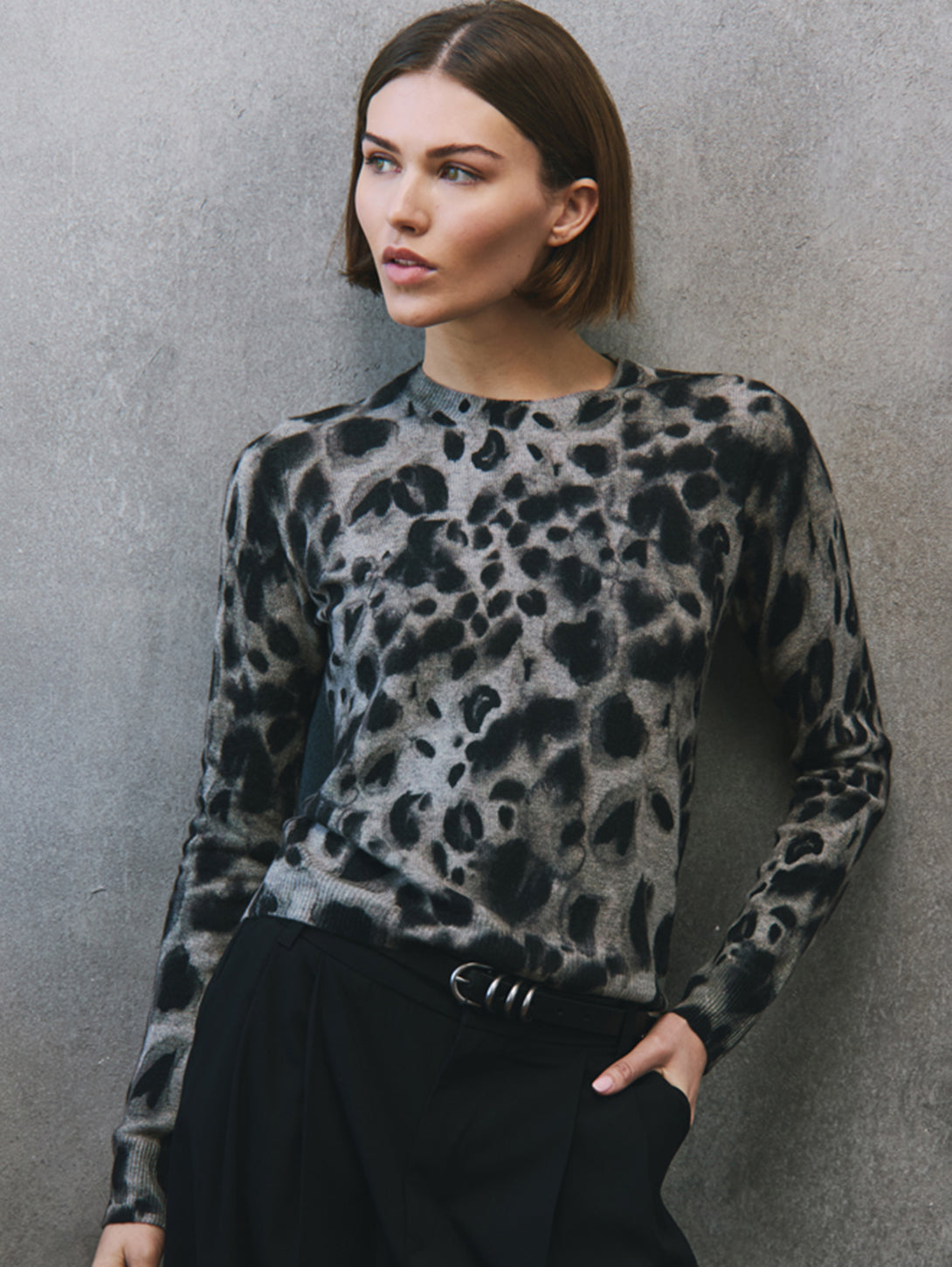 This cashmere crew sweater combines luxury with understated style through its watercolor cheetah print in muted grey and black tones. Precision-ribbed edges at the neckline, waistband, and sleeve cuffs deliver a refined, close fit that resists stretching. Perfect worn solo for a statement look or layered beneath a collared shirt for added dimension, it bridges the gap between relaxed comfort and polished elegance with ease.