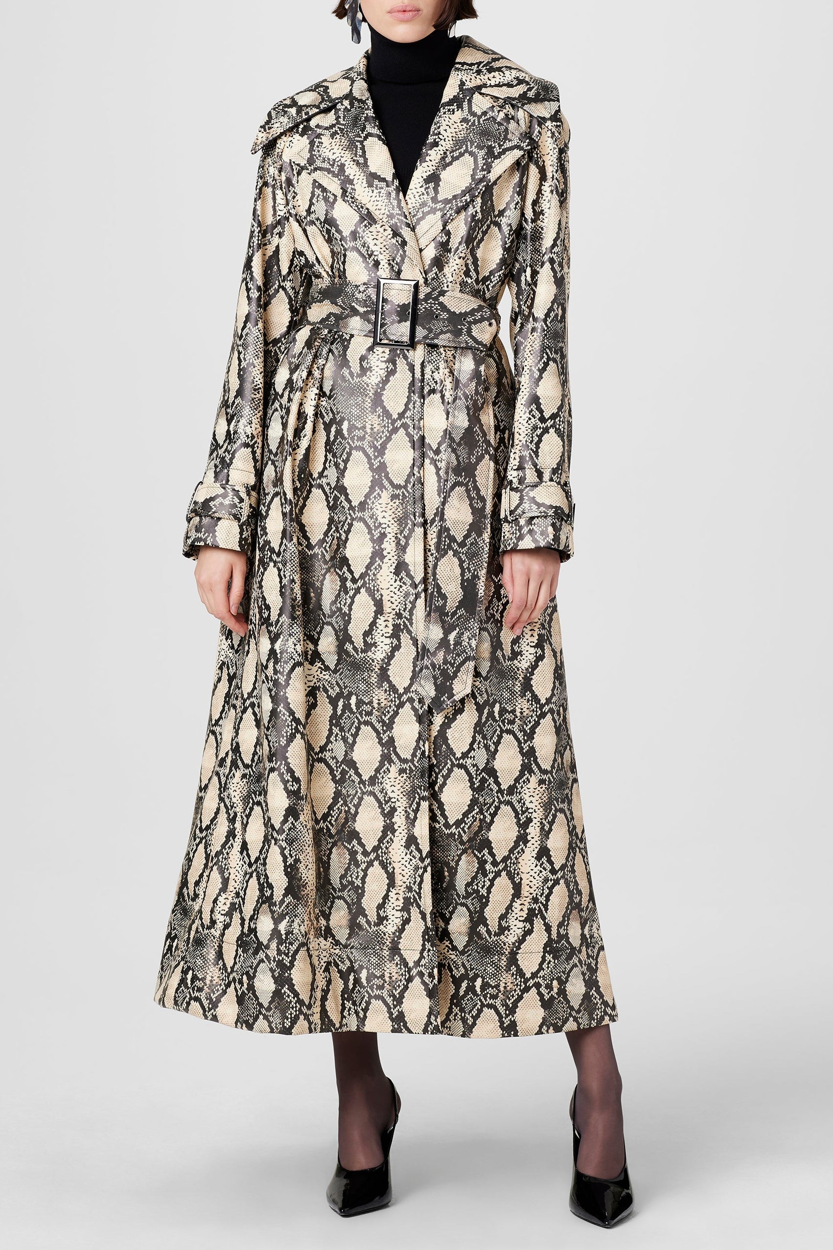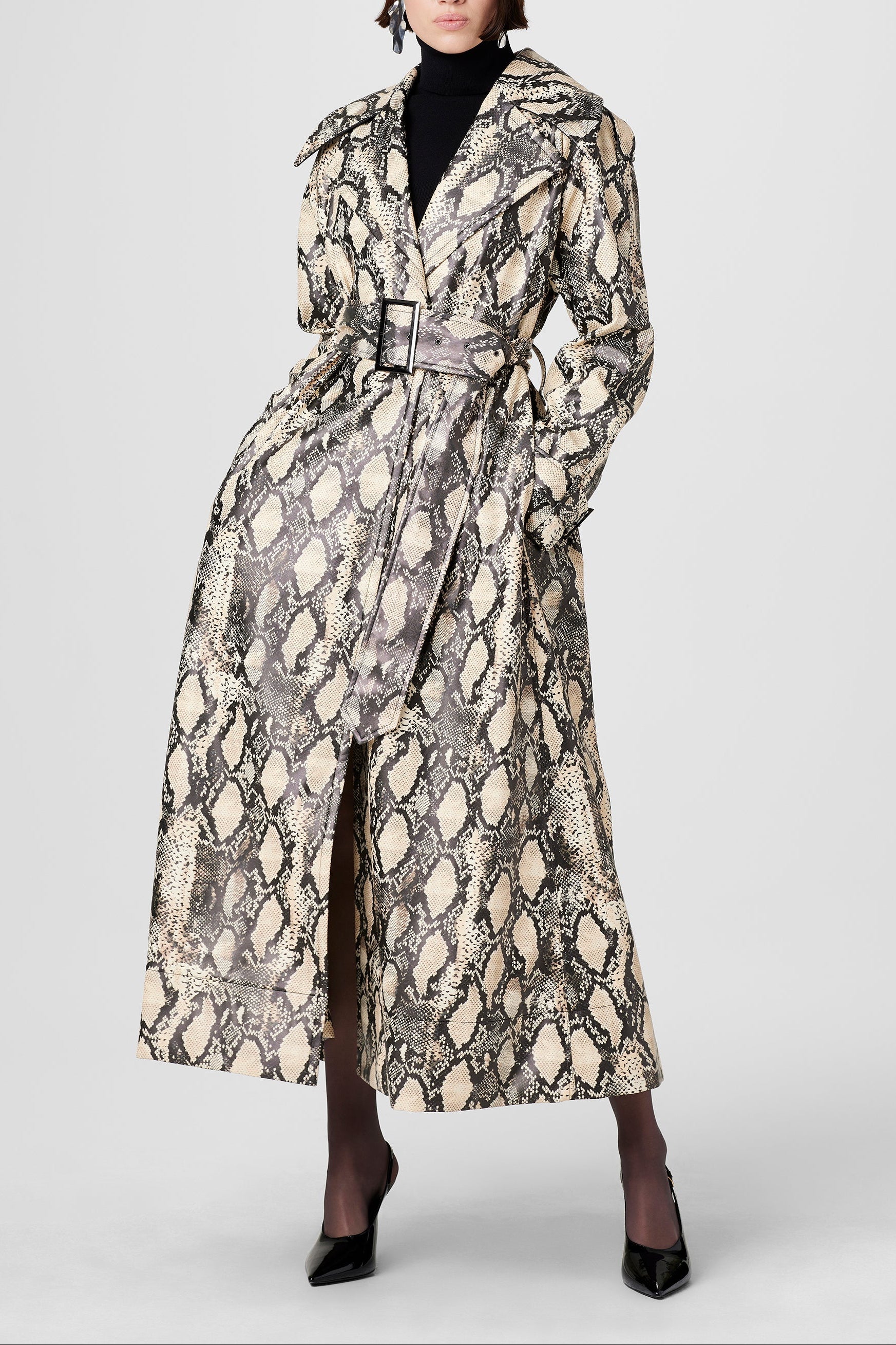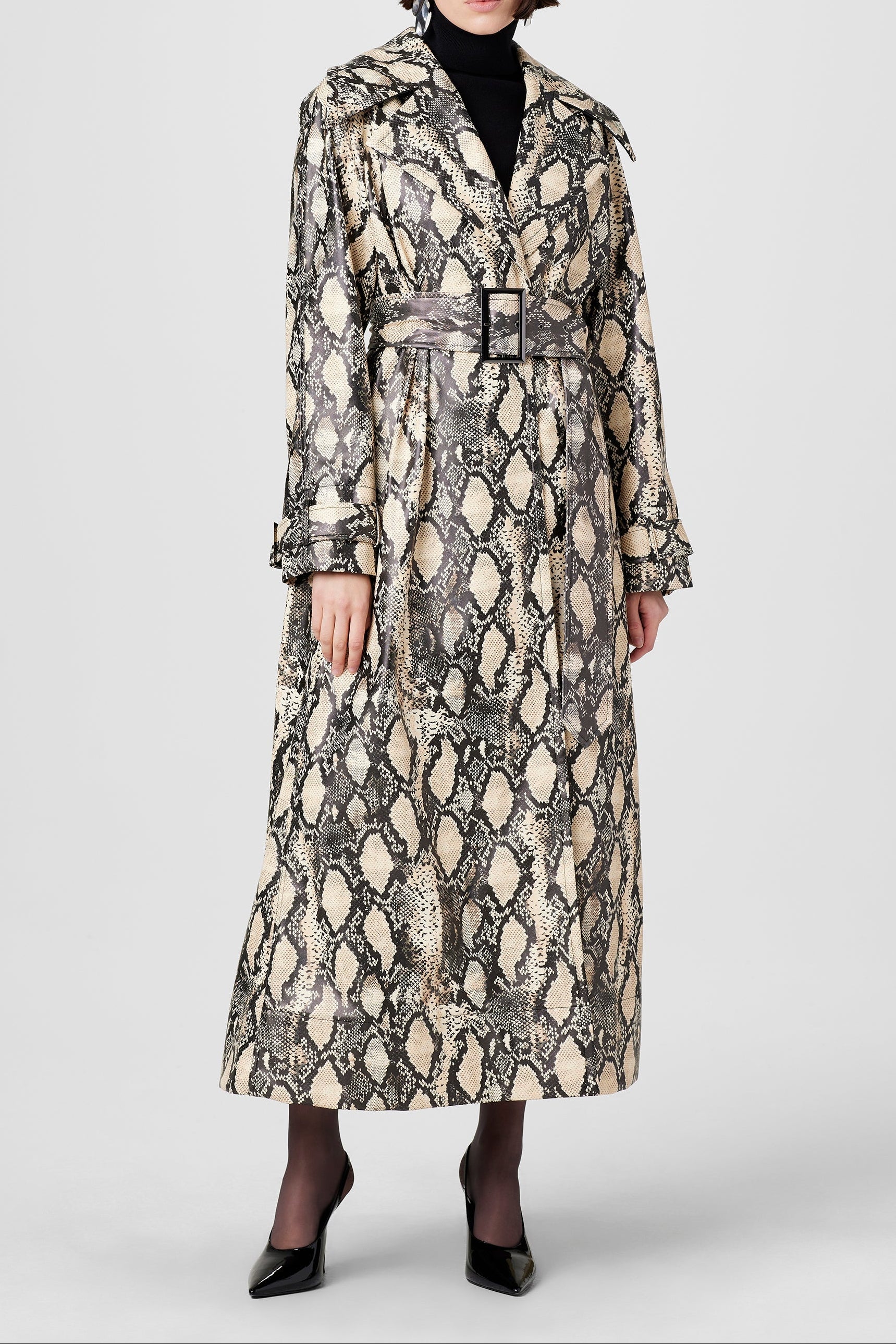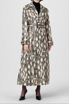 The Chloe Classic Trench Coat in python print combines a structured silhouette with a sophisticated, textured finish. Crafted from high-quality vegan leather, this coat offers a cruelty-free alternative without compromising on luxury. Its bold pattern and tailored design elevate your wardrobe, making it an ideal choice for those seeking both style and ethical fashion.