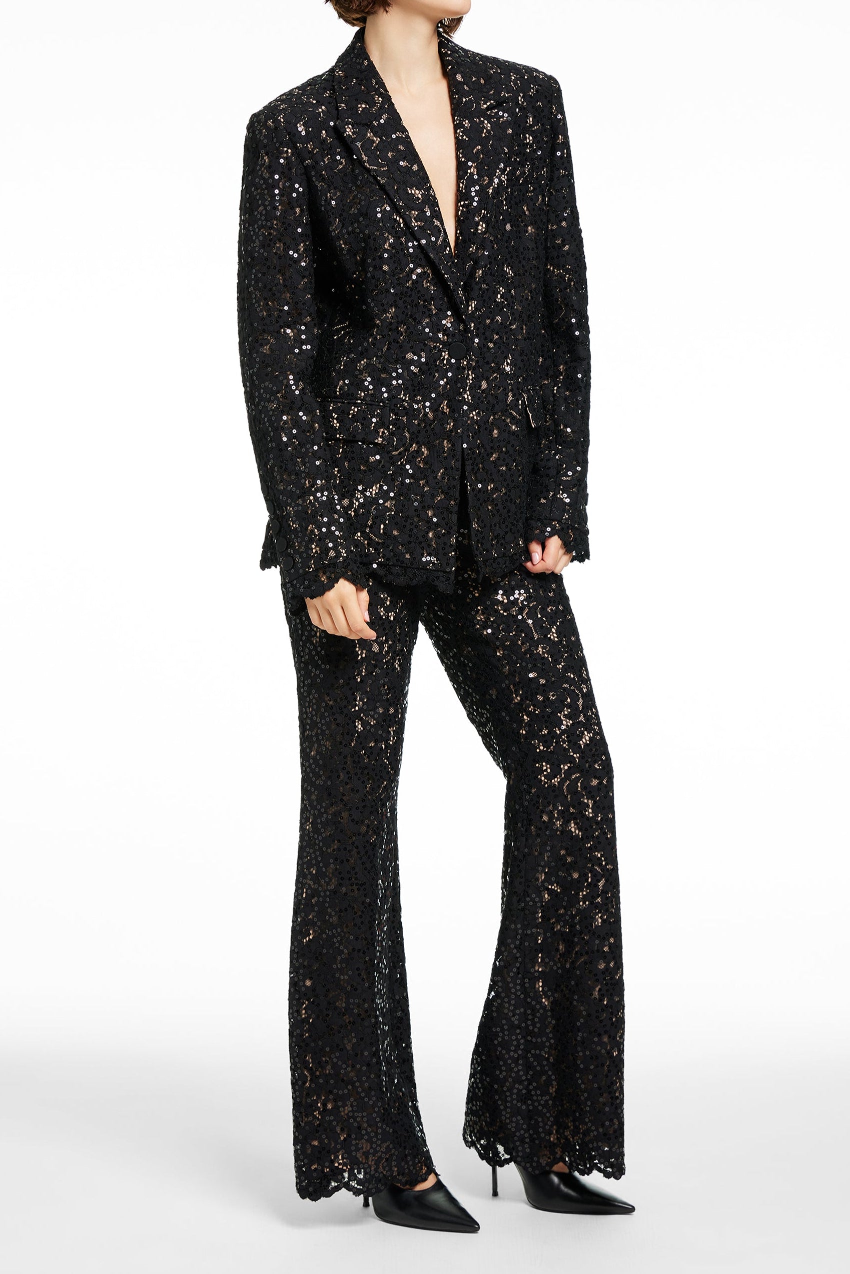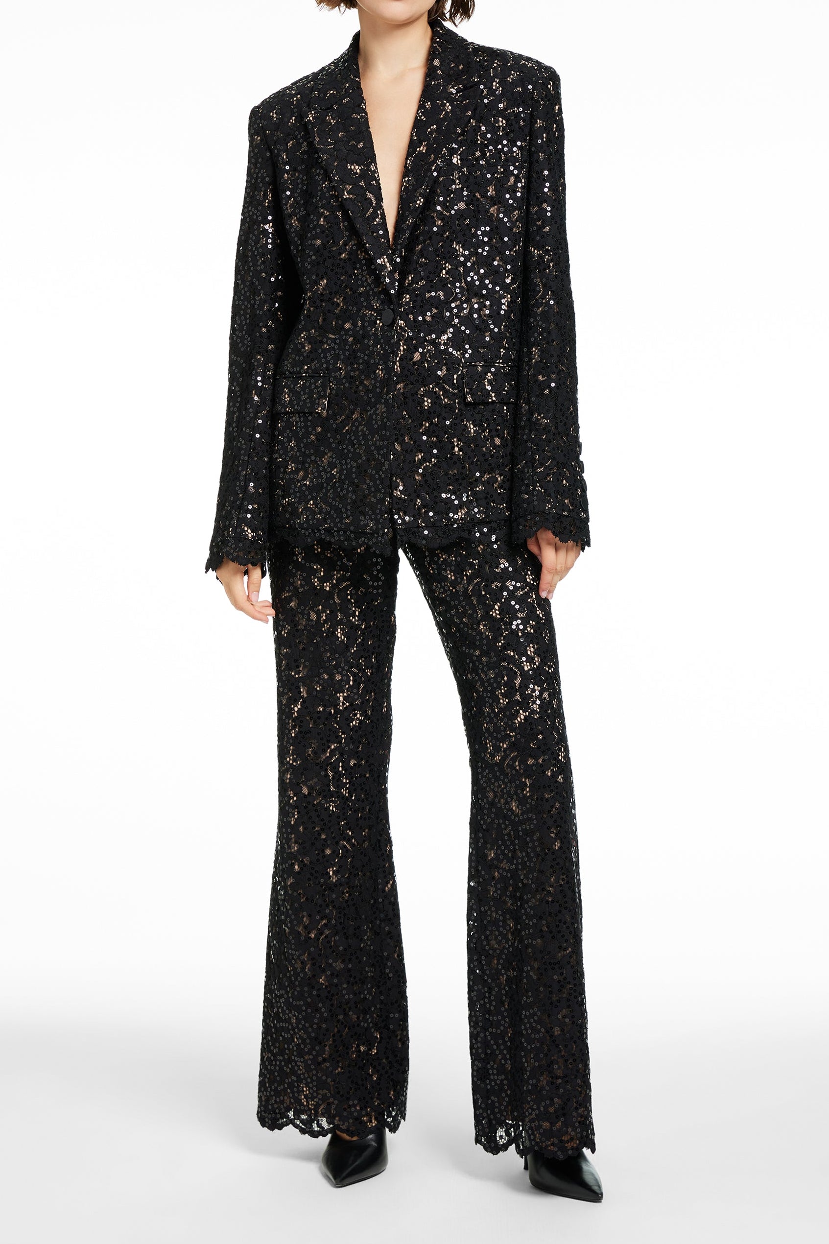 The Gaia high-rise flared pant elevates any occasion with its corded sequin lace construction and delicate scalloped hem. The subtle shimmer creates a lengthening effect that flatters the silhouette, while the slight flare offers modern movement and comfort. Style it solo with a sleek bodysuit for understated glamour, or layer with the matching Willa Blazer to craft a polished, coordinated ensemble that commands attention.