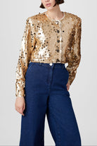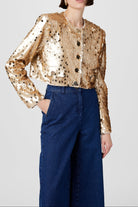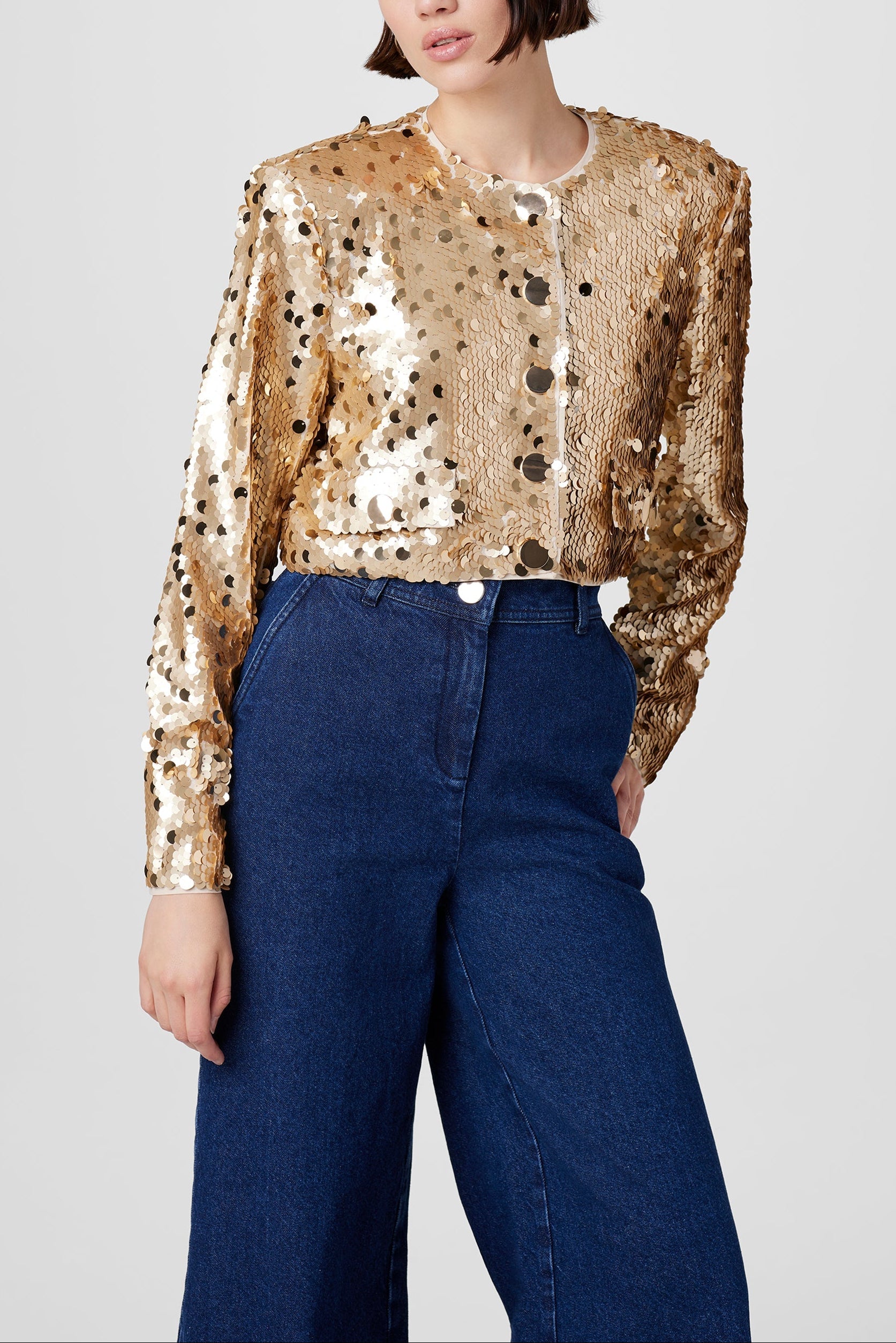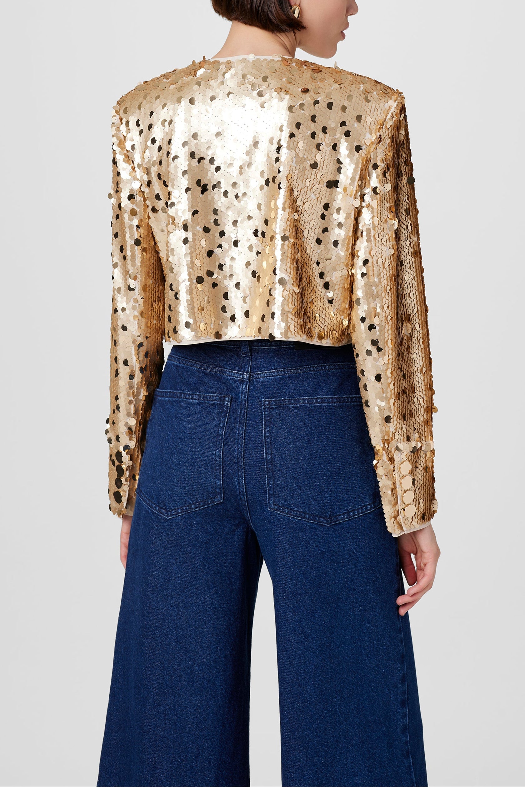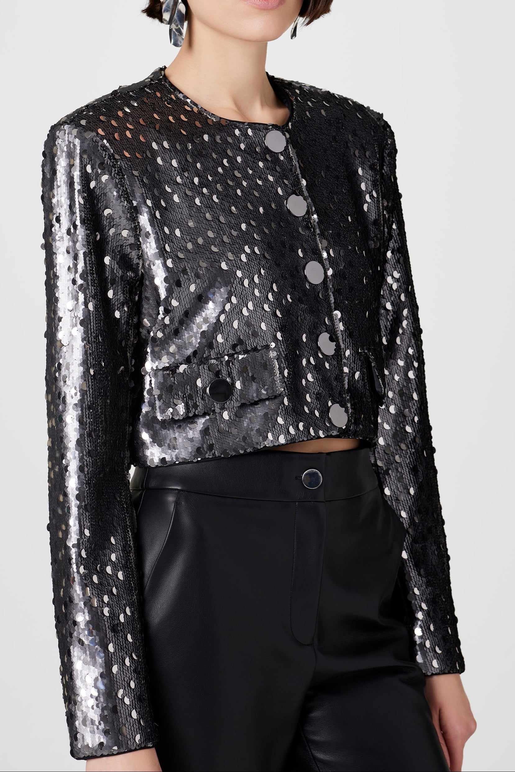 The Jones Crew Neck Cropped Jacket by Toccin features bold, large-scale paillette sequins that create a striking, luminous effect. Its cropped silhouette offers a contemporary, tailored fit perfect for layering or elevating any outfit with expert polish and modern flair.