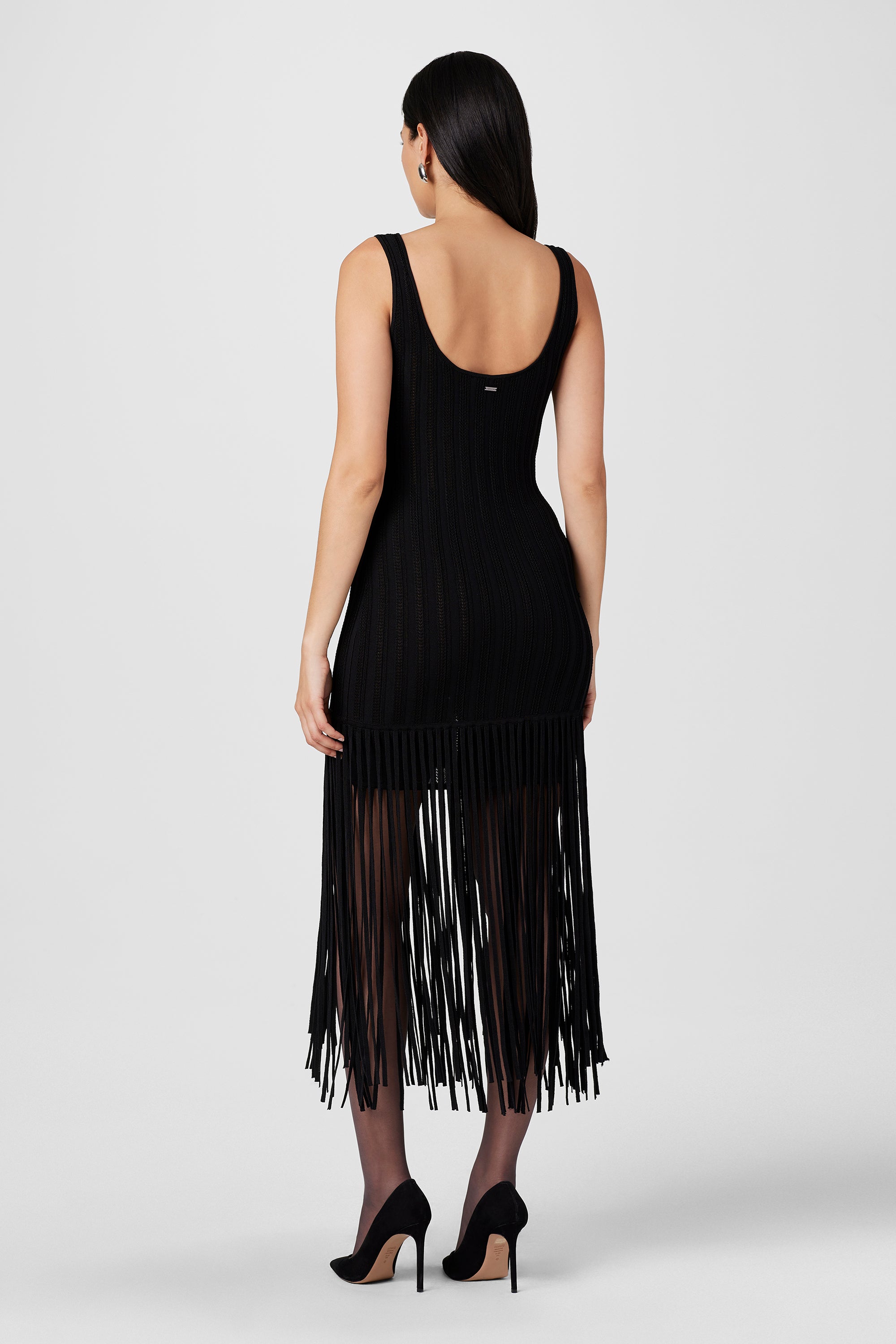 - Fit: Scooped neck, body-con, short length with long fringe