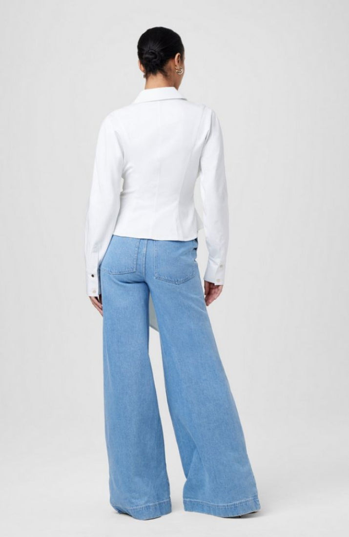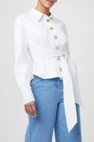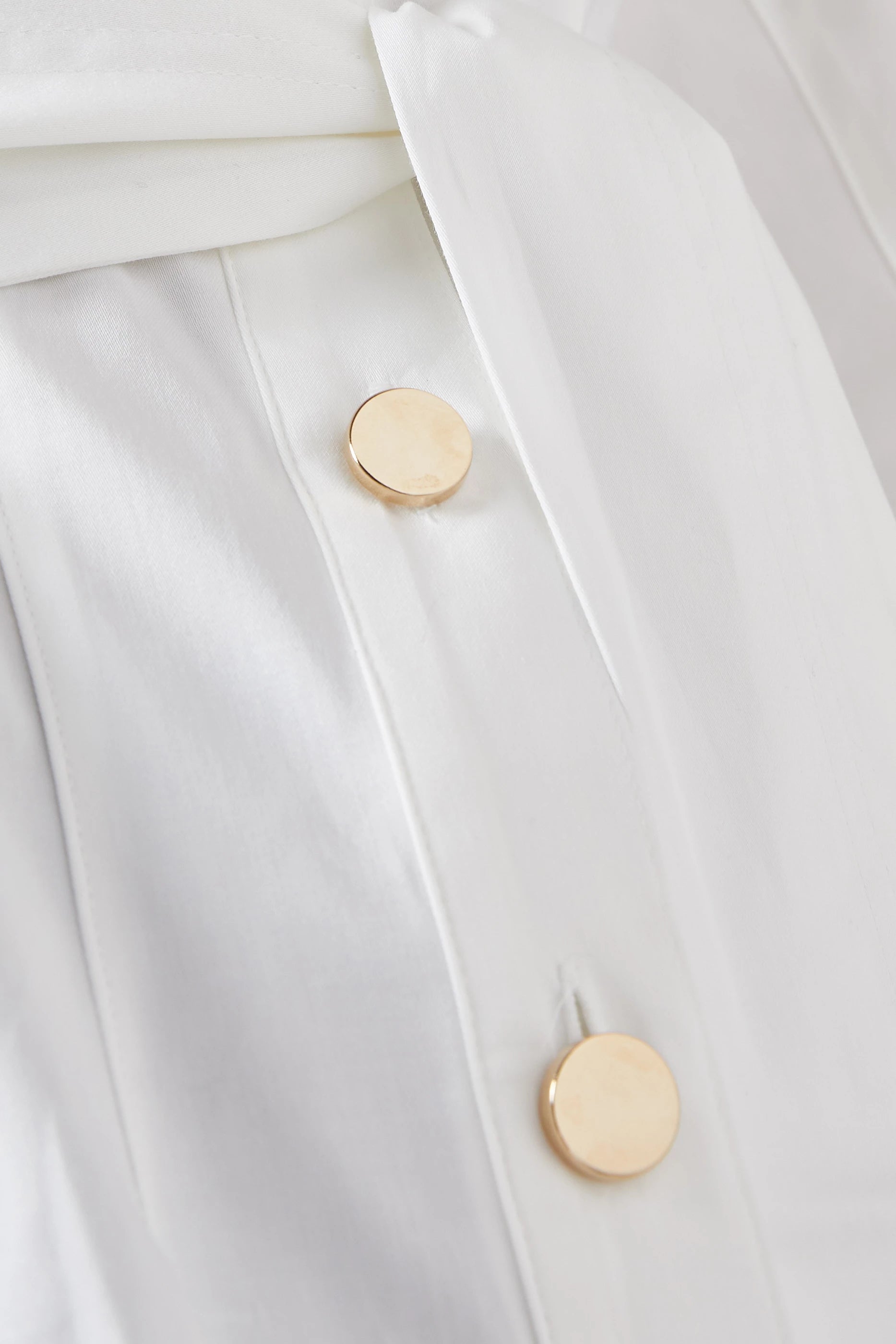 The Mina Seamed Tie-front Poplin Button Down by TOCCIN exudes refined elegance. Crafted from a cotton blend with 97% cotton and 3% elastane, this women's shirt offers comfort and subtle stretch. Featuring long raglan sleeves and a classic collar, its 24 3/4" length from the hips complements the flattering fit-and-flare silhouette. The button closure and tie-front detail enhance its sophisticated look, making it an ideal choice for spring evening occasions.