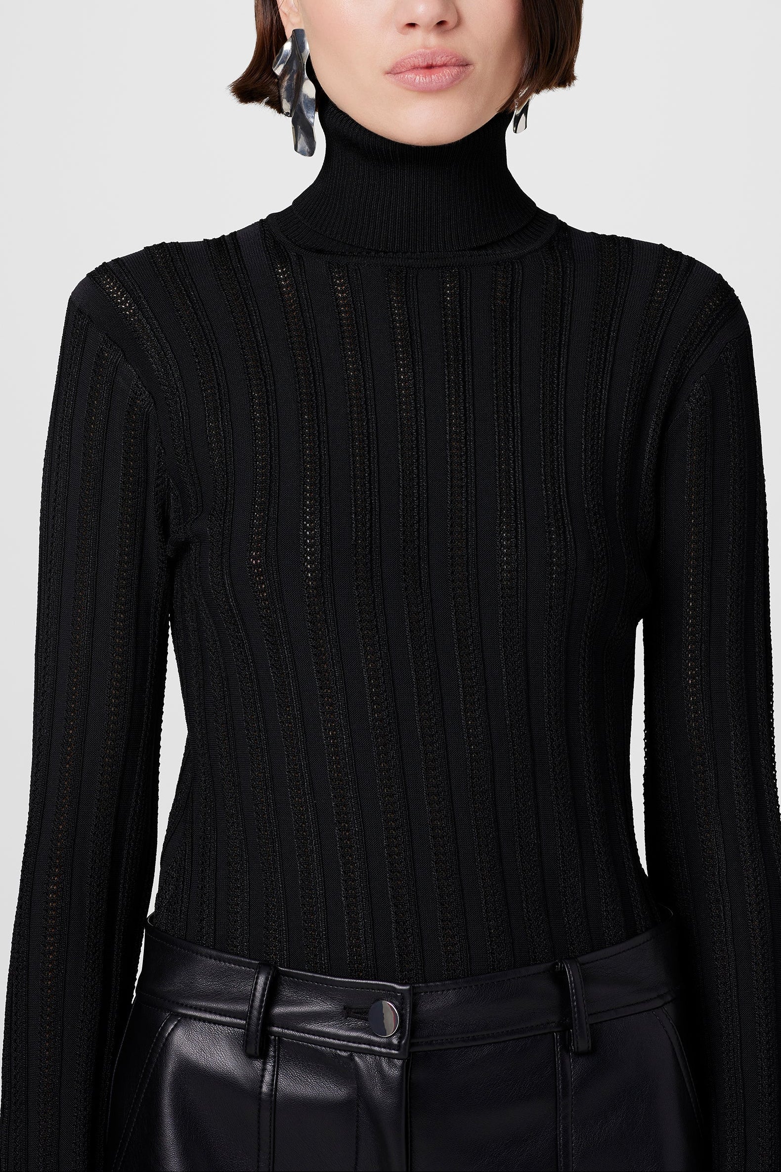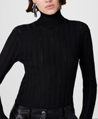 The Nancy Turtleneck Top features a sheer ribbed knit that contours smoothly to your body, creating a sleek, second-skin fit. Its delicate texture adds subtle sophistication, making it versatile to wear alone for a striking look or layered for a polished, contemporary style. This piece effortlessly blends modern elegance with understated detail, perfect for elevating any wardrobe.