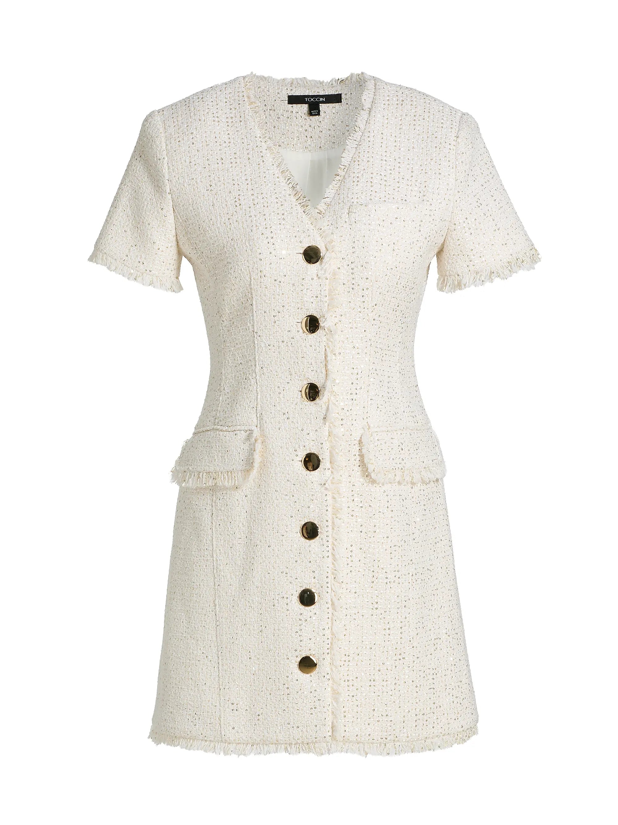Toccin's Phoebe short-sleeve minidress showcases masterful construction through its wool-blend tweed foundation, delivering both visual richness and tactile quality. The garment's fringe detailing provides textural dimension and graceful movement, while metallic sequin embellishments introduce a refined luminosity to the design that demonstrates discerning taste and attention to sartorial detail.