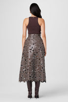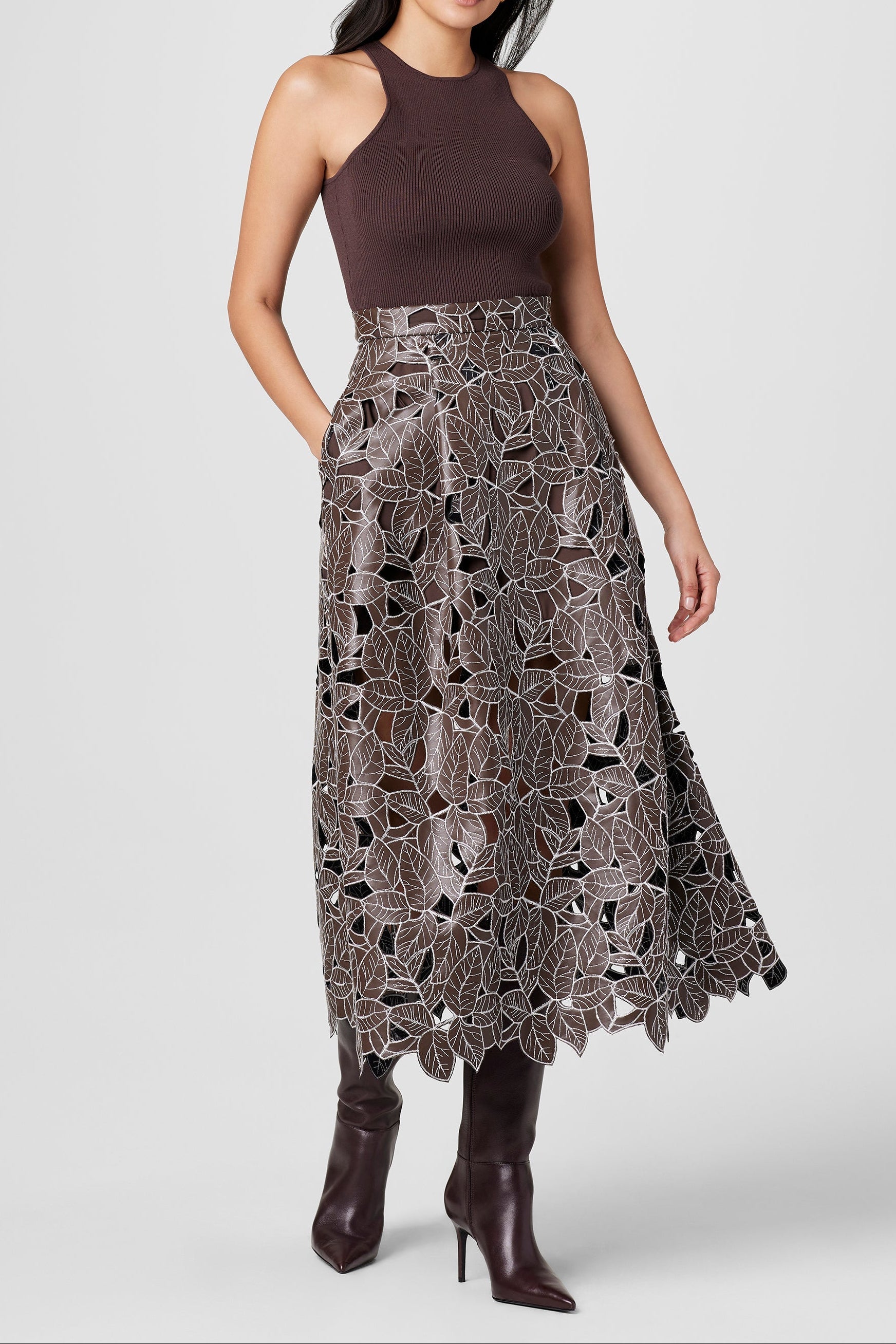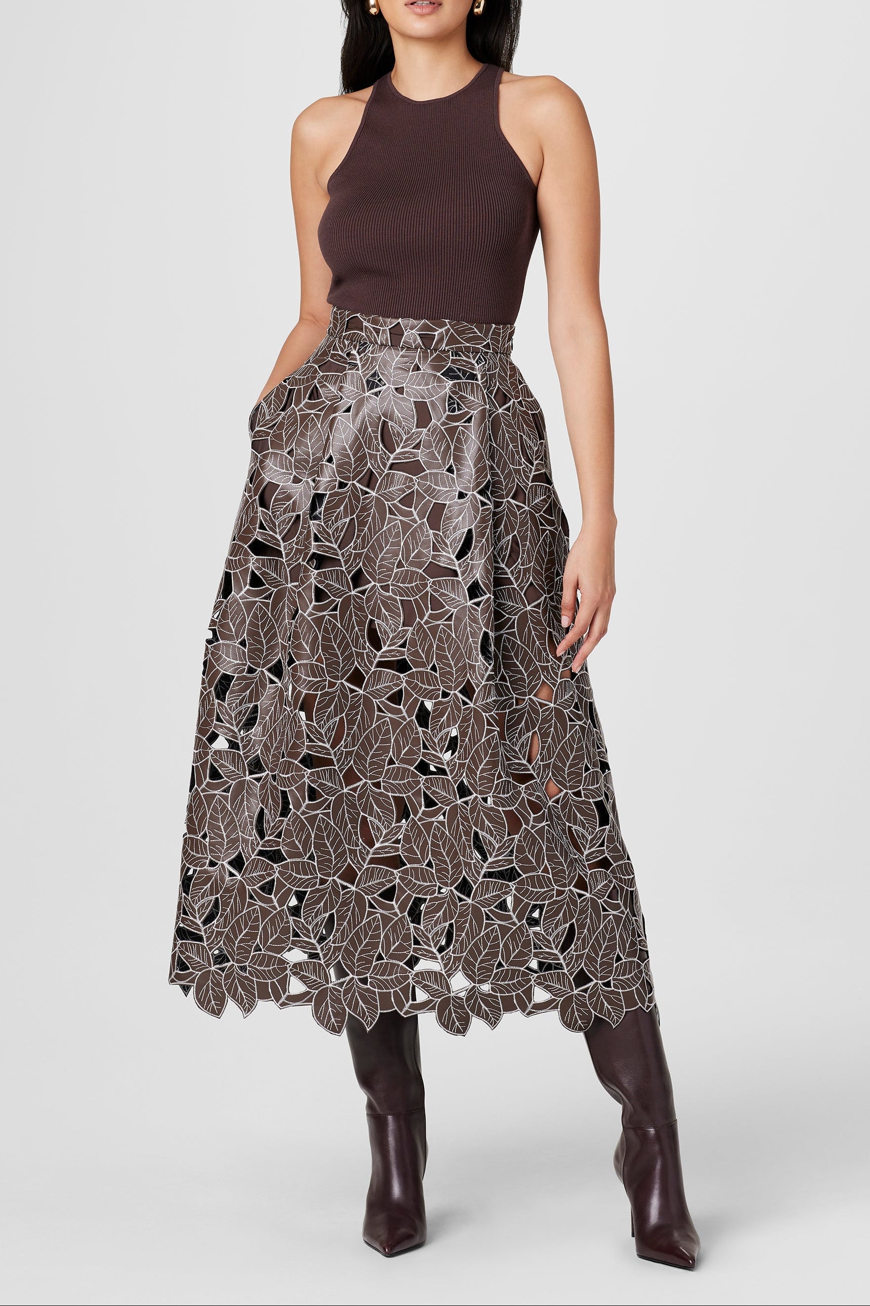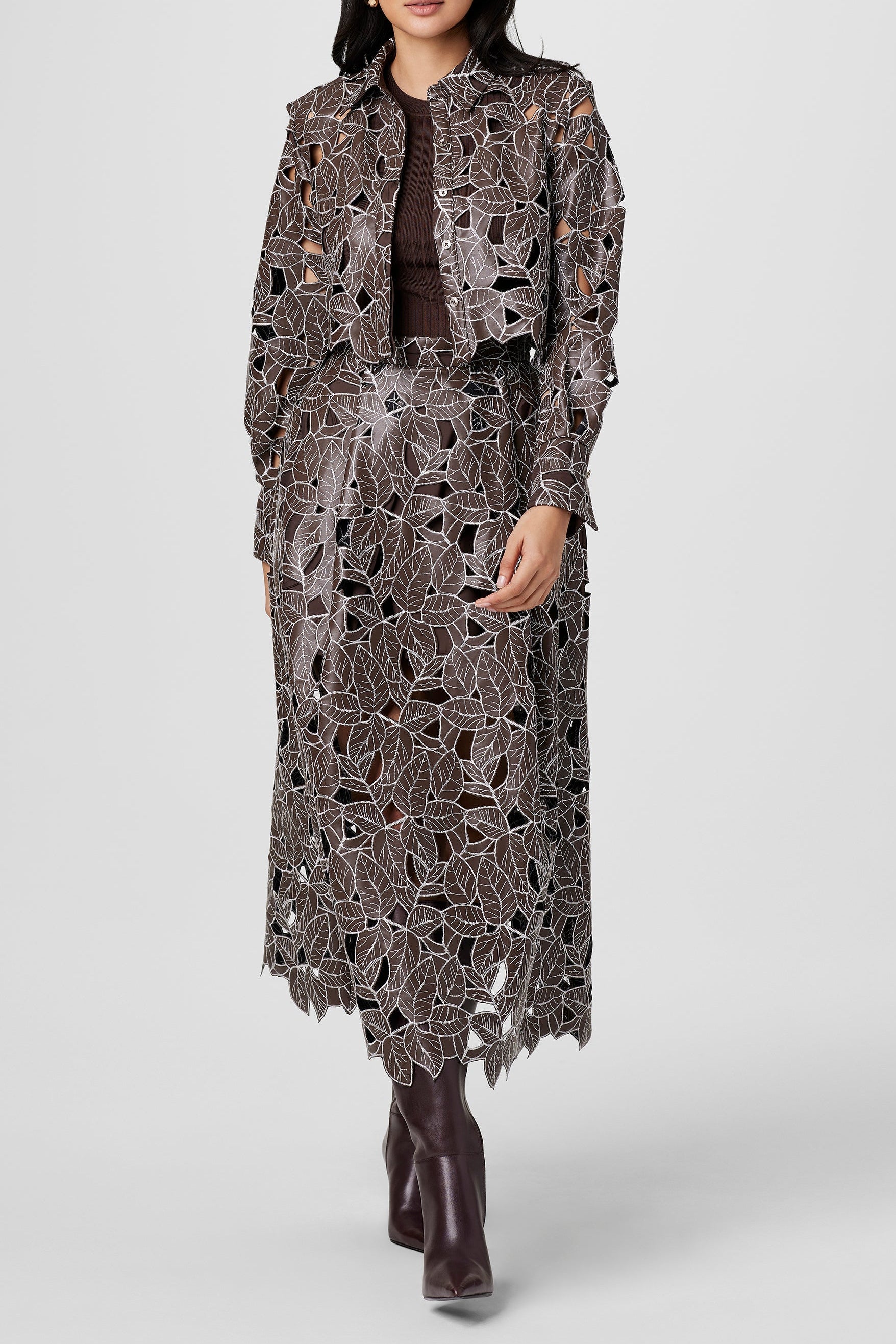 The Stacy Lace Skirt in Espresso/Ivory is an expertly crafted midi skirt perfect for fall. Made from soft vegan leather with detailed embroidery, it introduces a luxurious texture to your wardrobe. The exclusive lace pattern enhances the skirt’s volume, allowing it to drape elegantly away from the body for a flattering fit.