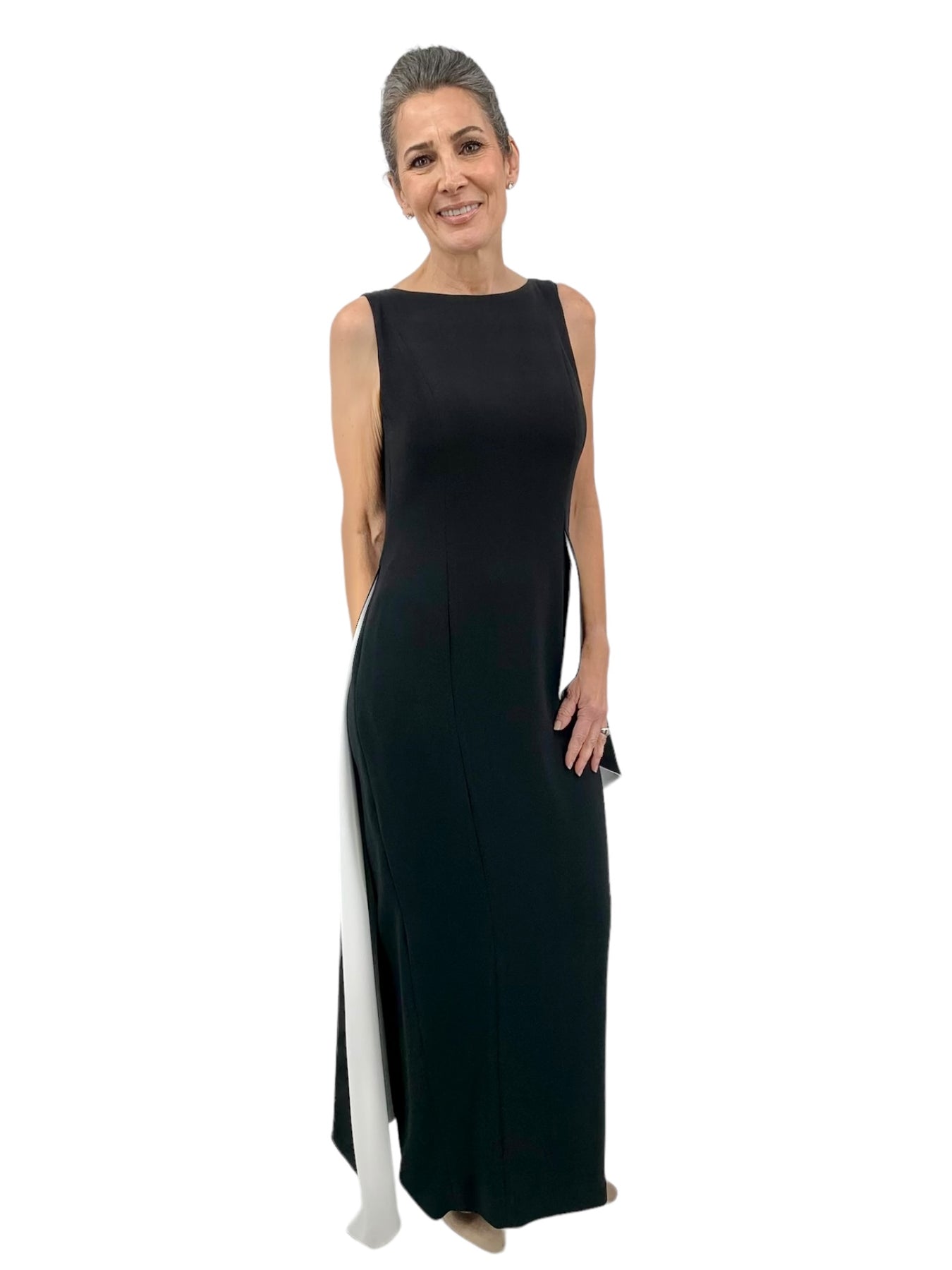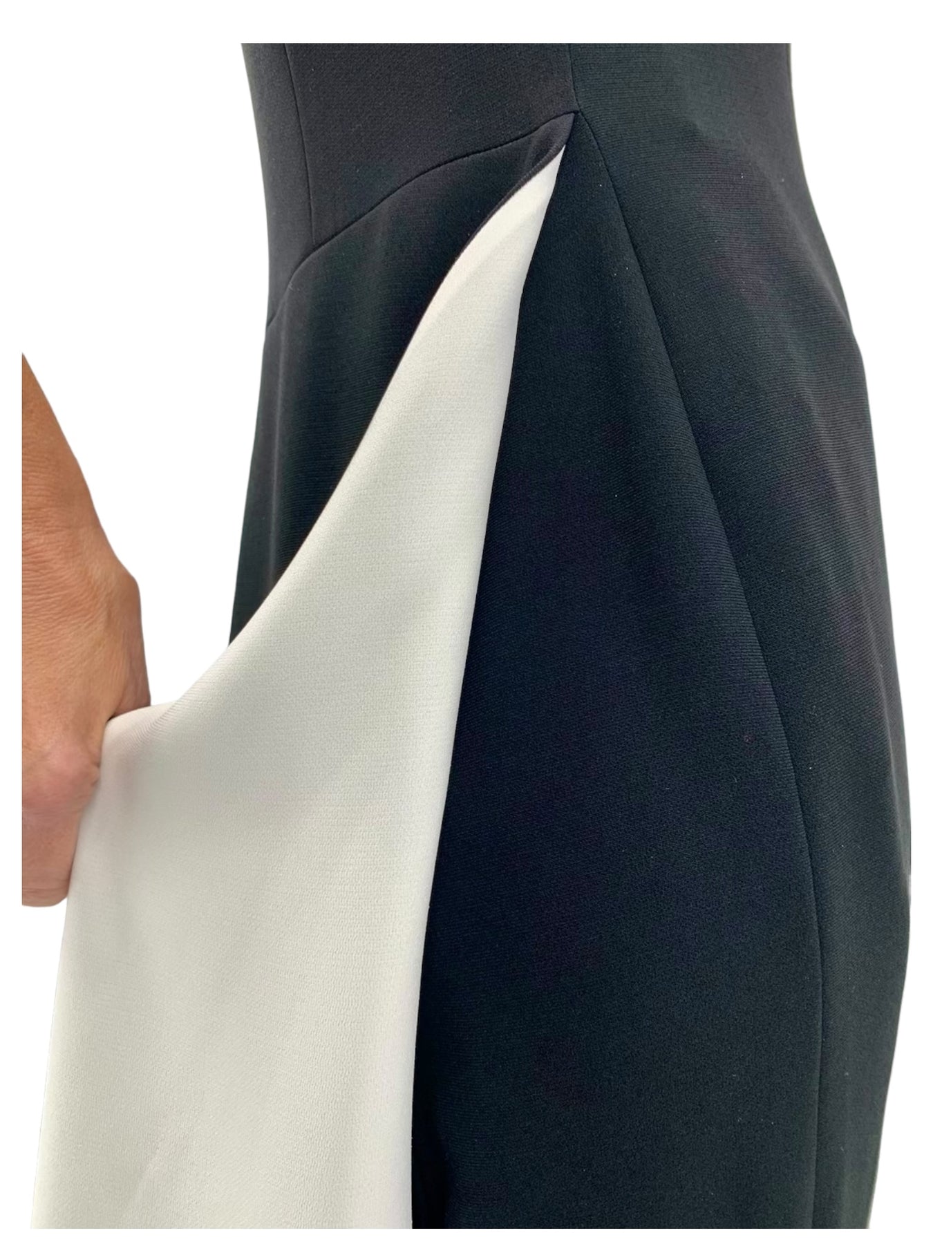 Step into timeless elegance with Matte Crepe Demi Peplum Gown in Black/White. This stunning gown features a flattering peplum waist and a chic colorblock design. Made with high-quality materials for a confident and sophisticated look.