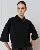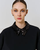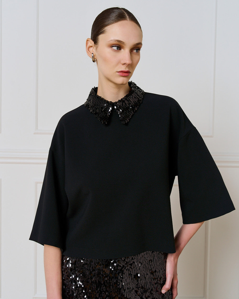 This black blouse features 3/4 wide sleeves that offer an elegant silhouette with added comfort. The detachable sequin collar introduces a refined sparkle, making it perfect for sophisticated occasions or elevating everyday style. Its versatile design allows you to adapt your look effortlessly while maintaining a polished appearance.