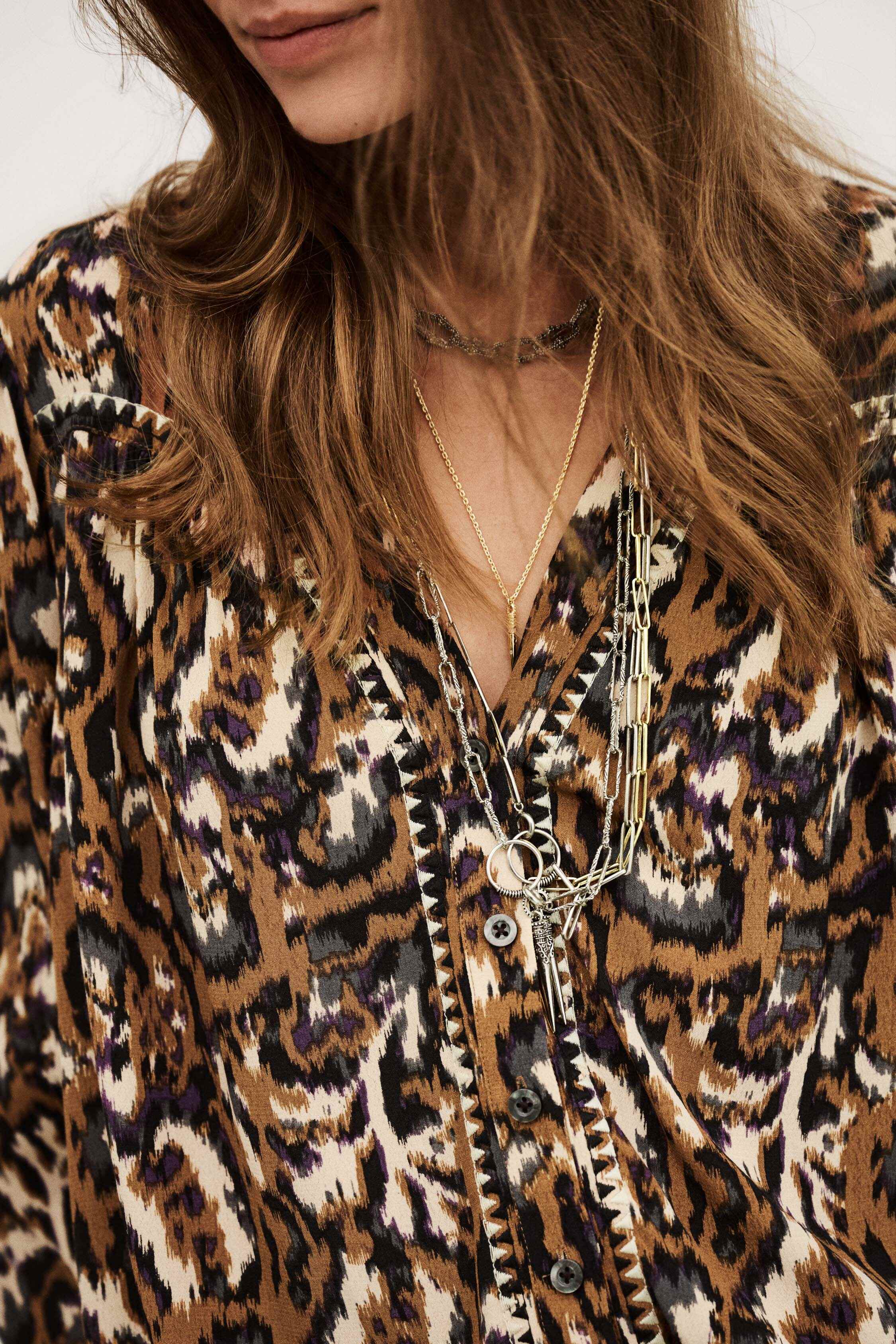 The Onada Top in Ocre by ba&sh exudes sophistication with its long sleeves and elegant silhouette. Crafted from fluid viscose, it features an ethnic-inspired print and delicate embroidery along the shoulder and button placket, adding refined detail. Perfectly suited for workwear, dinner dates, or smart-casual occasions, it pairs effortlessly with classic black trousers or favorite denim, making it a versatile choice for autumn wardrobes.