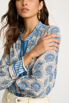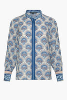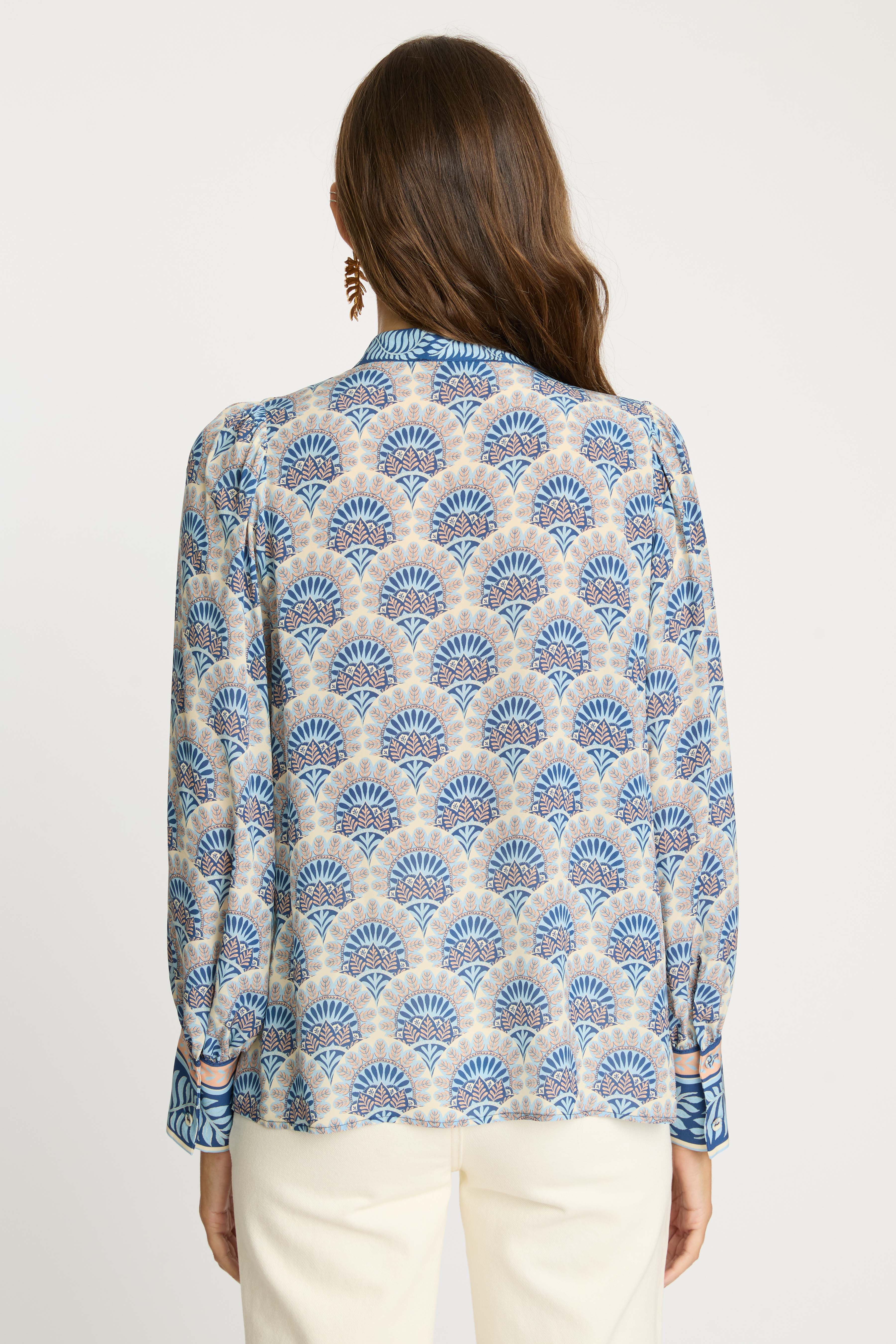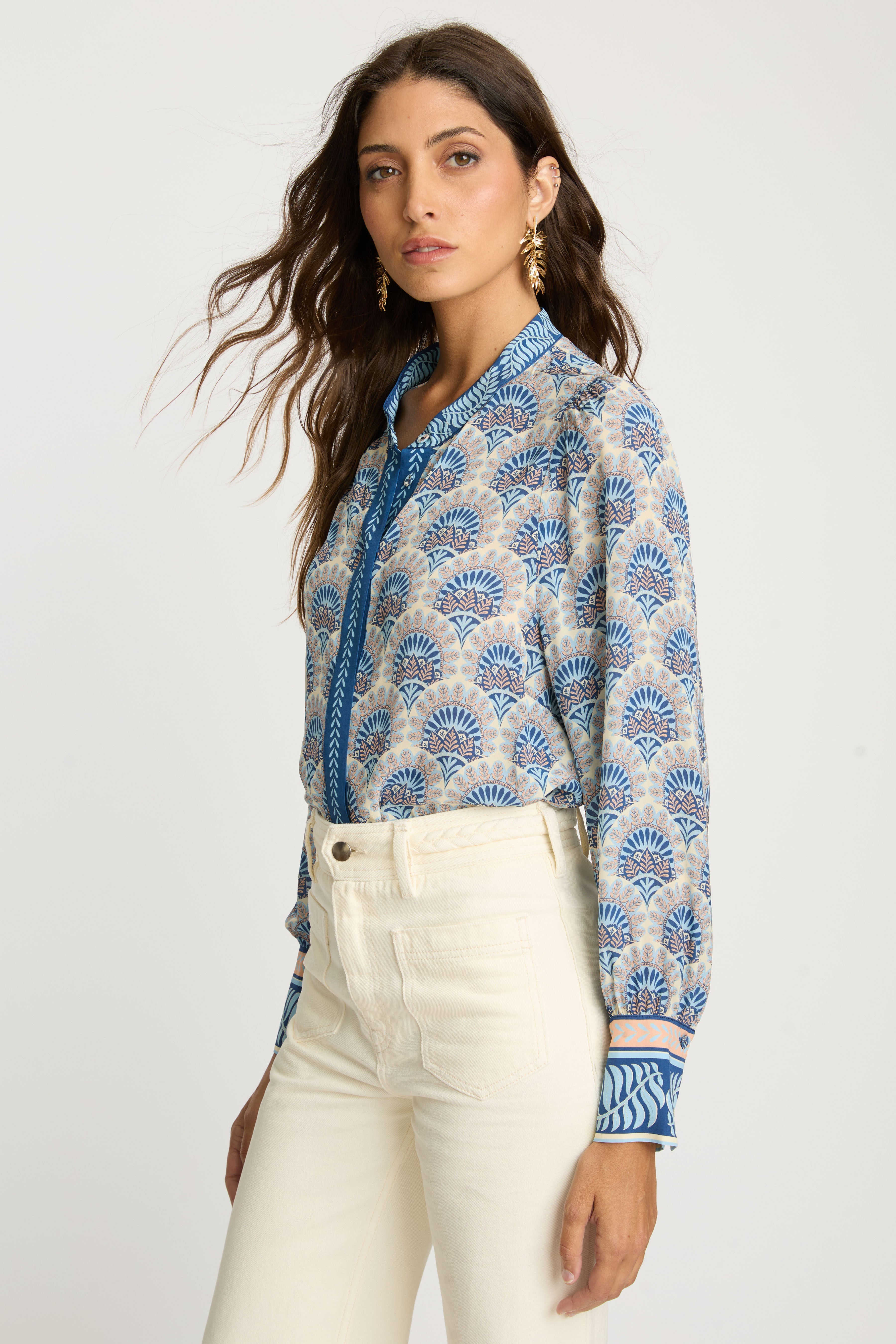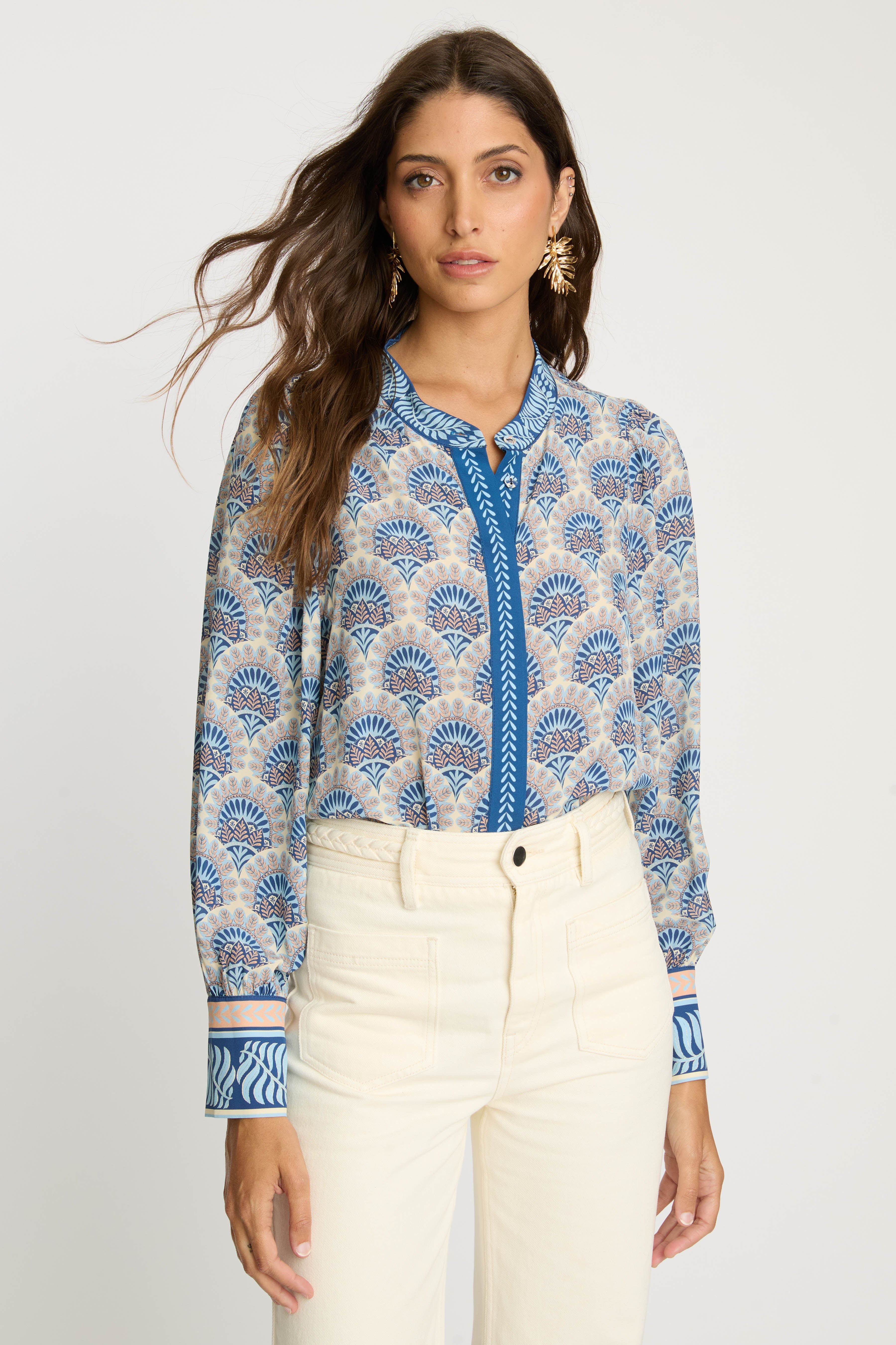 The Riley Top in Boho Deco print combines timeless sophistication with modern versatility. Featuring a refined mock collar and fitted silhouette, this blouse moves effortlessly from office to weekend wear. The design showcases an intricate geometric pattern that marries vintage aesthetics with contemporary style—rich blues and soft pastels create visual depth and interest. Perfect for layering or wearing solo, this piece elevates any wardrobe with understated polish and distinctive character.