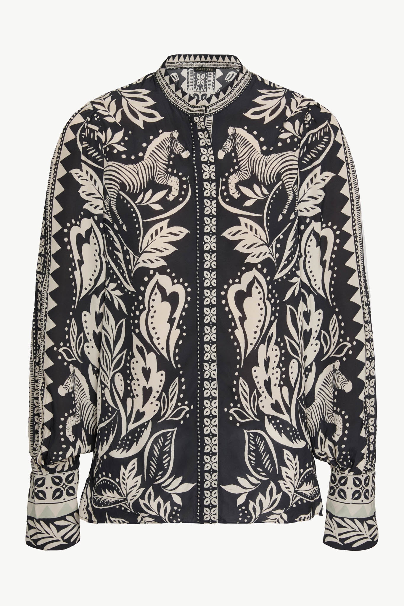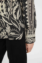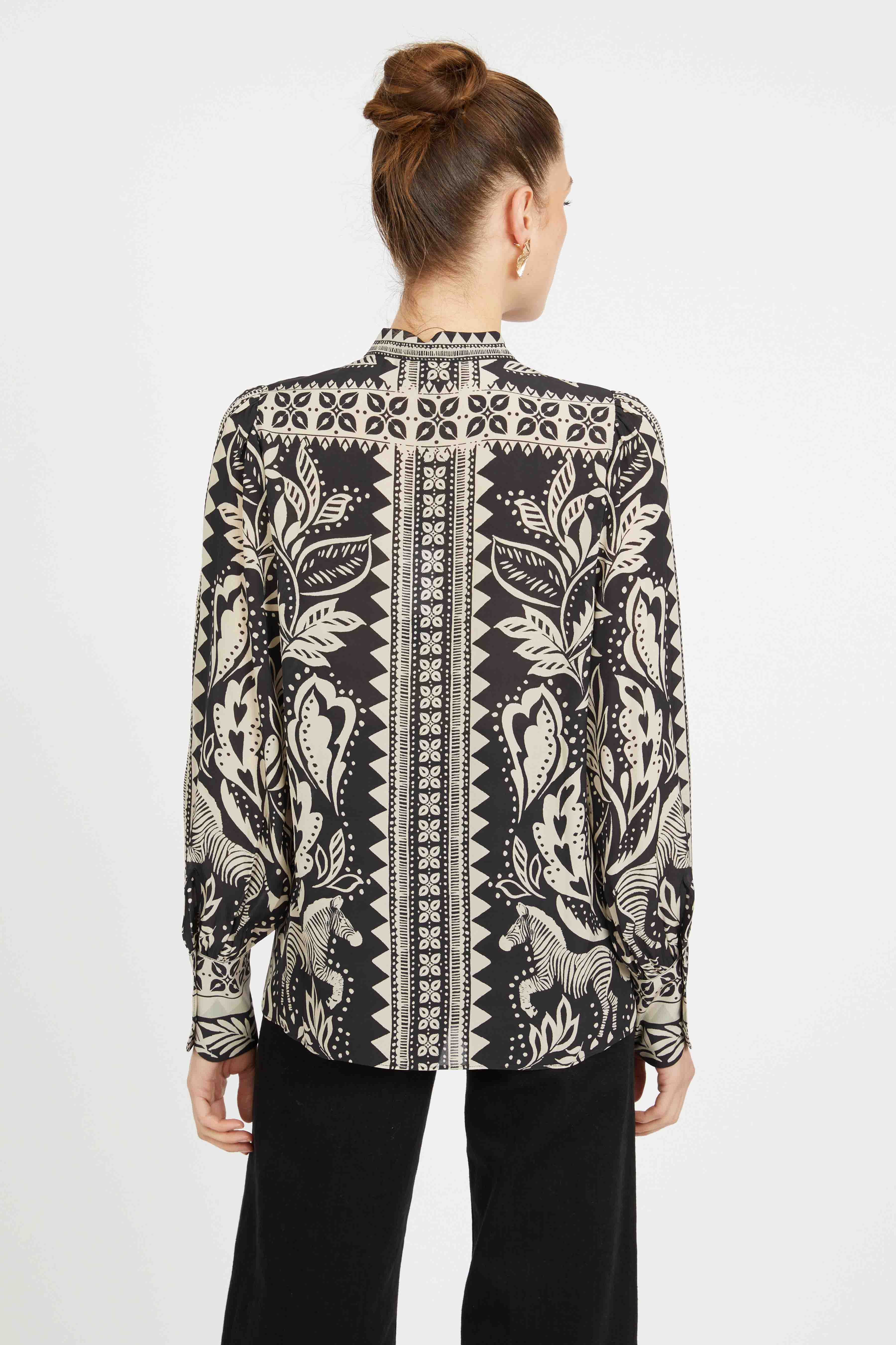 The Riley Top brings polished sophistication with contemporary edge. This refined blouse features a button-down placket, pleated sleeves, mock collar, and tailored cuffs for a structured silhouette. The exclusive Zebra Fern print showcases bold black-and-ivory contrast with stylized leaves, ferns, and zebra motifs that command attention. Versatile enough for the office yet striking enough for weekend wear, this statement piece elevates any wardrobe with effortless style.