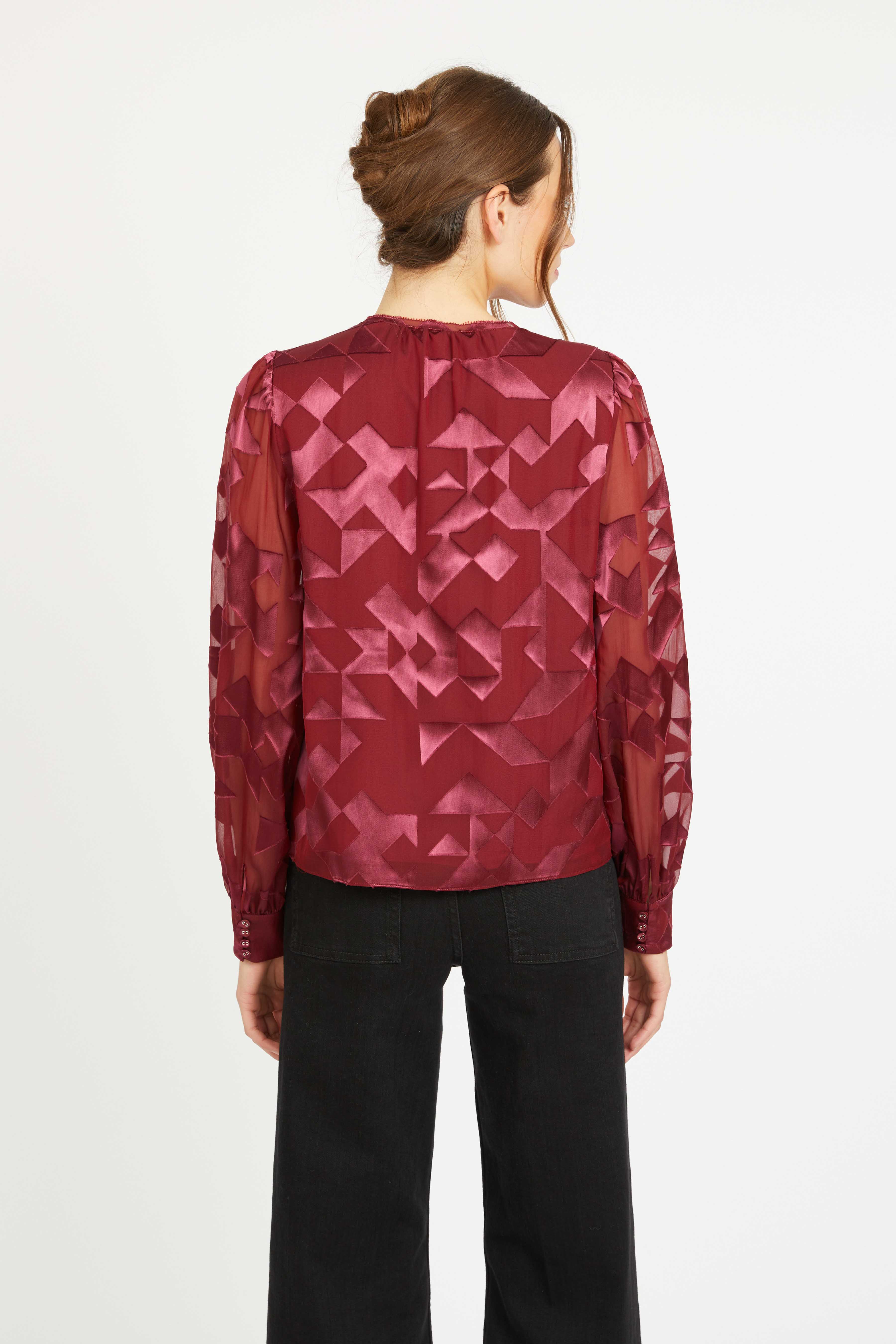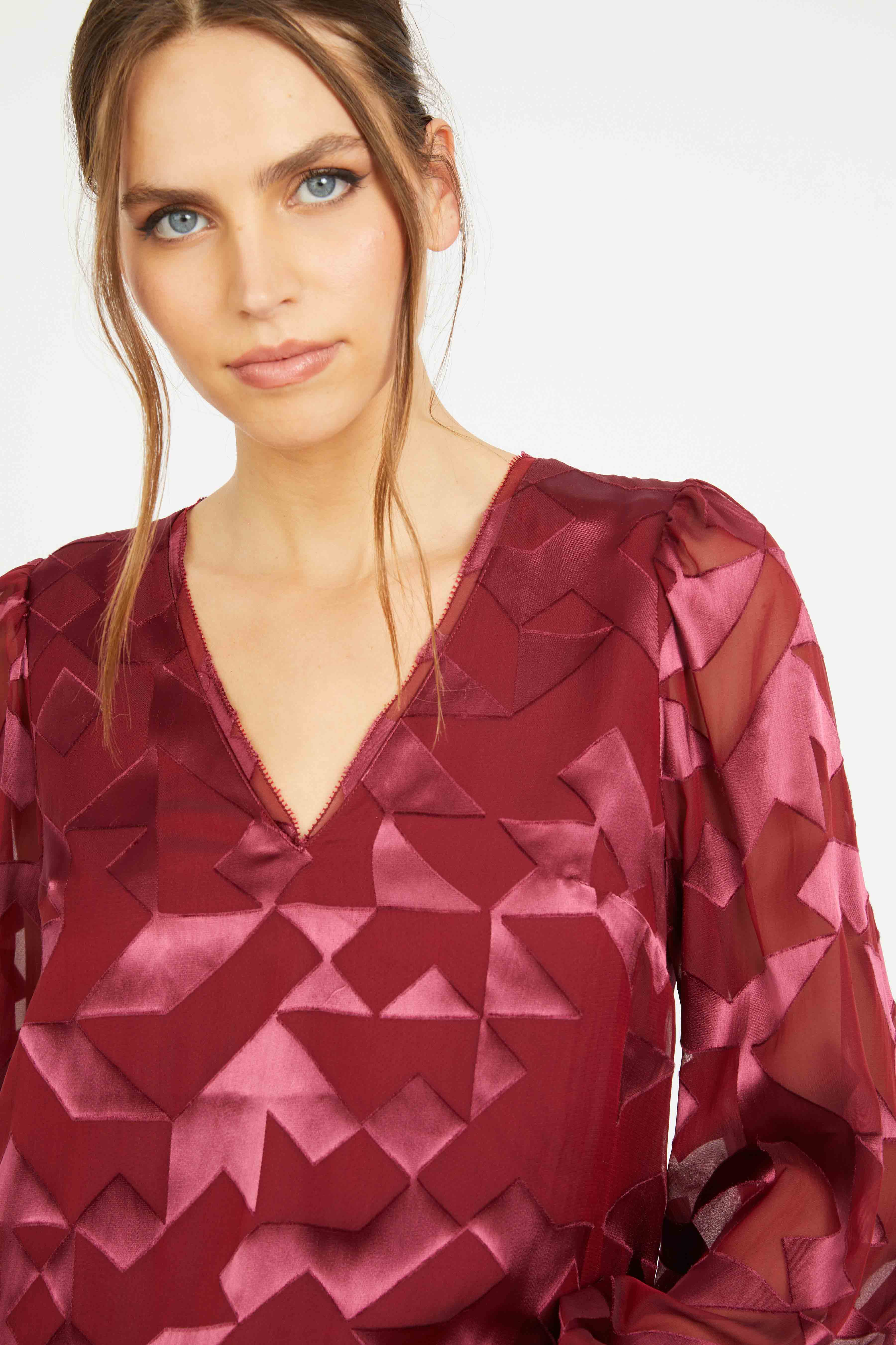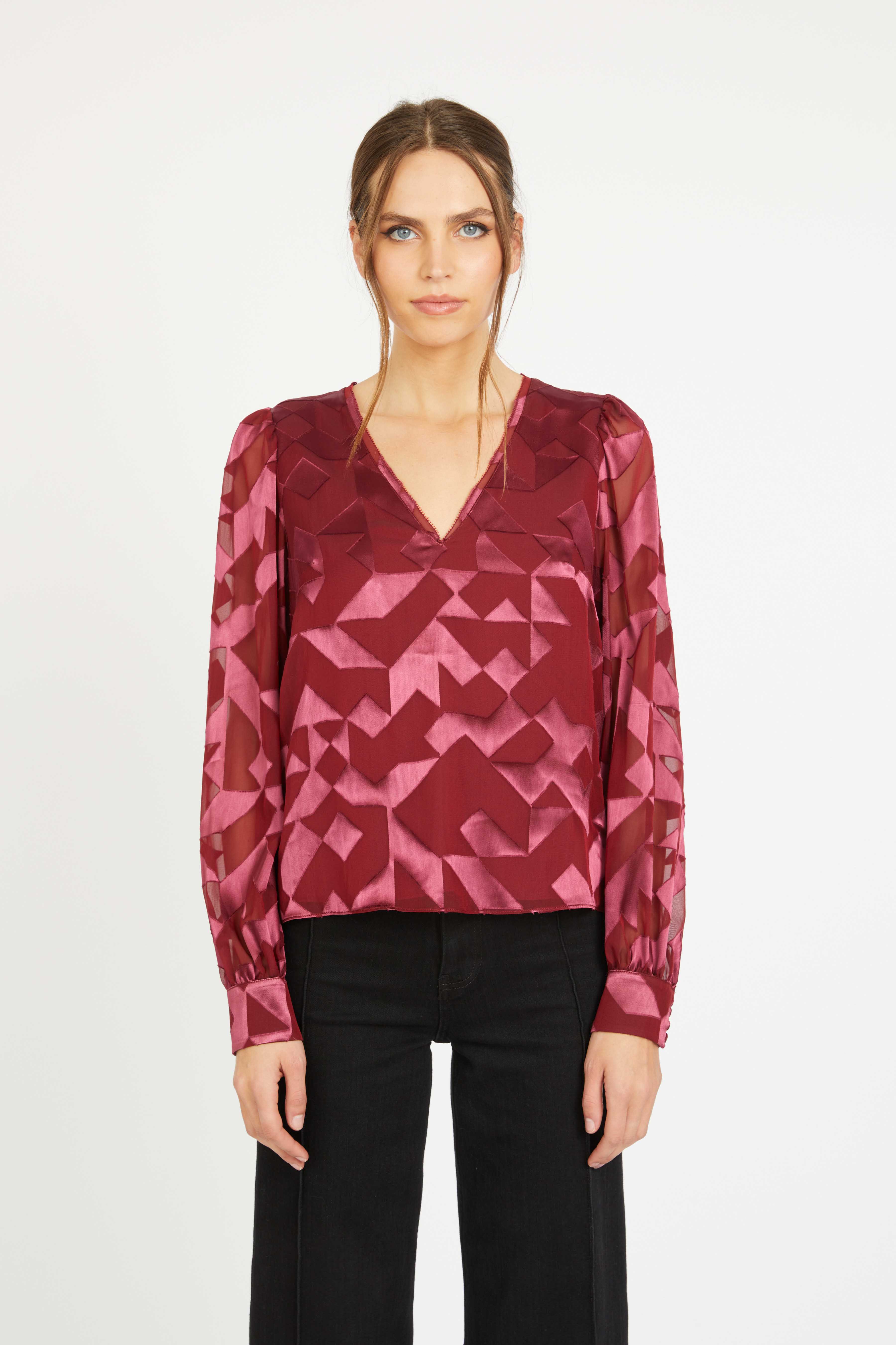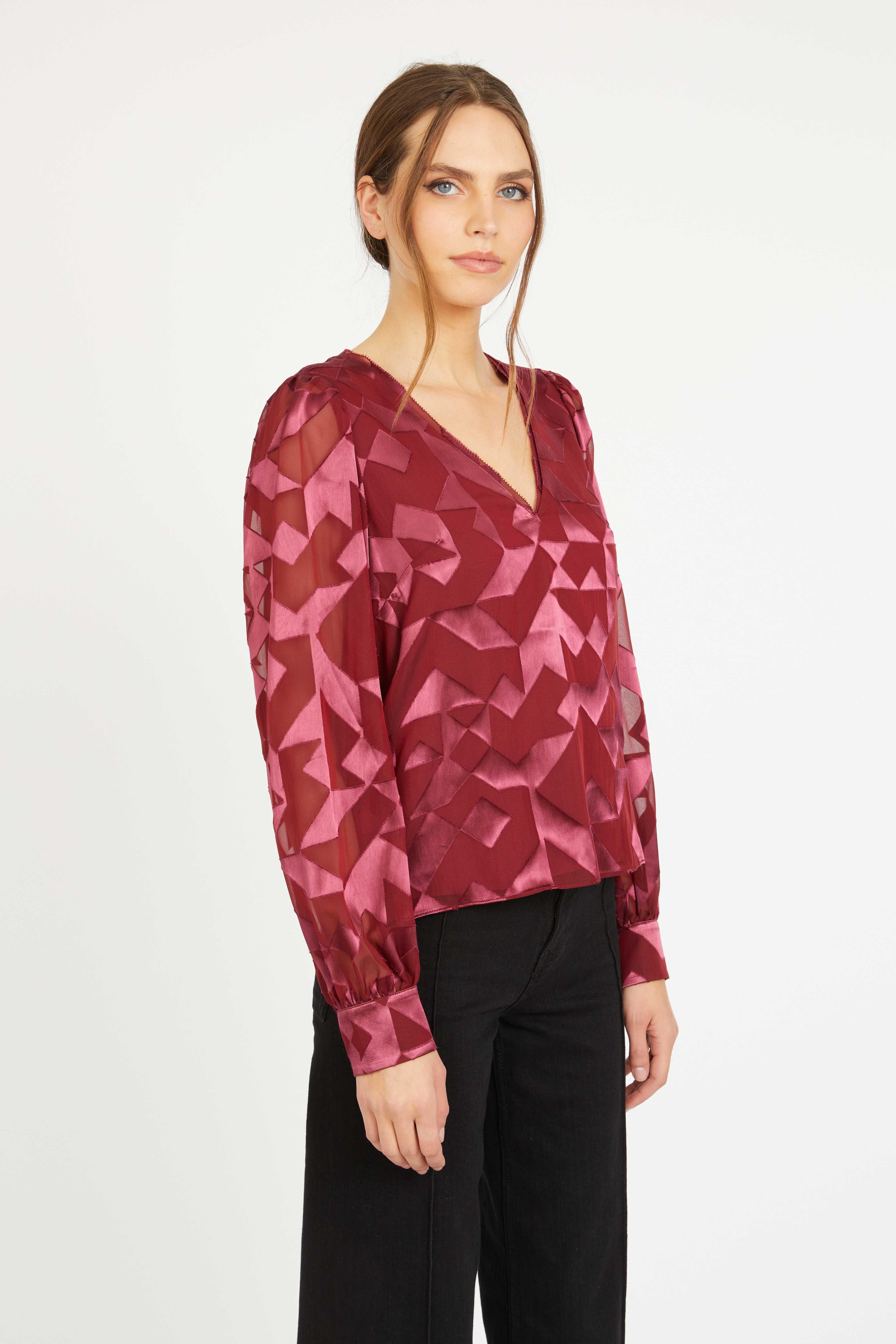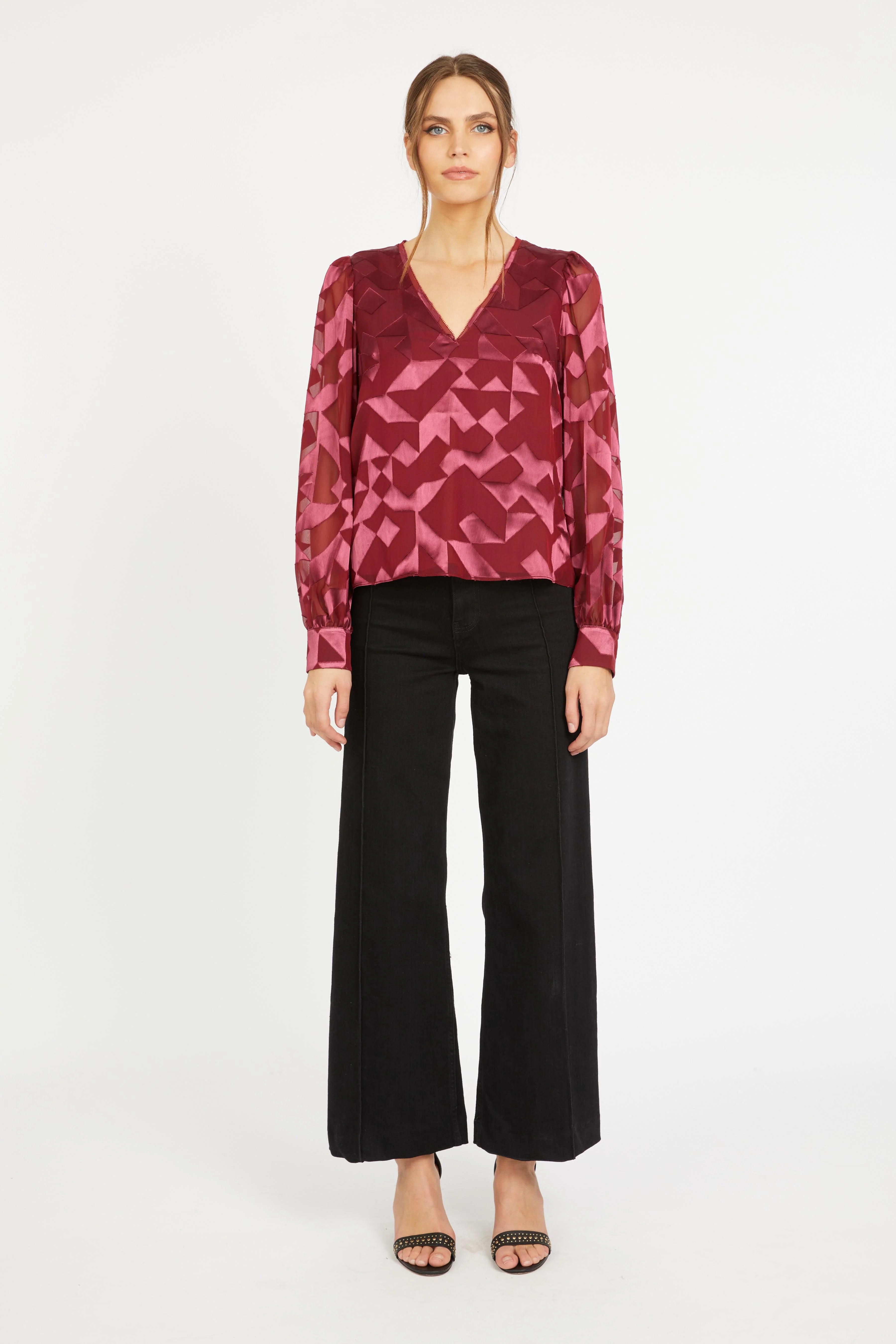 The Ruby Top features a fluid silhouette cut from a sumptuous viscose-silk blend, showcasing our striking Cabernet Geometric Burnout print. Softly gathered at the back for ease, it drapes beautifully through the body, while blouson sleeves with buttoned cuffs lend a touch of polish. A graceful V-neckline completes this effortlessly sophisticated look.