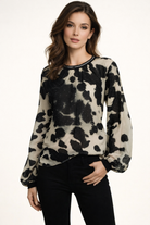 Turn heads in this striking black and cream sparkle blouse, designed to make a subtle yet unforgettable statement. Featuring a bold abstract print with delicate shimmer woven throughout, this lightweight top combines effortless elegance with modern edge. The sheer finish and softly gathered neckline create a flattering silhouette, while the long sleeves with fitted cuffs add a touch of refined drama.
