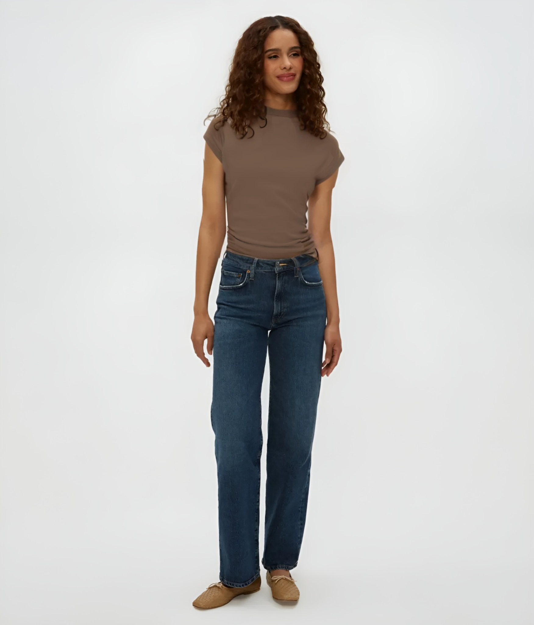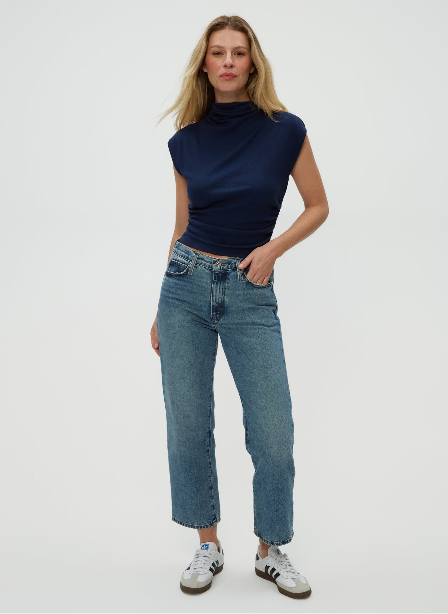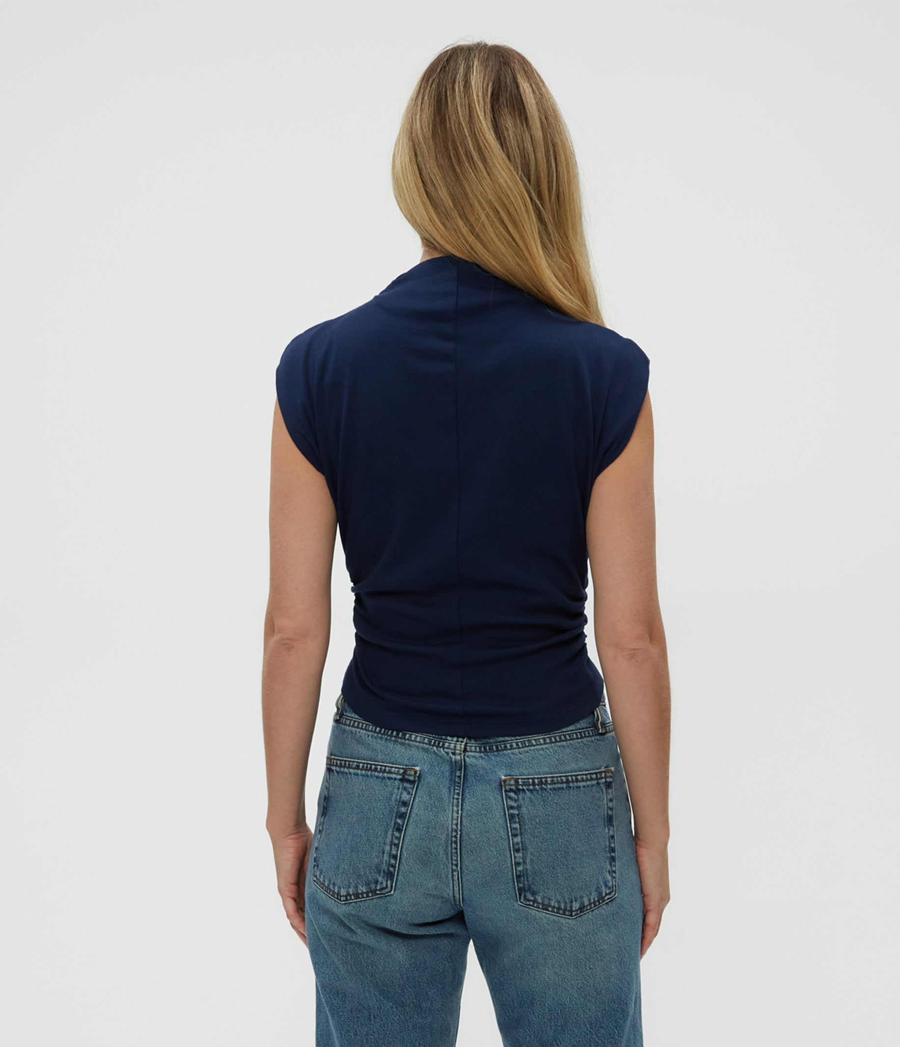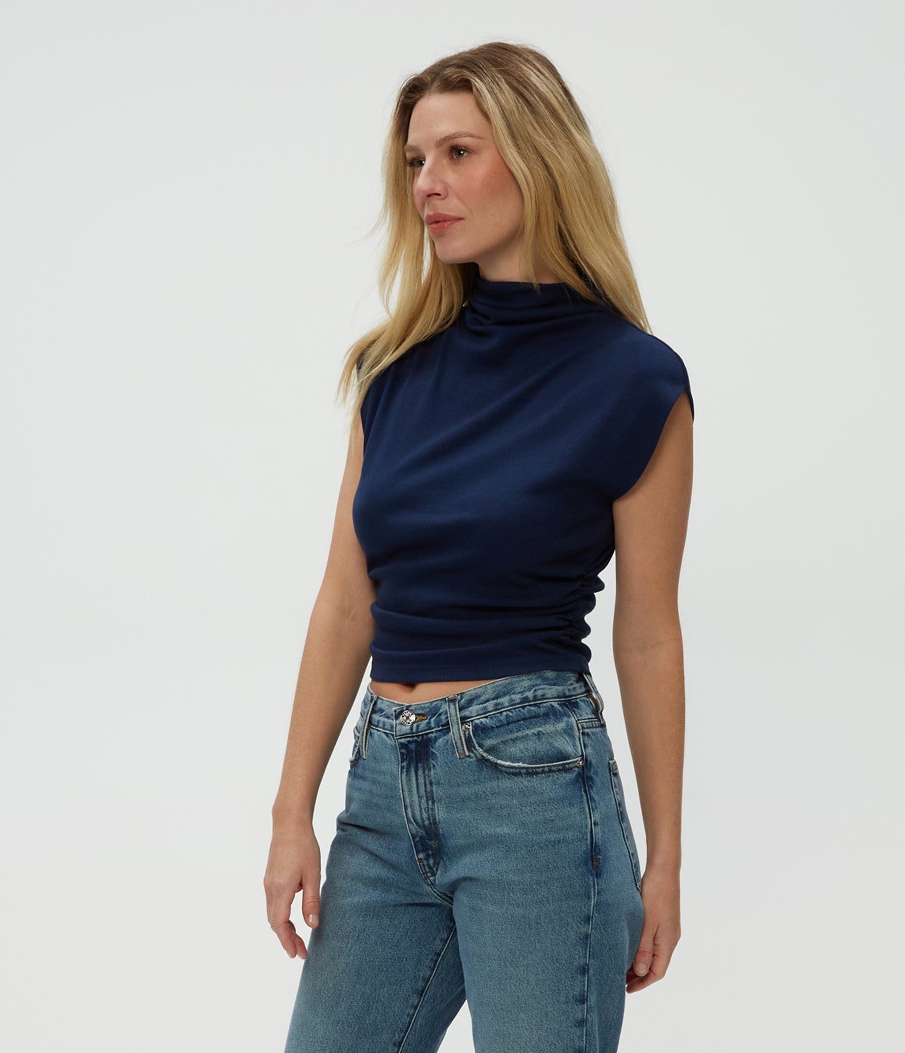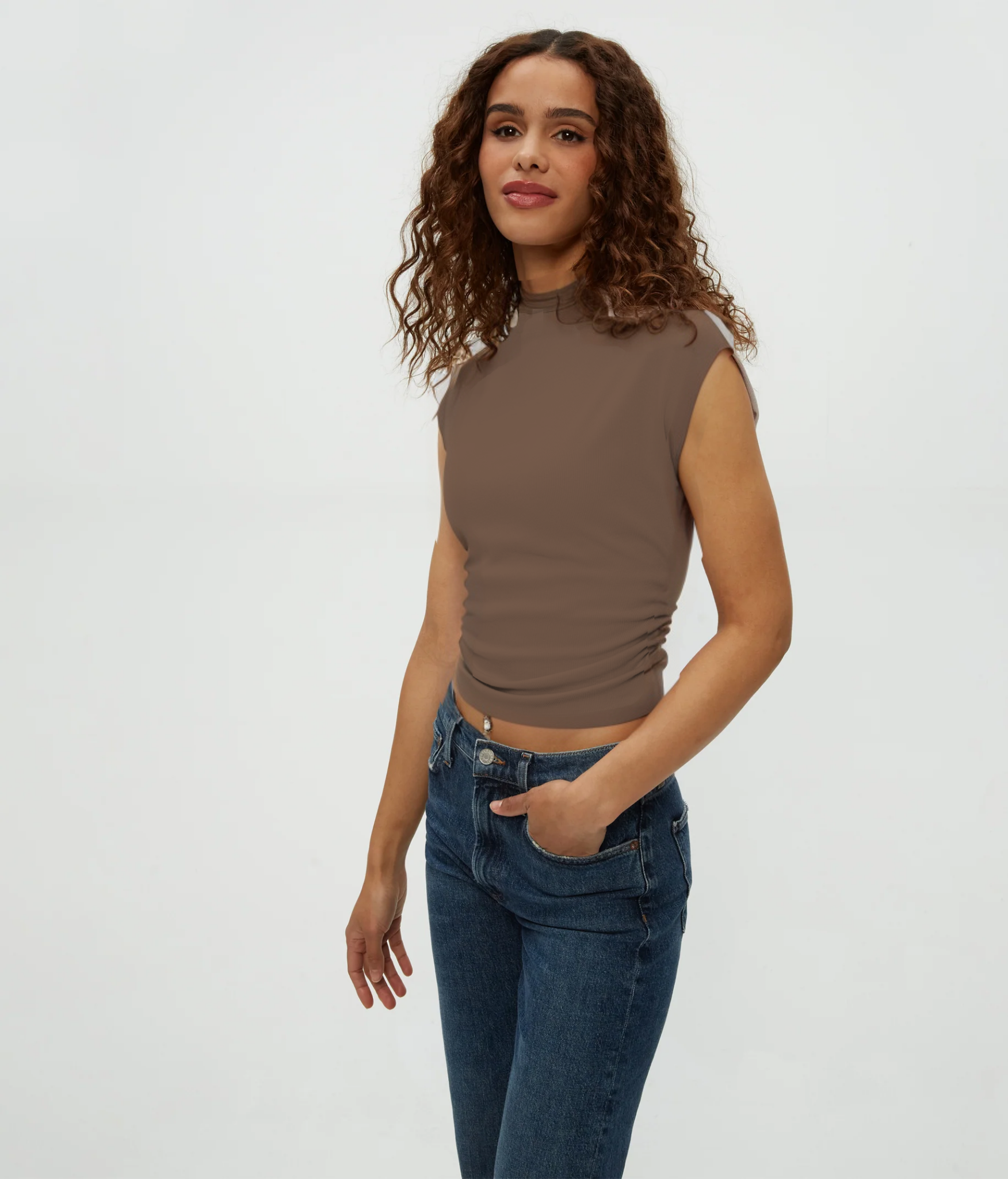 The Amara Mock Neck Power Shoulder Top combines sophisticated structure with versatile styling. Its power shoulders and mock neck create a polished silhouette, while strategic side ruching enhances your natural shape. Crafted from our premium Ultra Rib fabric, this cropped piece maintains its form throughout wear and withstands repeated washing.