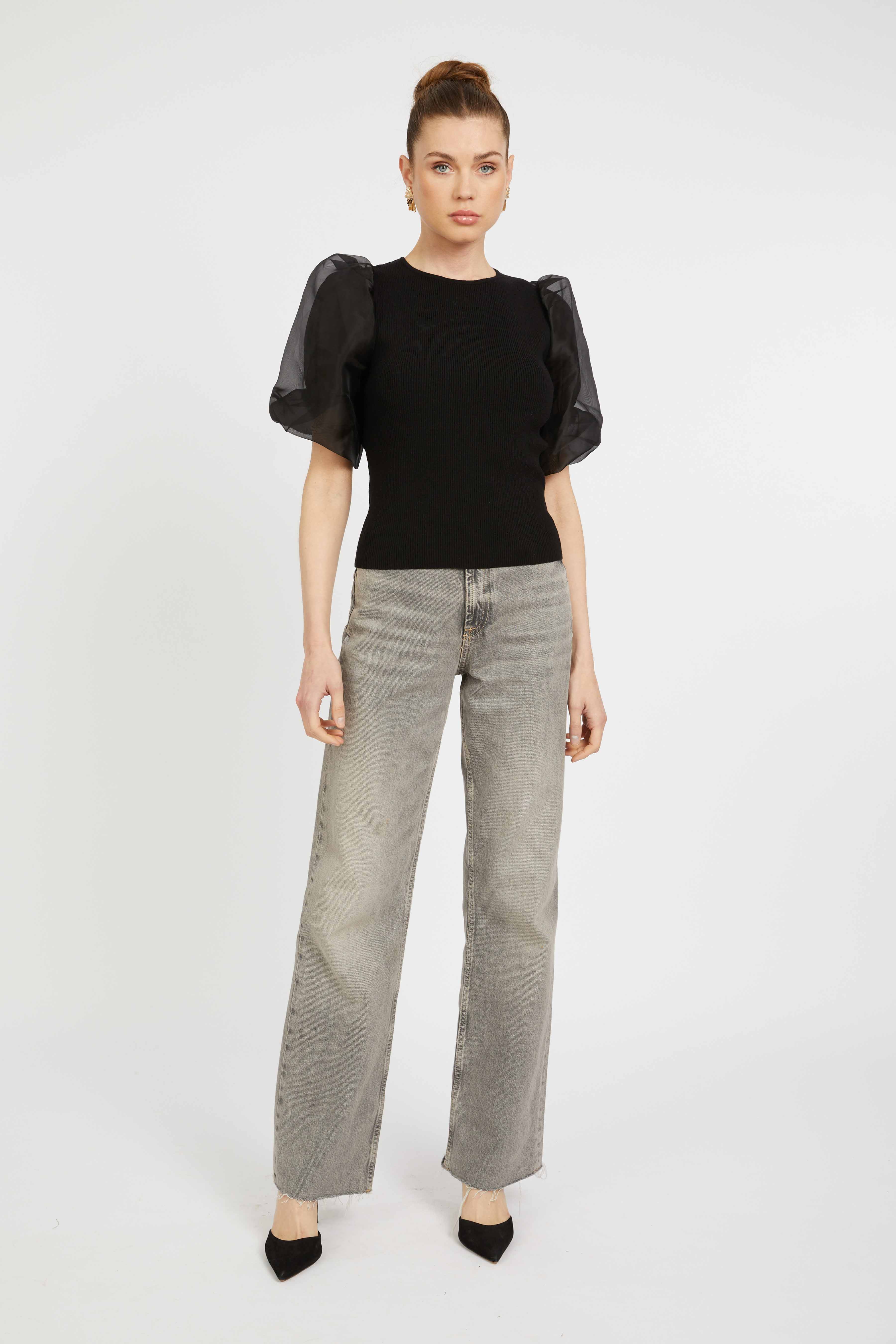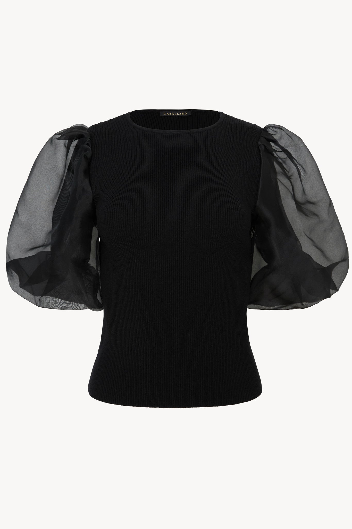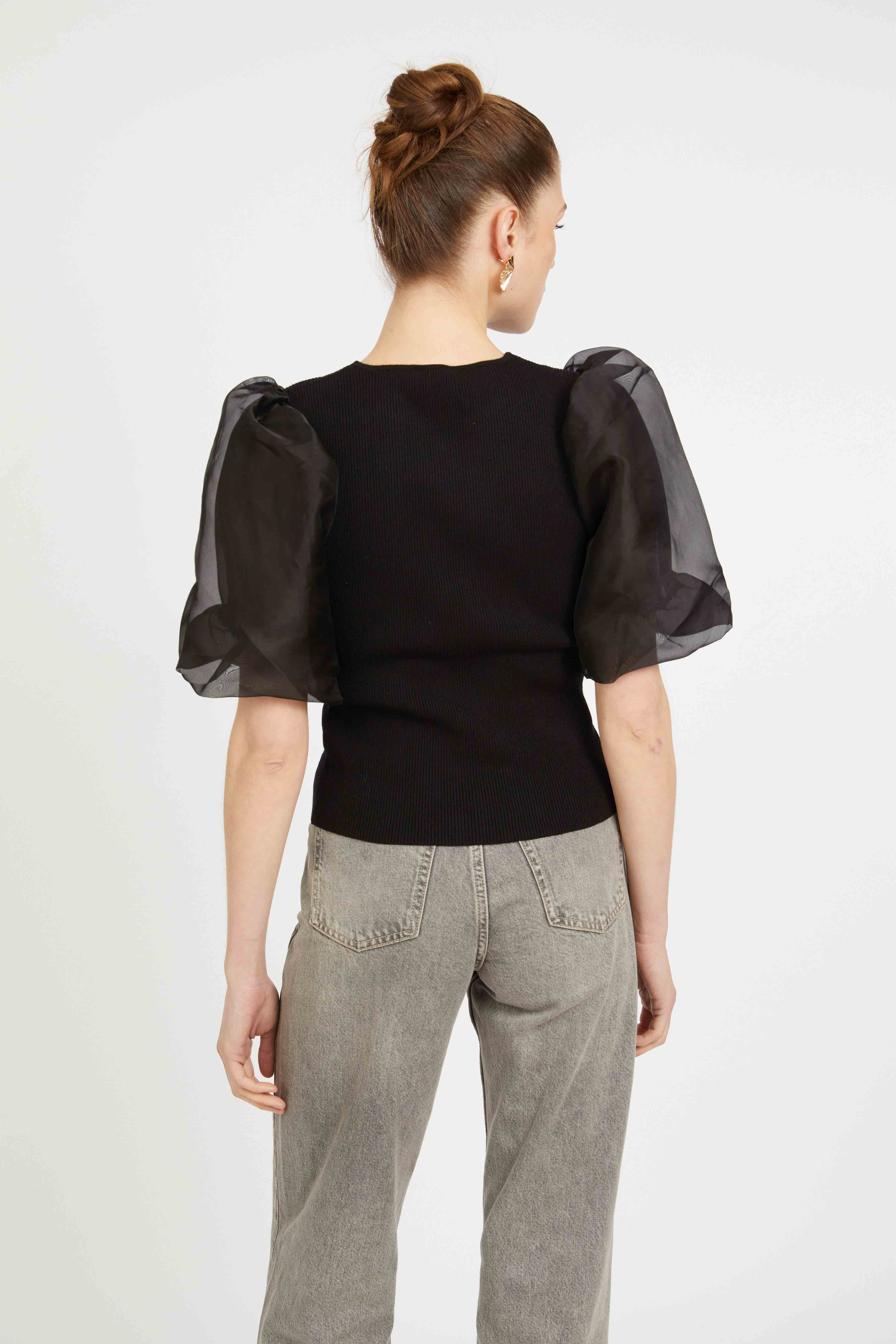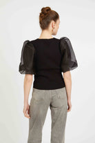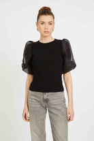The Alina Top refines the classic Andrea Top with a rounded neckline that softens its profile. Its signature organza puff sleeves introduce volume and delicate texture, bringing a subtle romantic flair. Crafted from a knit fabric, the body contours comfortably for a flattering silhouette without compromising ease. This sophisticated blend of structure and comfort makes the Alina Top a polished, versatile piece suitable for various occasions.