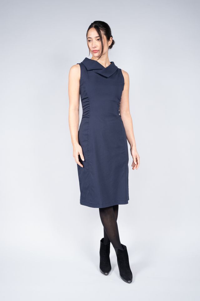 The Arcadia Dress by Porto combines refined design with comfortable fit, featuring a striking asymmetrical collar and flattering side seams that create elegant ruching. Crafted from stretch twill fabric, it offers ease of movement while maintaining a sleek silhouette. Ideal for both professional and social settings, this dress effortlessly enhances your wardrobe with timeless sophistication.