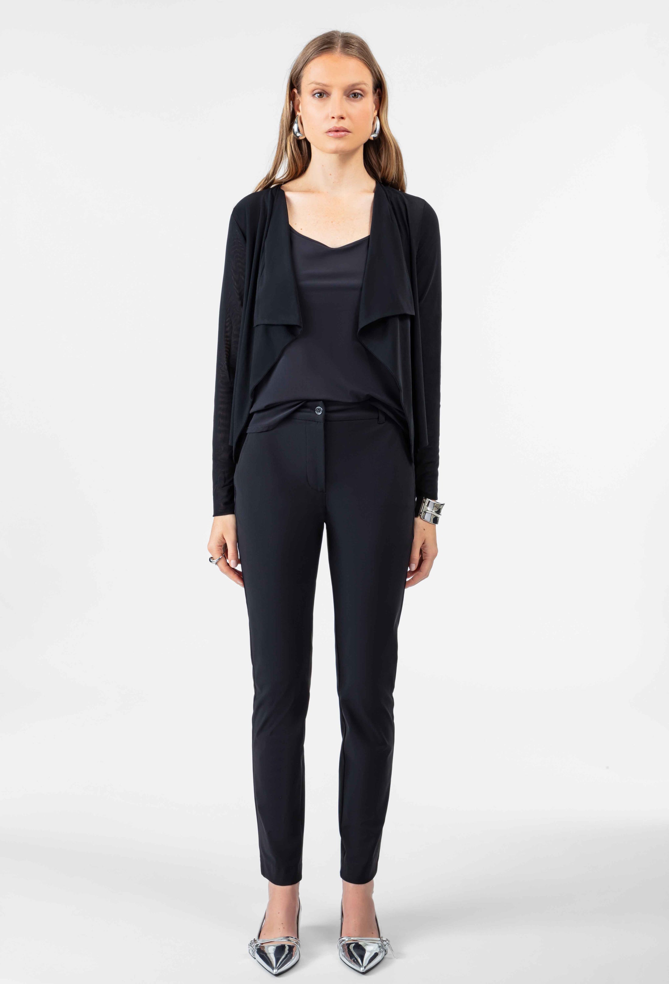 The Aurora Bolero brings contemporary elegance with its striking sheer mesh construction and bold lapel collar. This lightweight black vest layers effortlessly over any outfit, adding a touch of modern sophistication. The transparent fabric creates visual interest while maintaining a refined silhouette, making it the perfect piece for elevating both casual and dressed-up looks.