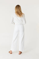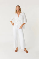 The Camille Exposed Button Wide Leg pant combines sophisticated design with practical comfort. The midrise silhouette features an exposed button fly that adds visual interest while maintaining a clean line. Functional pork chop pockets enhance the classic aesthetic, while the ankle-length cut offers versatility for various styling options. The wide-leg construction provides both movement and a contemporary silhouette, making these pants an essential addition to any curated wardrobe.